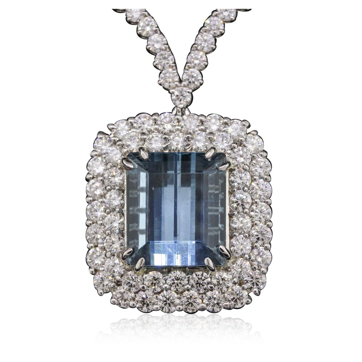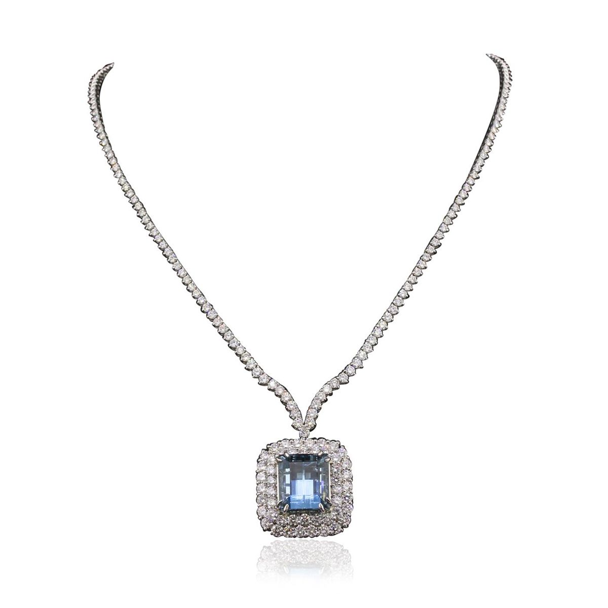 One electronically tested 18KT white gold Ladies combination cast & assembled pendant & chain 16.8 inch long, medium with a hidden box clasp with a bright polish finish. Condition is new. Identified with markings of "750". Containing: One prong set emerald standard step cut natural aquamarine, measuring 15.03 x 13.17 x 11.04mm, exact weight 16.60ct., clarity is eye clean, type I, medium light, very slightly grayish, blue color, (GIA B 4/3), cut is very good. GIA Report: 2151964329. Ninety-Five prong set round brilliant cut diamonds, measuring 2.60 - 2.60 x 1.56mm (depth est.) approximate. Total Weight of 95 Stones = 6.11ct. . Clarity: I-1 to I-2. Color: I - J, Cut is Good. Forty-Eight prong set round brilliant cut diamonds, measuring 3.00 - 3.00 x 1.80mm (depth est.) approximate. Total Weight of 48 Stones = 4.74ct. . Clarity: SI-1 to SI-2. Color: J - K, Cut is Good. Total Weight of Colored Stones 16.60ct. Total Weight of Diamonds 10.85ct. Total Weight of Pendant & Chain 32.50 grams. GGL Appraised at $53,625.00.