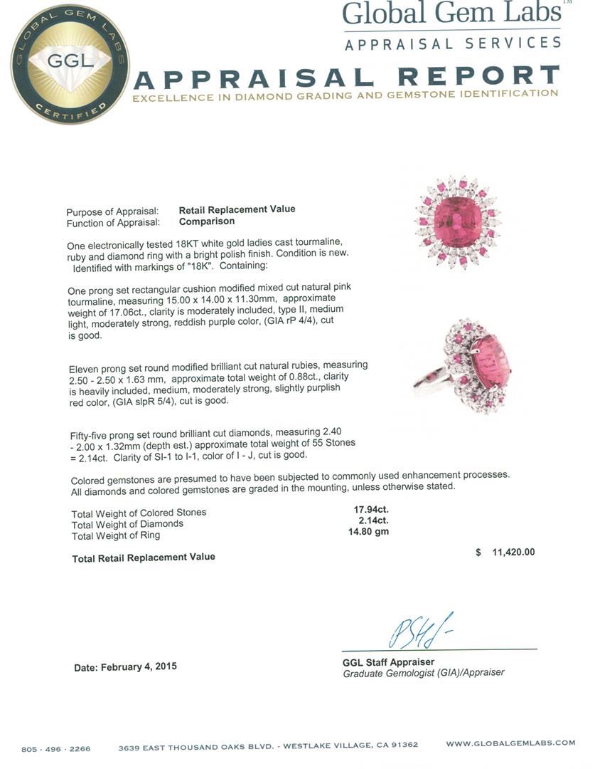 One electronically tested 18KT white gold ladies cast tourmaline, ruby and diamond ring with a bright polish finish. Identified with markings of "18K". Condition is new. Containing: One prong set rectangular cushion modified mixed cut natural pink tourmaline, measuring 15.00 x 14.00 x 11.30mm, approximate weight of 17.06ct., clarity is moderately included, type II, medium light, moderately strong, reddish purple color, (GIA rP 4/4), cut is good. Eleven prong set round modified brilliant cut natural rubies, measuring 2.50 - 2.50 x 1.63 mm, approximate total weight of 0.88ct., clarity is heavily included, medium, moderately strong, slightly purplish red color, (GIA slpR 5/4), cut is good. Fifty-Five prong set round brilliant cut diamonds, measuring 2.40 - 2.00 x 1.32mm (depth est.) approximate total weight of 55 Stones = 2.14ct. Clarity: SI-1 to I-1. Color: I - J, Cut is Good. Colored gemstones are presumed to have been subjected to commonly used enhancement processes. All diamonds and colored gemstones are graded in the mounting, unless otherwise stated. Total Weight of Colored Stones 17.94ct. Total Weight of Diamonds 2.14ct. Total Weight of Ring 14.80 grams. GGL Appraised at $11,420.00.