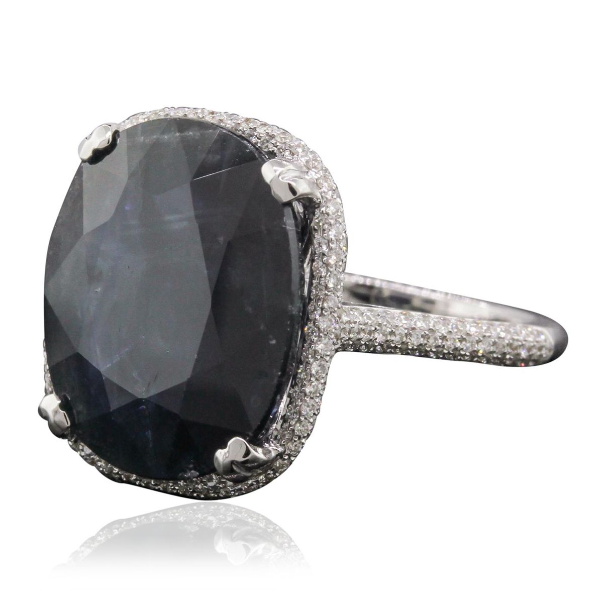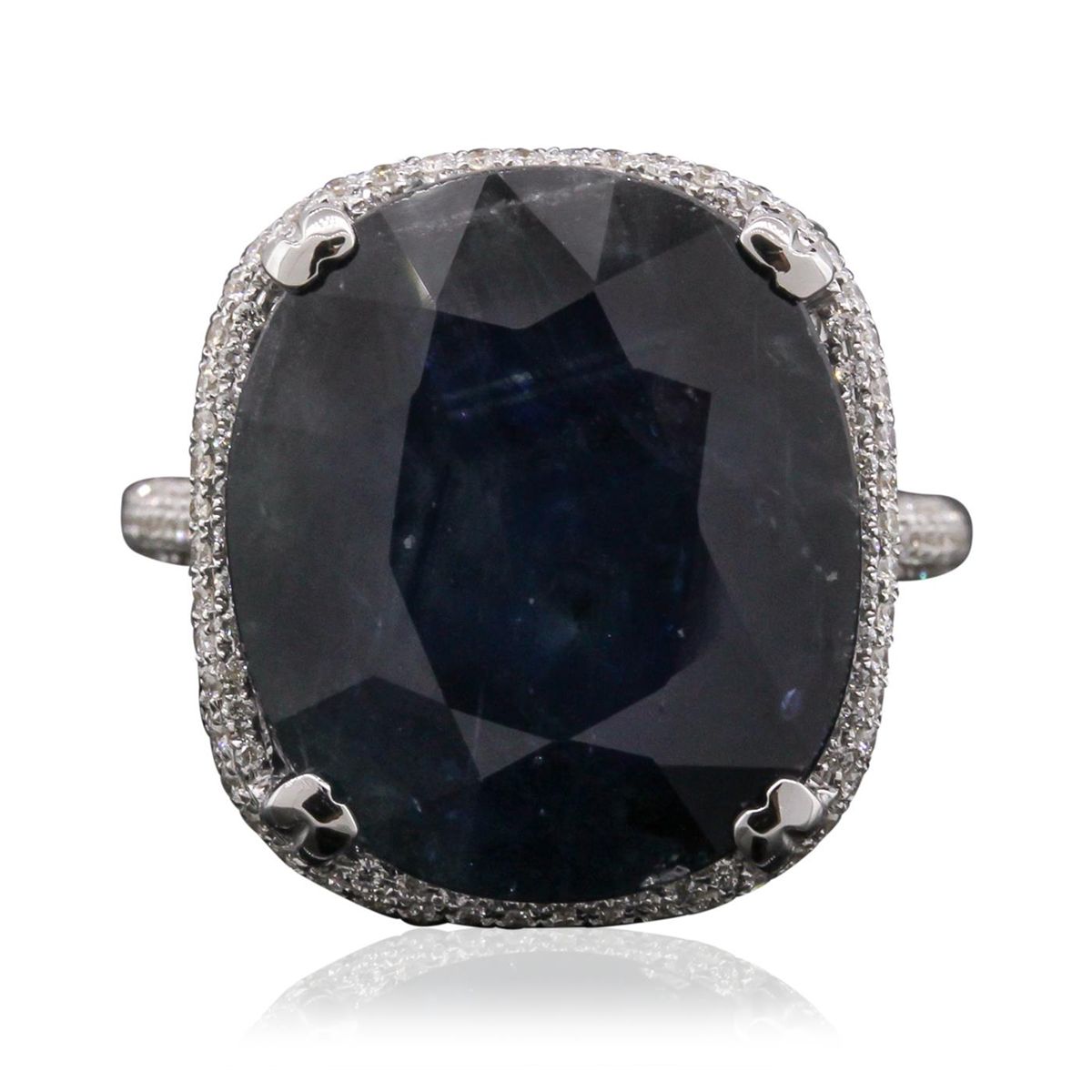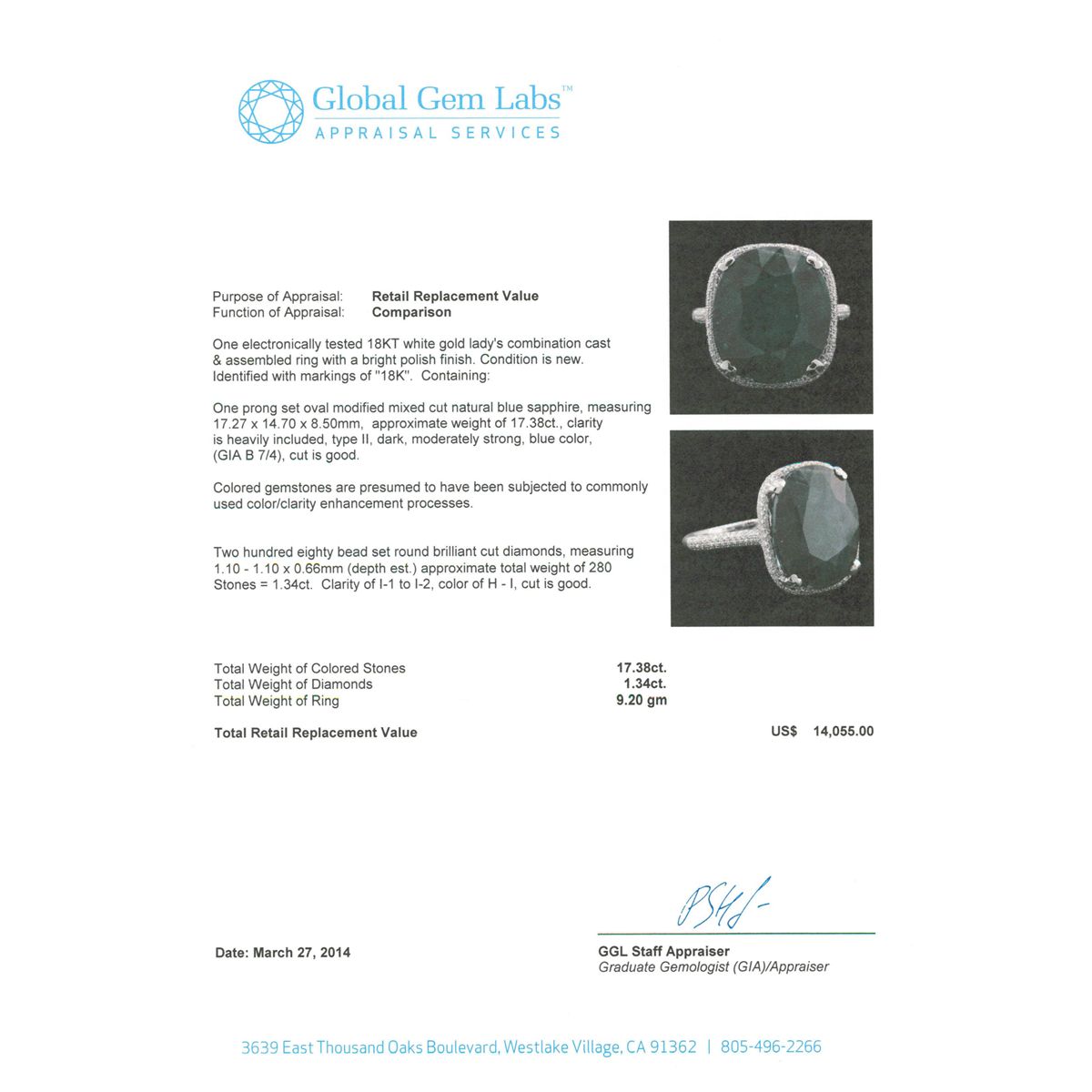 One electronically tested 18KT white gold Ladies combination cast & assembled ring with a bright polish finish. Condition is new. Identified with markings of "18K". Containing: One prong set oval modified mixed cut natural blue sapphire, measuring 17.27 x 14.70 x 8.50mm, approximate weight of 17.38ct., clarity is heavily included, type II, dark, moderately strong, blue color, (GIA B 7/4), cut is good. Colored gemstones are presumed to have been subjected to commonly used color/clarity enhancement processes. Two Hundred Eighty bead set round brilliant cut diamonds, measuring 1.10 - 1.10 x 0.66mm (depth est.) approximate. Total Weight of 280 Stones = 1.34ct. Clarity: I-1 to I-2. Color: H - I, Cut is Good. Total Weight of Colored Stones 17.38ct. Total Weight of Diamonds 1.34ct. Total Weight of Ring 9.20 grams. GGL Appraised at $14,055.00.
