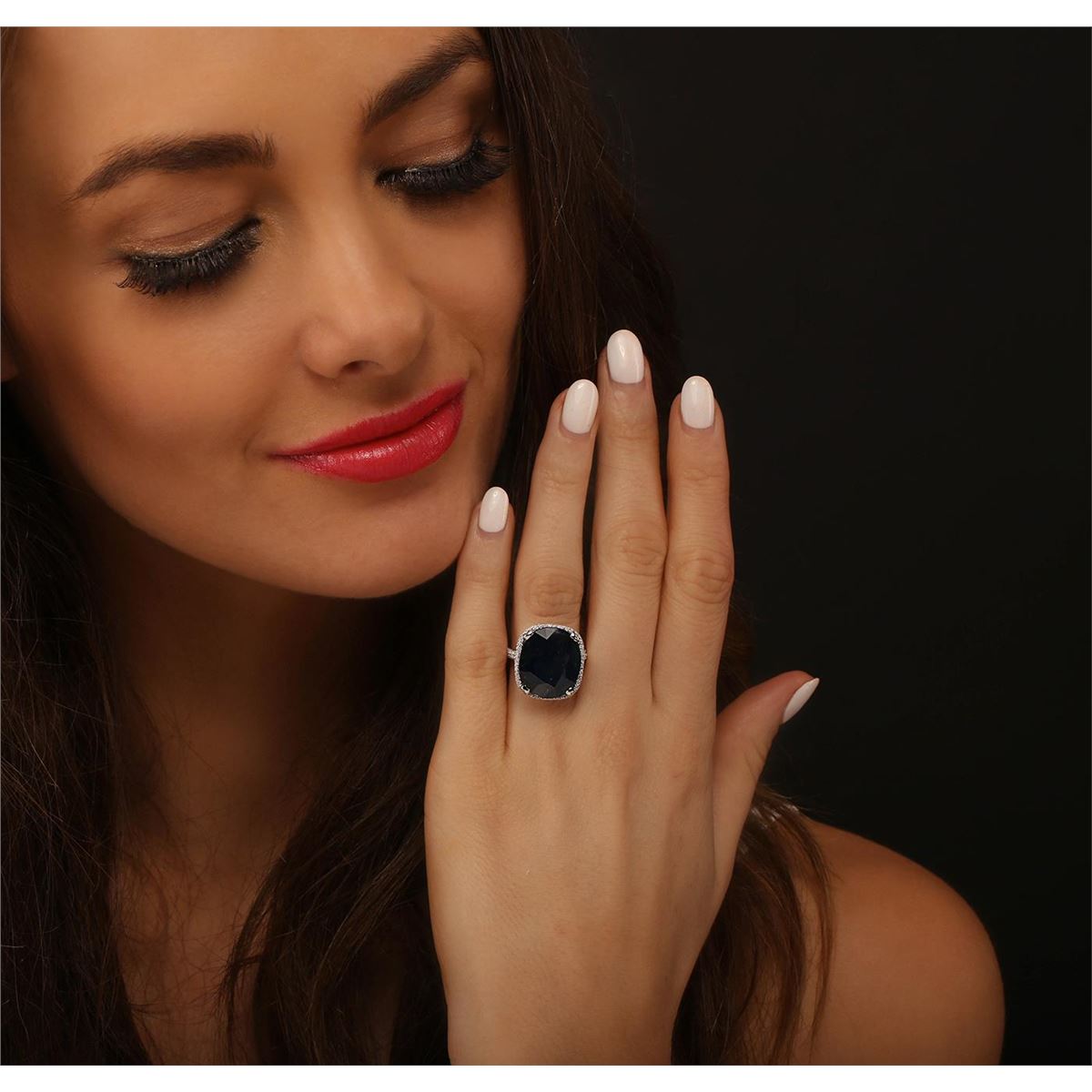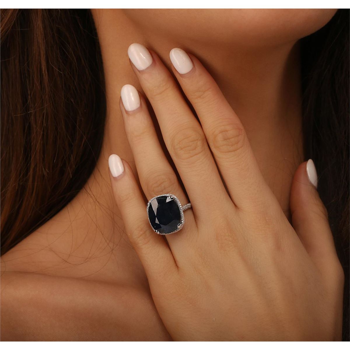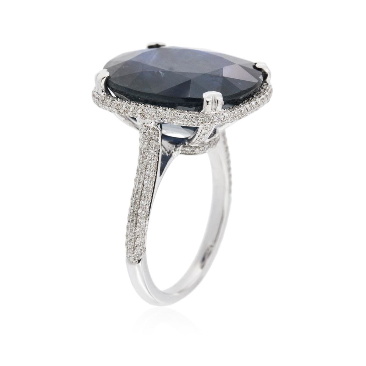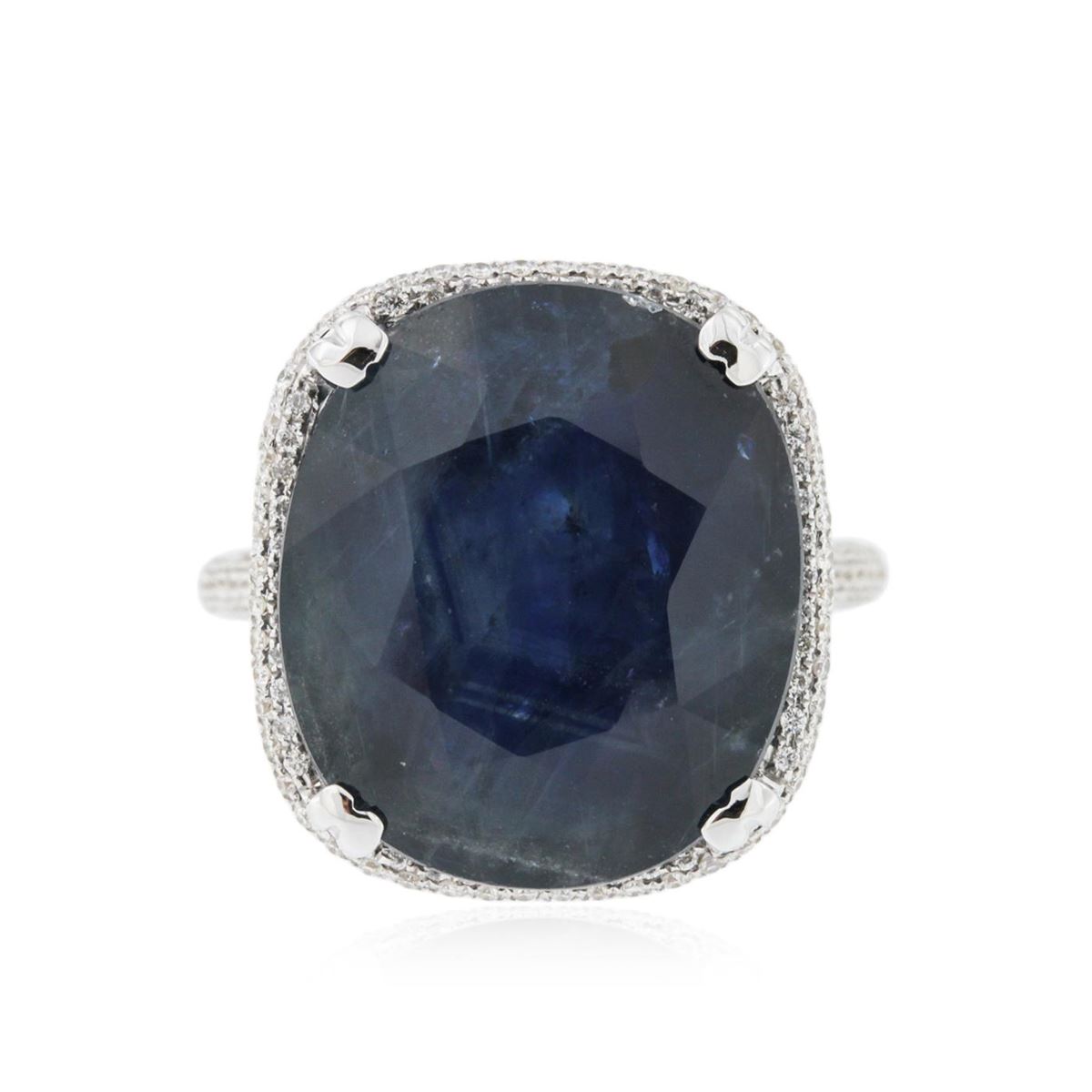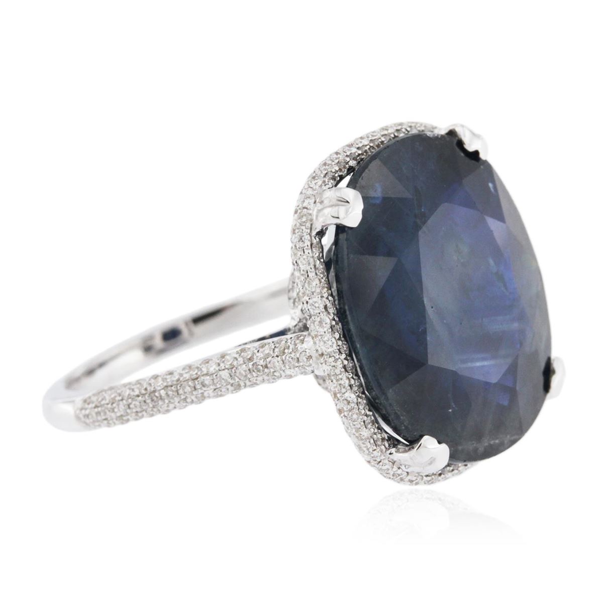 One electronically tested 18KT white gold Ladies combination cast & assembled ring with a bright polish finish. Condition is new. Identified with markings of "18K". Containing: One prong set oval modified mixed cut natural blue sapphire, measuring 17.27 x 14.70 x 8.50mm, approximate weight of 17.38ct., clarity is heavily included, type II, dark, moderately strong, blue color, (GIA B 7/4), cut is good. Colored gemstones are presumed to have been subjected to commonly used color/clarity enhancement processes. Two Hundred Eighty bead set round brilliant cut diamonds, measuring 1.10 - 1.10 x 0.66mm (depth est.) approximate. Total Weight of 280 Stones = 1.34ct. Clarity: I-1 to I-2. Color: H - I, Cut is Good. Total Weight of Colored Stones 17.38ct. Total Weight of Diamonds 1.34ct. Total Weight of Ring 9.20 grams. GGL Appraised at $14,055.00.