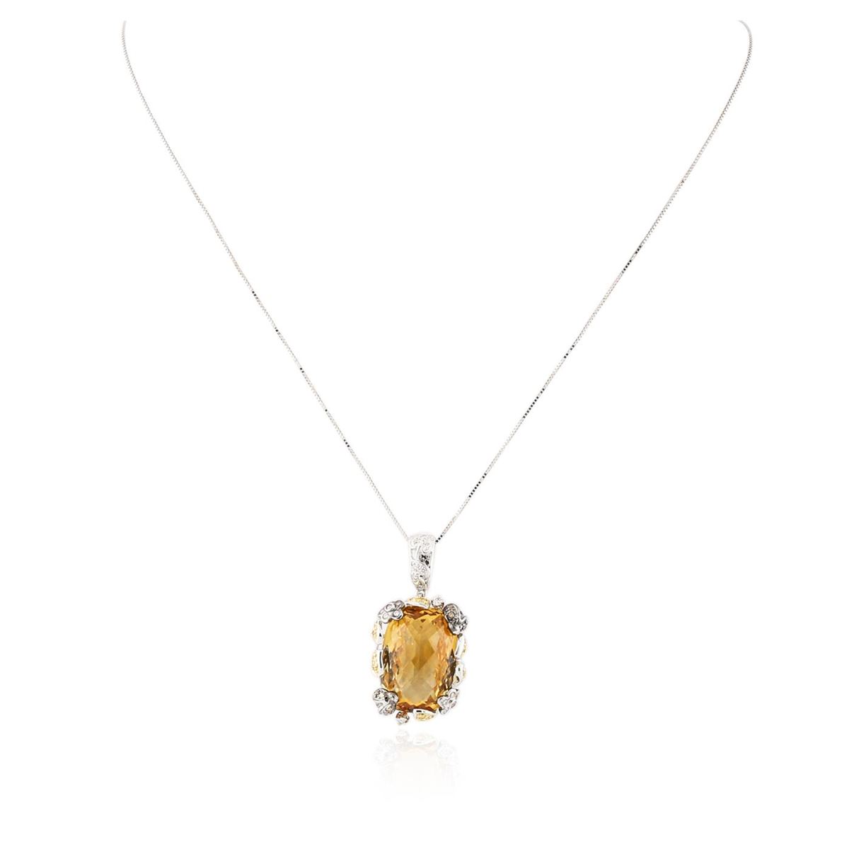 One pendant with chain featuring: 18KT white gold weighing 11.50 grams containing one citrine with a total weight of 18.12ct and diamonds with a total weight of 0.55ct.