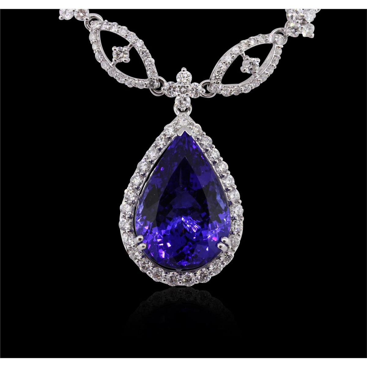 One necklace featuring: 18KT white gold weighing 30.00 grams containing one tanzanite center stone with a total weight of 19.12ct and round cut diamonds with a total weight of 10.91cts.
