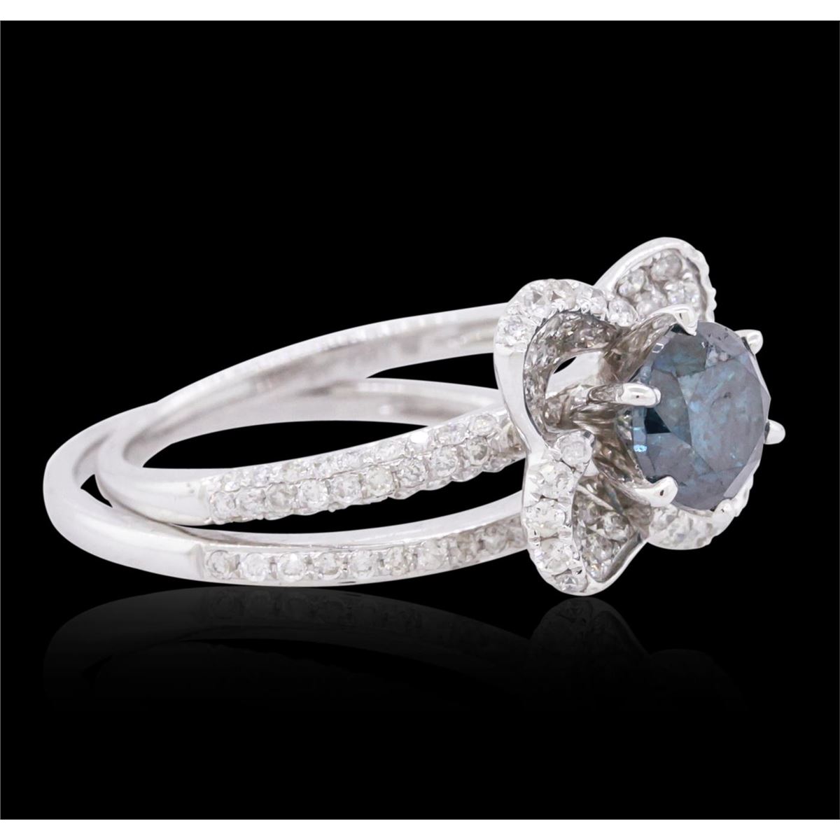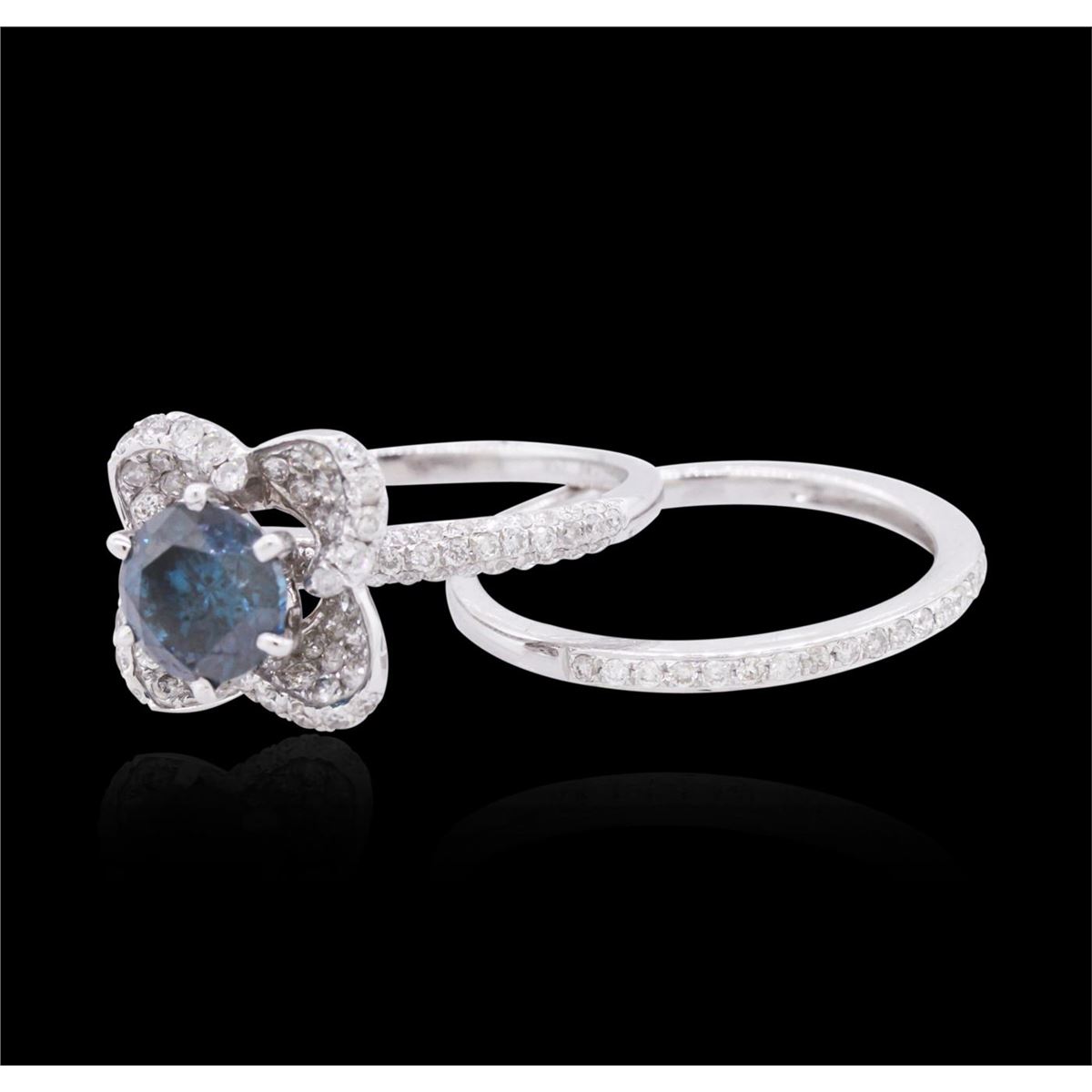 One wedding ring set featuring: 18KT white gold weighing 4.50 grams containing one blue diamond center stone with a total weight of 1.25ct and 132 round diamonds with a total weight of 0.75cts.