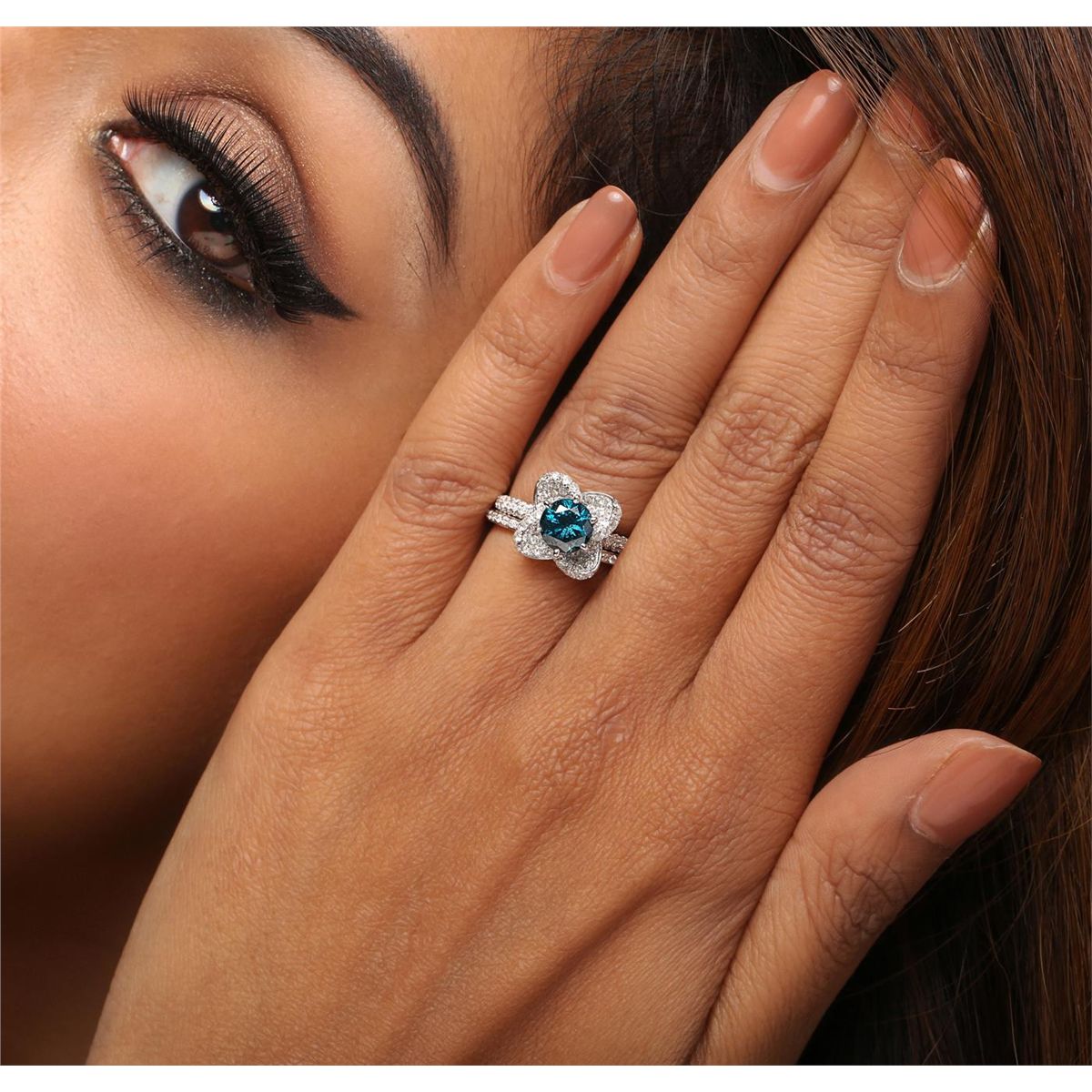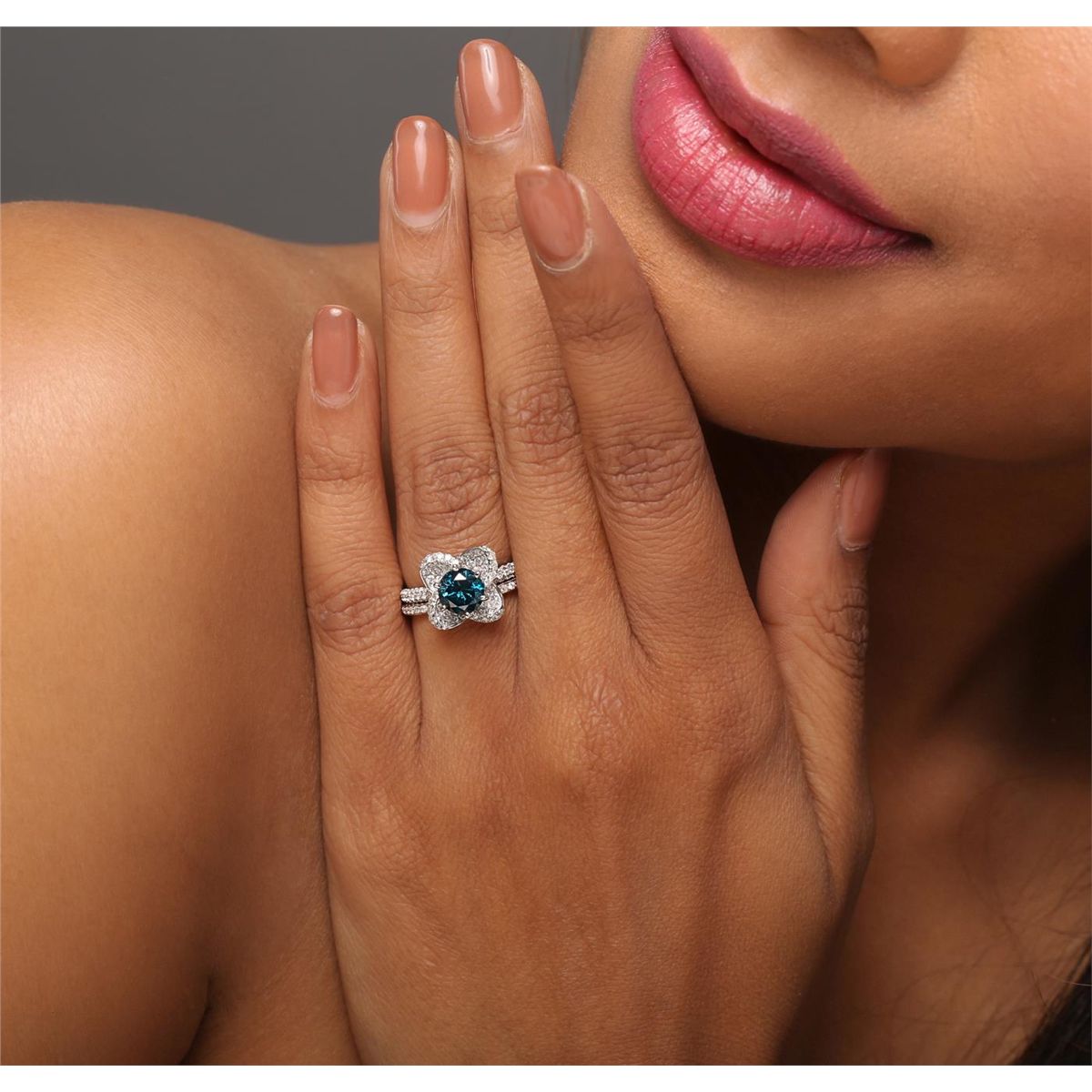 One wedding ring set featuring: 18KT white gold weighing 4.50 grams containing one blue diamond center stone with a total weight of 1.25ct and 132 round diamonds with a total weight of 0.75cts.