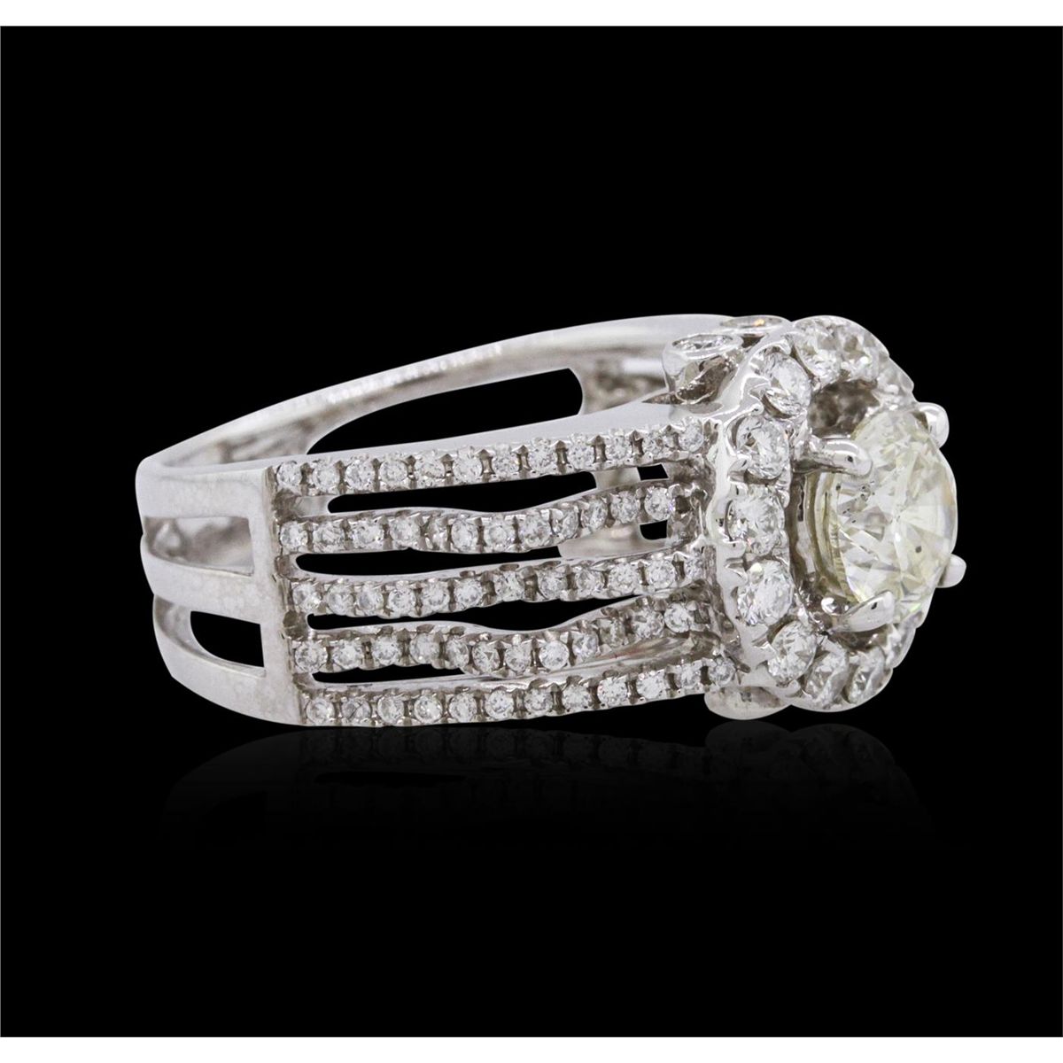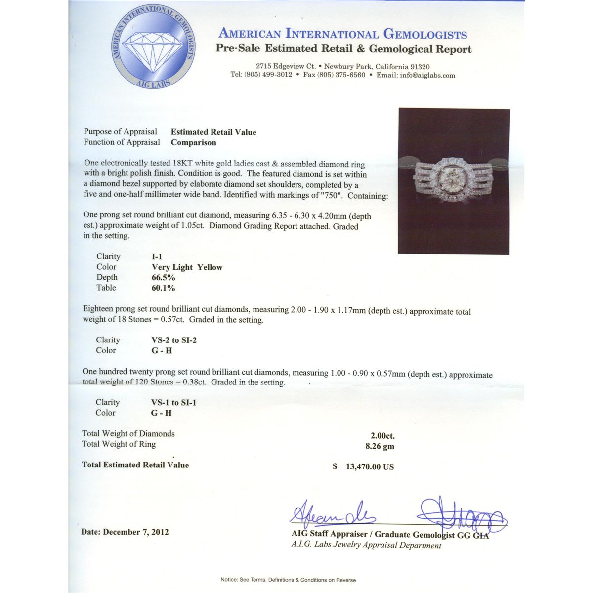 One electronically tested 18KT white gold ladies cast & assembled diamond ring with a bright polish finish. Condition is good. The featured diamonds is set within a diamond bezel supported by elaborate diamond set shoulders, completed by a five and one-ha