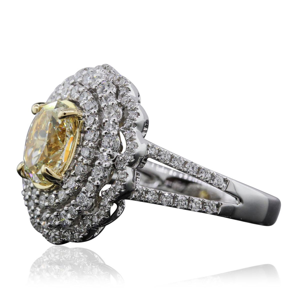 One electronically tested 18KT white gold ladies cast diamond ring. Condition is new, good workmanship. The featured diamond is set within tiered diamond bezels supported by diamond set split shoulders, completed by a two and one-half millimeter wide band. Bright polish finish with yellow gold accents. Trademark is DAYANII. Identified with markings of "18K 750". Containing: One prong set oval shaped cut diamond, measuring 7.75 x 5.40 x 3.45mm (depth est.) approximate weight of 1.02ct. Graded in the setting. Clarity VS-1 Depth 63.9%Table 59.3% One Hundred Twenty-Four prong set round brilliant cut diamonds, measuring 1.50 - 1.00 x 0.75mm (depth est.) approximate total weight of 124 Stones = 1.00ct. Graded in the setting. Clarity VS-1 to SI-1 Color G - I Total Weight of Diamonds 2.02ct. Total Weight of Ring 7.71 grams. AIG Appraised at $14,665.00.
