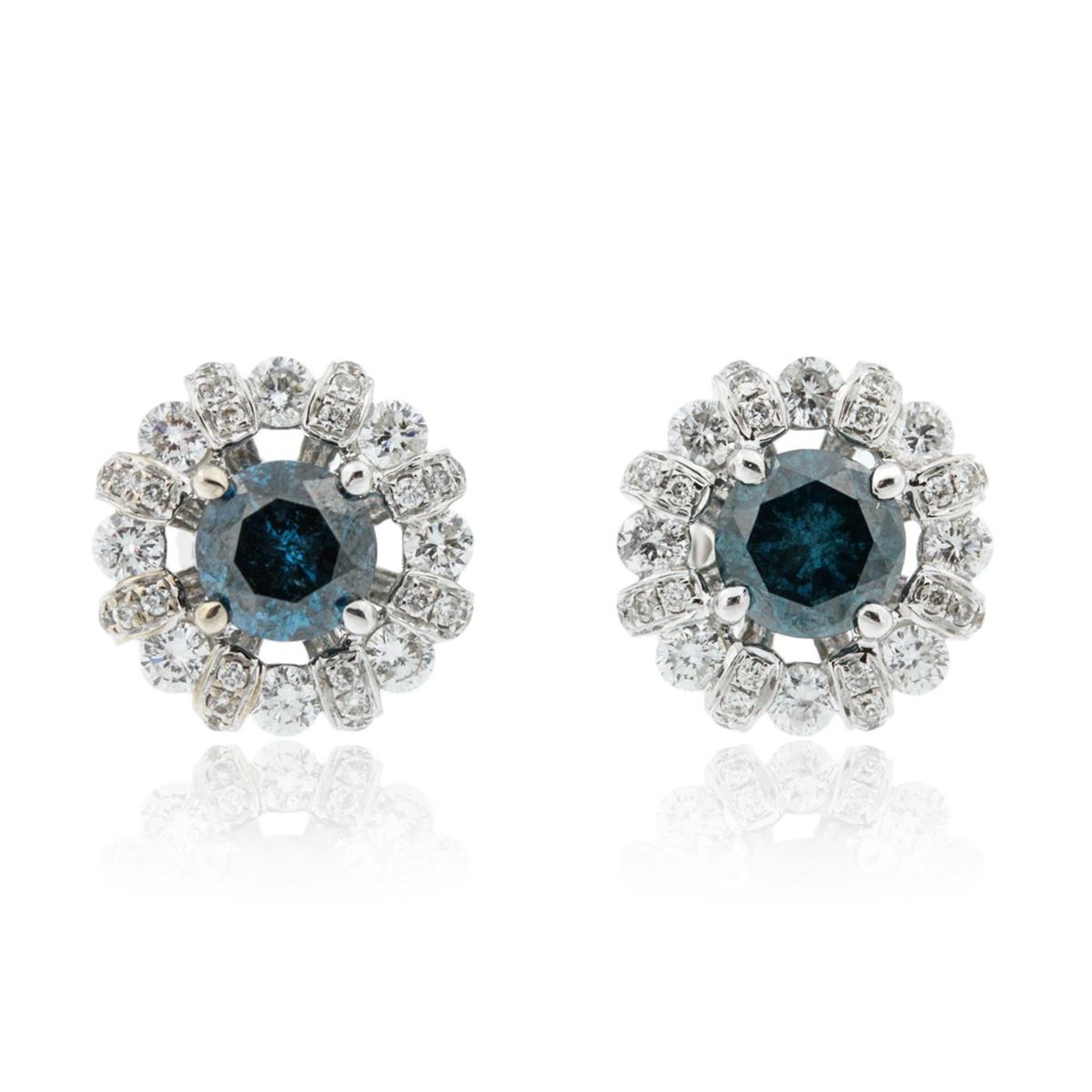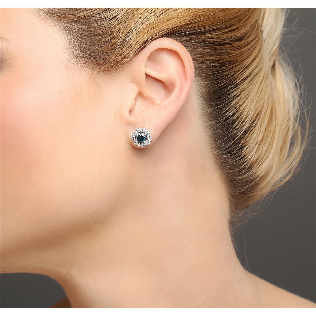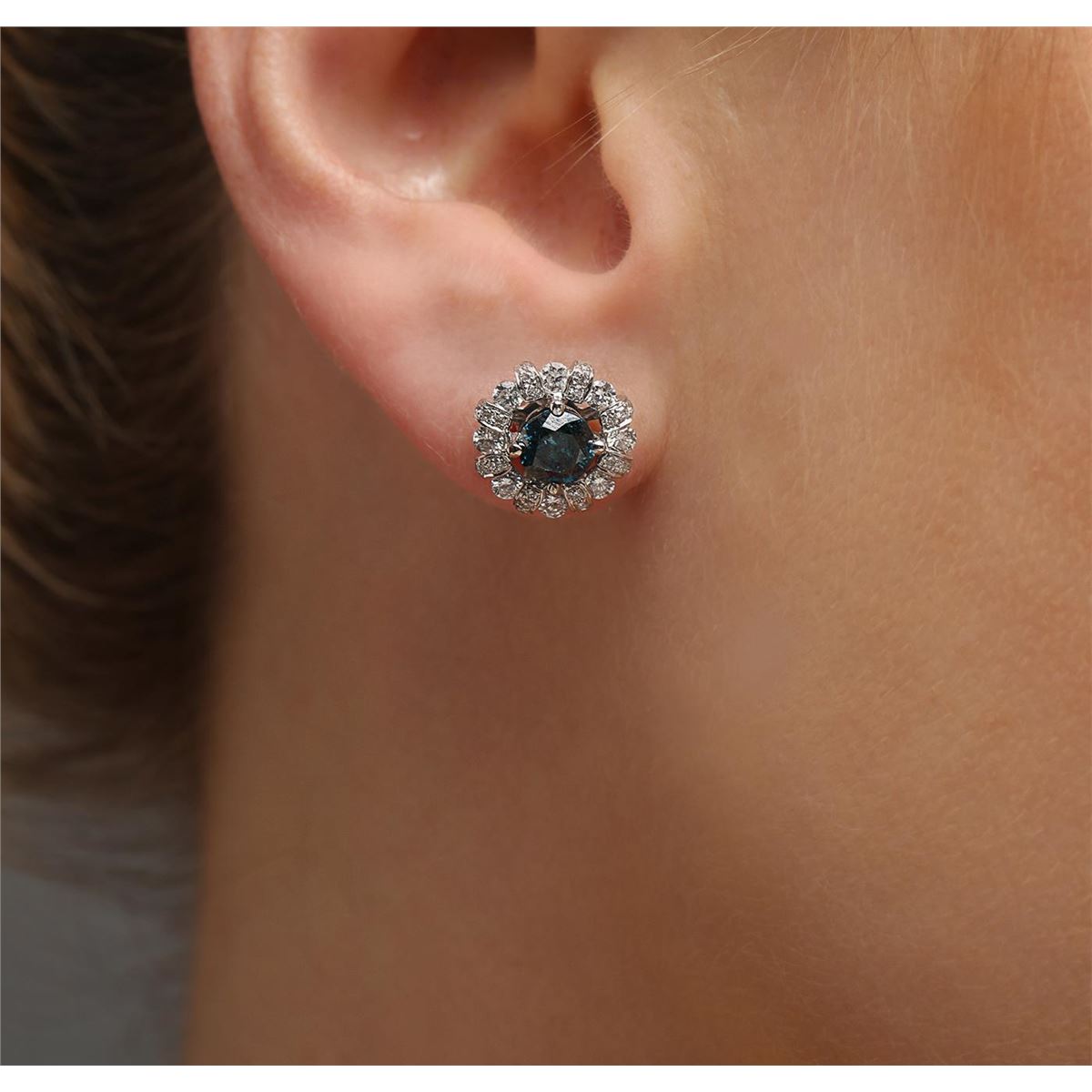 One pair of earrings featuring: 18KT white gold weighing 4.15 grams containing two blue diamonds with a total weight of 1.34ct and 64 round diamonds with a total weight of 1.34ct.