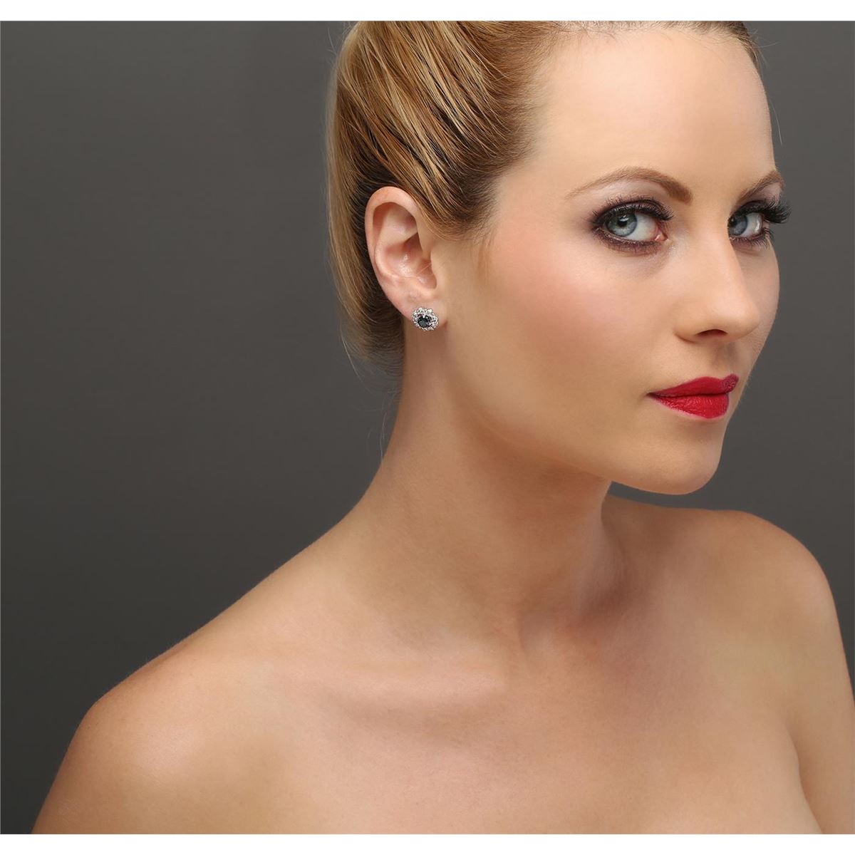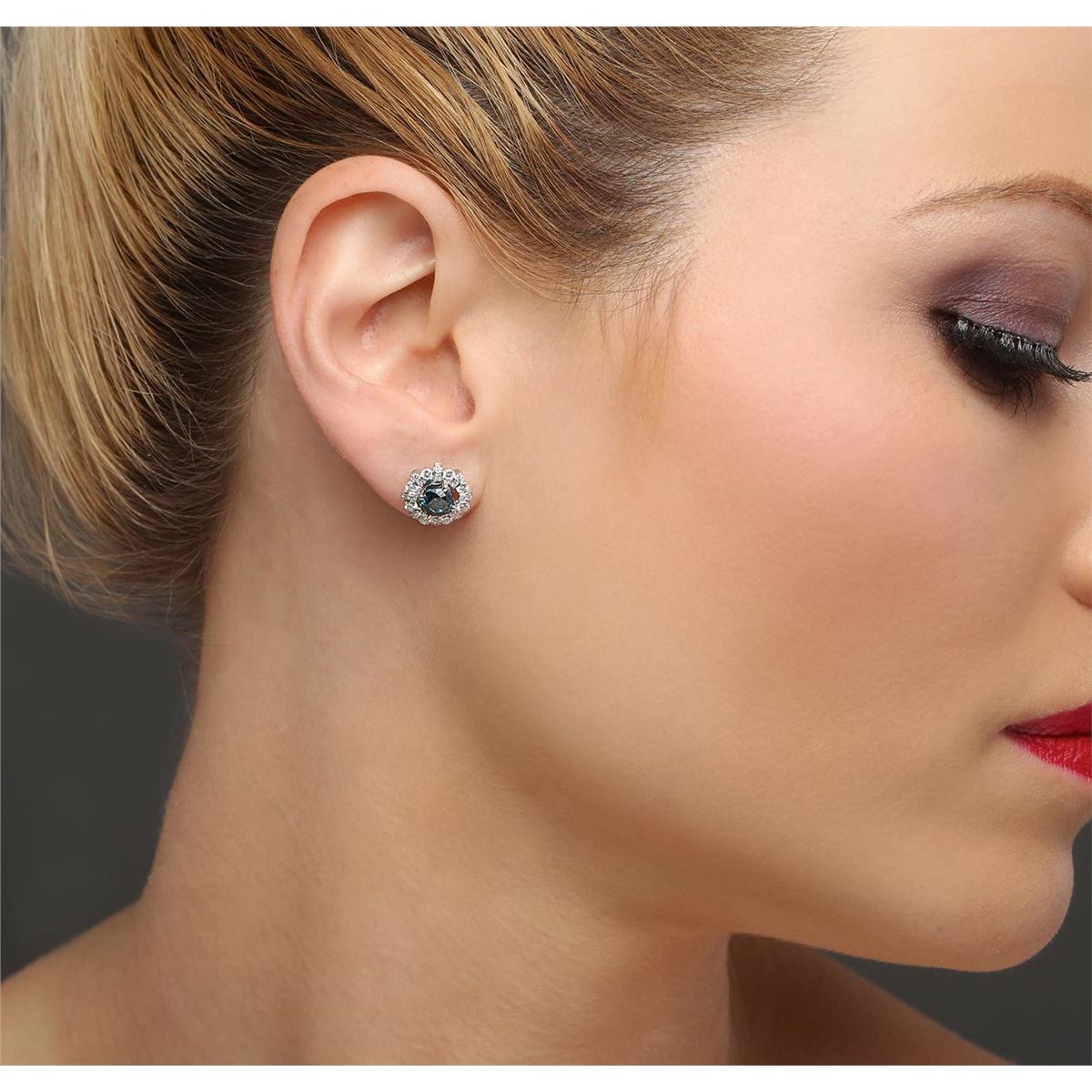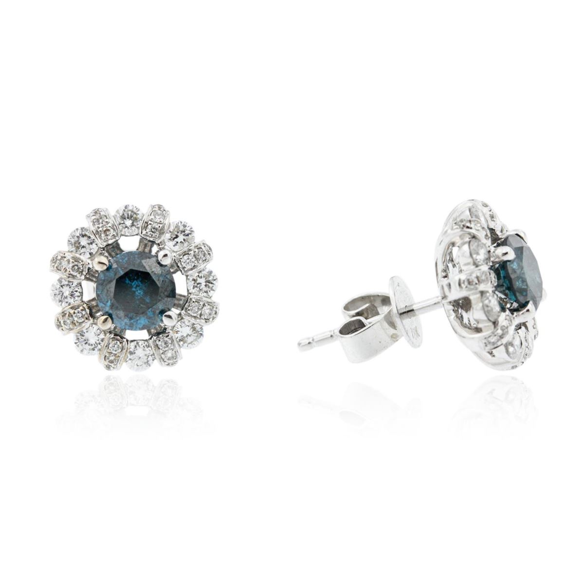 One pair of earrings featuring: 18KT white gold weighing 4.15 grams containing two blue diamonds with a total weight of 1.34ct and 64 round diamonds with a total weight of 1.34ct.