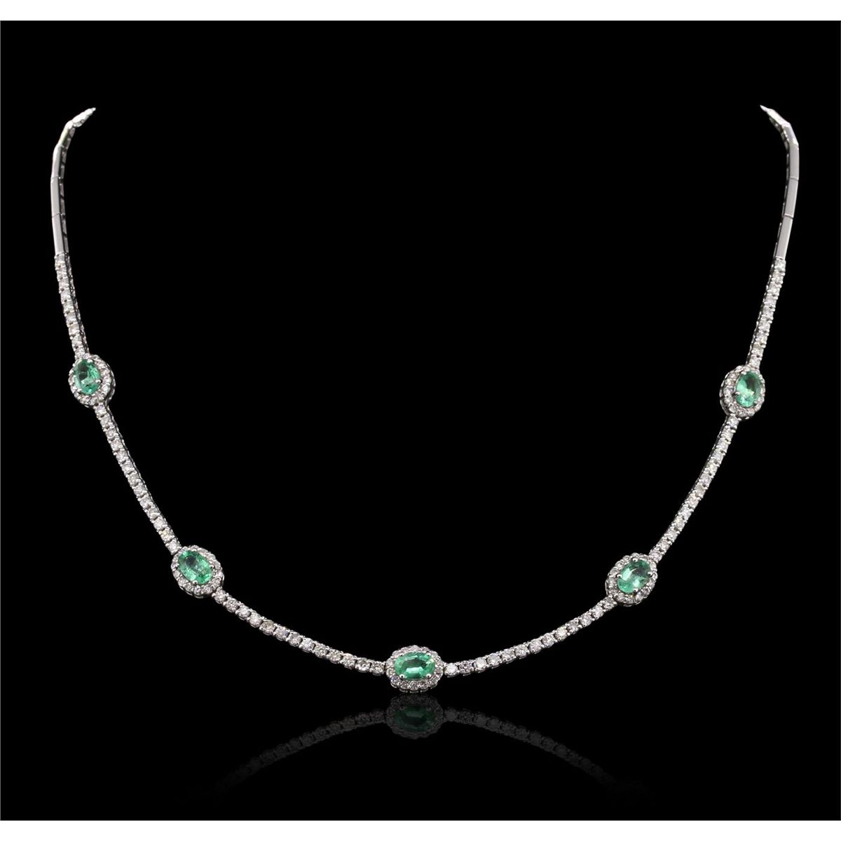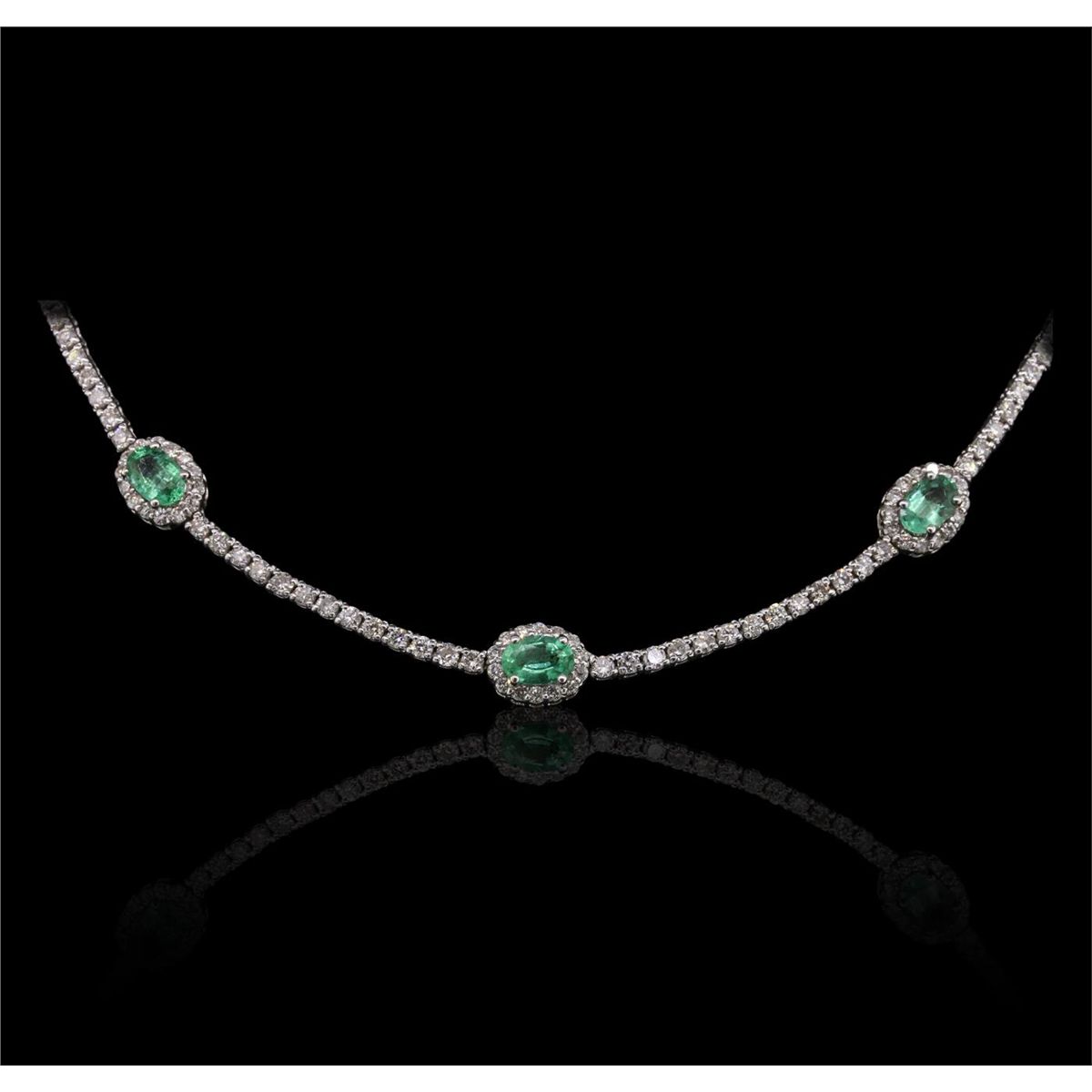 One polished, stamped, and electronically tested solid 18K white gold necklace mounted with: 5 genuine emeralds weighing 2.03 carats, and 134 genuine diamonds weighing 2.45 carats. The necklace measures 16.5 inches in length and is finished with a tension lock clasp and safety clasp. This item weighs 17.2 grams, condition is new, very good workmanship. Main Gemstones Identity natural emerald. Variety emerald. Species beryl. Shape oval (faceted). Measurements 6x4mm. Quantity 5 emeralds. Total weight 2.03 carats. Color green. Cut grade very good. Refractive index 1.564-1.595 DR. Birefringence 0.005 to 0.009. Hardness 7.5-8. Adjacent Gemstones on Necklace Identity natural diamonds. Cut round brilliant. Quantity 134 diamonds. Measurements 1.56 - 1.72mm. Total weight 2.45 carats. Clarity grade SI1-SI3. Color grade G-I. Refractive index 2.418. Hardness 10. Emerald carat weight 2.03cts. Diamond carat weight 2.45cts. Weight of item 17.2 grams. Gold content 18KT white gold. AIGL Appraised at $21,600.00.