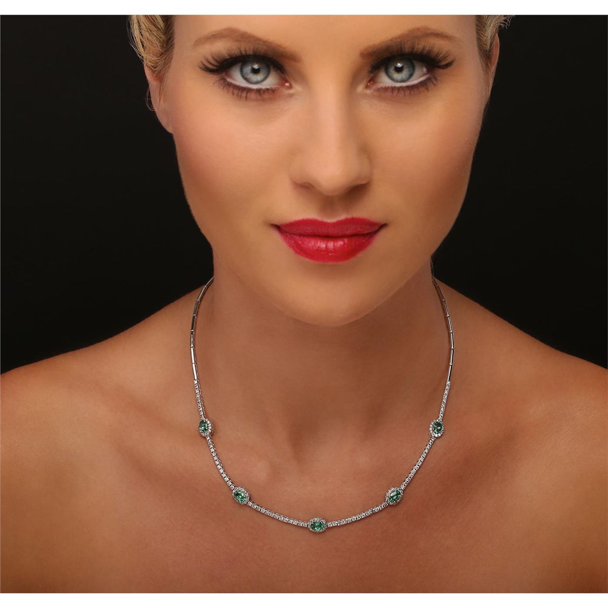 One polished, stamped, and electronically tested solid 18K white gold necklace mounted with: 5 genuine emeralds weighing 2.03 carats, and 134 genuine diamonds weighing 2.45 carats. The necklace measures 16.5 inches in length and is finished with a tension lock clasp and safety clasp. This item weighs 17.2 grams, condition is new, very good workmanship. Main Gemstones Identity natural emerald. Variety emerald. Species beryl. Shape oval (faceted). Measurements 6x4mm. Quantity 5 emeralds. Total weight 2.03 carats. Color green. Cut grade very good. Refractive index 1.564-1.595 DR. Birefringence 0.005 to 0.009. Hardness 7.5-8. Adjacent Gemstones on Necklace Identity natural diamonds. Cut round brilliant. Quantity 134 diamonds. Measurements 1.56 - 1.72mm. Total weight 2.45 carats. Clarity grade SI1-SI3. Color grade G-I. Refractive index 2.418. Hardness 10. Emerald carat weight 2.03cts. Diamond carat weight 2.45cts. Weight of item 17.2 grams. Gold content 18KT white gold. AIGL Appraised at $21,600.00.