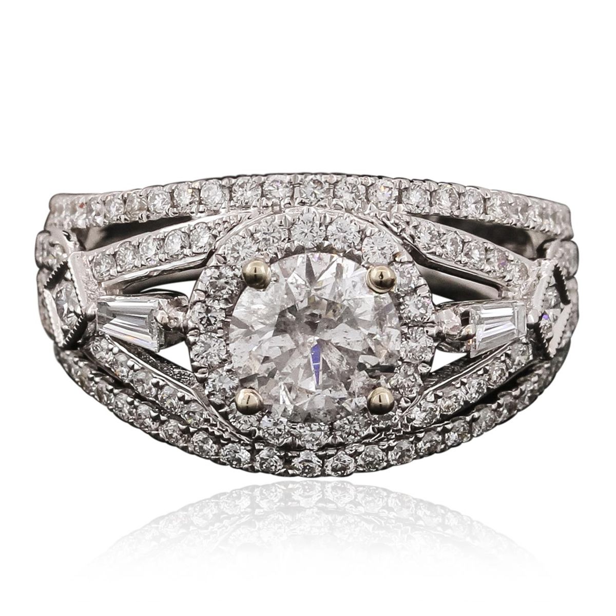 One electronically tested 18KT white gold ladies combination cast & assembled engagement ring with a bright polish finish. Identified with markings of "750". Condition is new. Containing: One prong set round brilliant cut diamond, measuring 6.45 - 6.43 x 4.26mm (depth est.) approximate weight of 1.08ct. Clarity: I-1. Color: I, Cut is Good. One Hundred Fourteen prong set round brilliant cut diamonds, measuring 2.00 - 1.10 x 0.93mm (depth est.) approximate total weight of 114 Stones = 0.86ct. Clarity: SI-1. Color: I - J, Cut is Good. Two prong set baguette cut diamonds, measuring 3.00 x 1.50 x 1.28mm (depth est.) approximate total weight of 2 Stones = 0.11ct. Clarity: VS-2. Color: I, Cut is Good. All diamonds are graded in the mounting, unless otherwise stated. Total Weight of Diamonds 2.05ct. Total Weight of Ring 5.20 grams. GGL Appraised at $22,035.00.