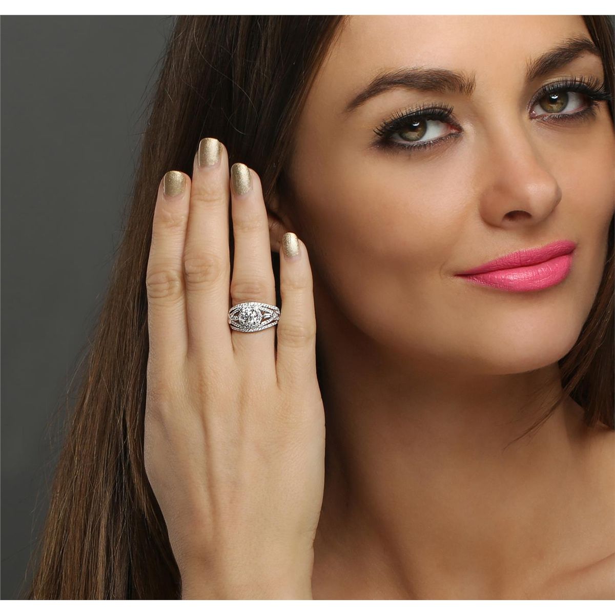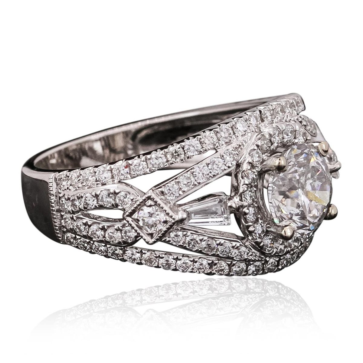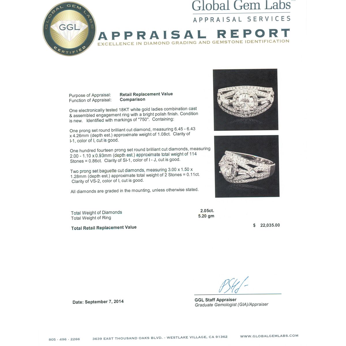 One electronically tested 18KT white gold ladies combination cast & assembled engagement ring with a bright polish finish. Identified with markings of "750". Condition is new. Containing: One prong set round brilliant cut diamond, measuring 6.45 - 6.43 x 4.26mm (depth est.) approximate weight of 1.08ct. Clarity: I-1. Color: I, Cut is Good. One Hundred Fourteen prong set round brilliant cut diamonds, measuring 2.00 - 1.10 x 0.93mm (depth est.) approximate total weight of 114 Stones = 0.86ct. Clarity: SI-1. Color: I - J, Cut is Good. Two prong set baguette cut diamonds, measuring 3.00 x 1.50 x 1.28mm (depth est.) approximate total weight of 2 Stones = 0.11ct. Clarity: VS-2. Color: I, Cut is Good. All diamonds are graded in the mounting, unless otherwise stated. Total Weight of Diamonds 2.05ct. Total Weight of Ring 5.20 grams. GGL Appraised at $22,035.00.
