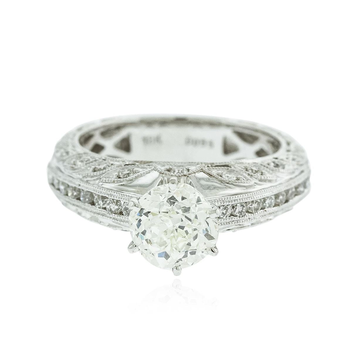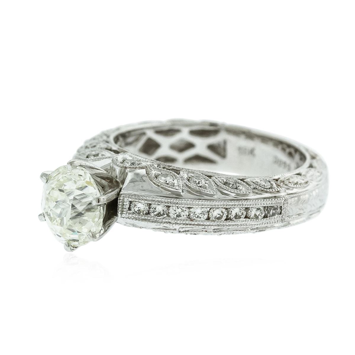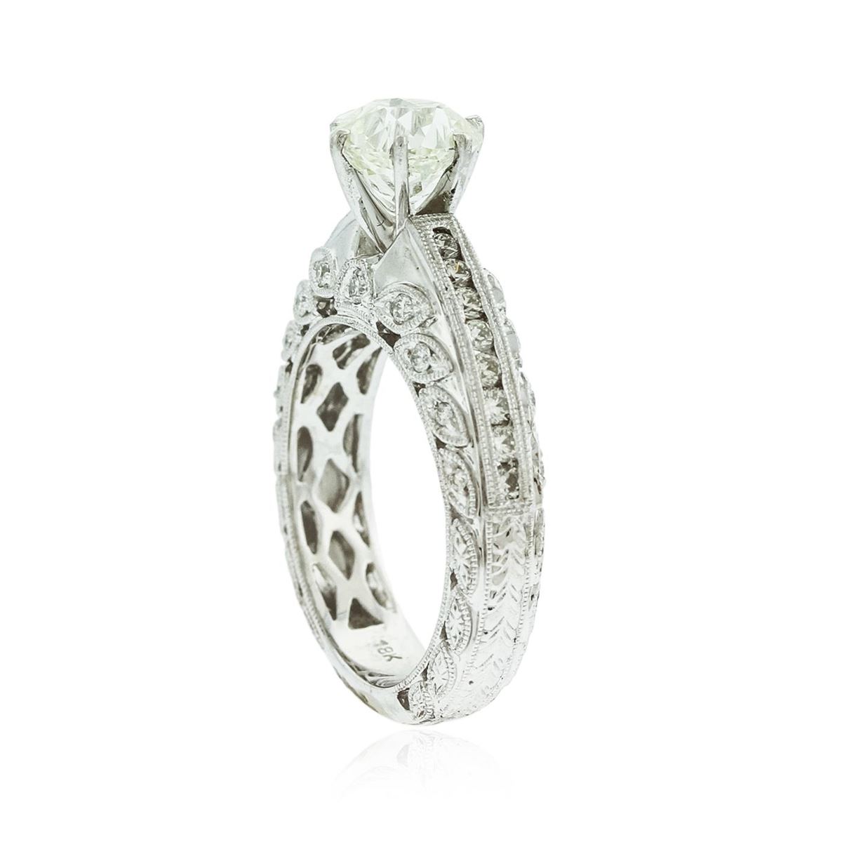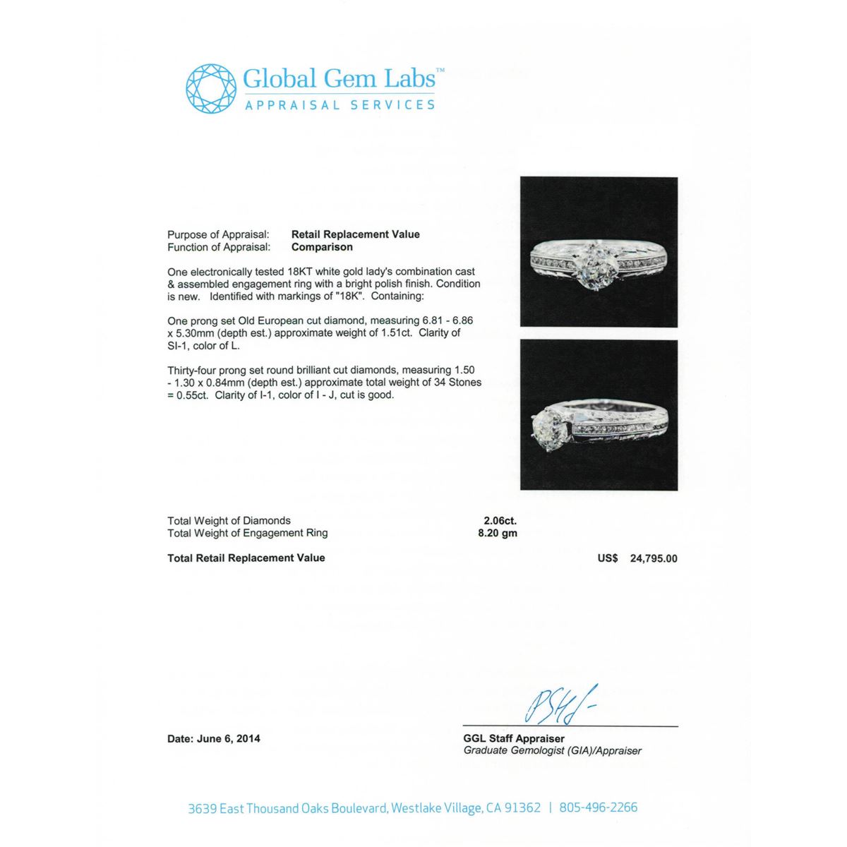 One electronically tested 18KT white gold Ladies combination cast & assembled engagement ring with a bright polish finish. Condition is new. Identified with markings of "18K". Containing: One prong set Old European cut diamond, measuring 6.81 - 6.86 x 5.30mm (depth est.) approximate weight of 1.51ct. Clarity: SI-1. Color: L. Thirty-Four prong set round brilliant cut diamonds, measuring 1.50 - 1.30 x 0.84mm (depth est.) approximate. Total Weight of 34 Stones = 0.55ct. Clarity: I-1. Color: I - J, Cut is Good. Total Weight of Diamonds 2.06ct. Total Weight of Engagement Ring 8.20 grams. GGL Appraised at $24,795.00.