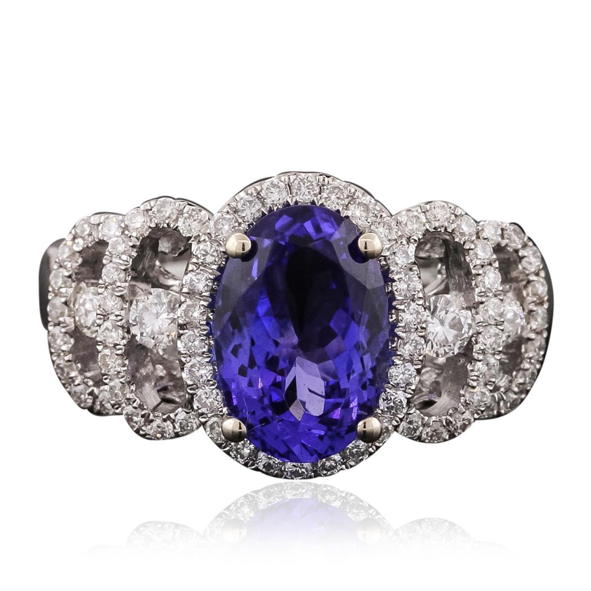 One electronically tested 18KT white gold ladies combination cast & assembled engagement ring with a bright polish finish. Identified with markings of "18K". Condition is new. Containing: One prong set oval modified brilliant cut natural tanzanite, measuring 10.12 x 6.86 x 4.46mm, approximate weight of 2.15ct., clarity is eye clean, type I, medium, moderately strong, violetish blue color, (GIA vB 5/4), cut is good. Four prong set round brilliant cut diamonds, measuring 2.50 - 2.00 x 1.35mm (depth est.) approximate total weight of 4 Stones = 0.17ct. Clarity: SI-1. Color: I - J, Cut is Good. Sixty-Nine prong set round brilliant cut diamonds, measuring 1.10 - 1.10 x 0.66mm (depth est.) approximate total weight of 69 Stones = 0.33ct. Clarity: SI-2 to I-1. Color: H - I, Cut is Good. Colored gemstones are presumed to have been subjected to commonly used enhancement processes. All diamonds and colored gemstones are graded in the mounting, unless otherwise stated. Total Weight of Colored Stones 2.15ct. Total Weight of Diamonds 0.50ct. Total Weight of Ring 7.10 grams. GGL Appraised at $8,355.00.