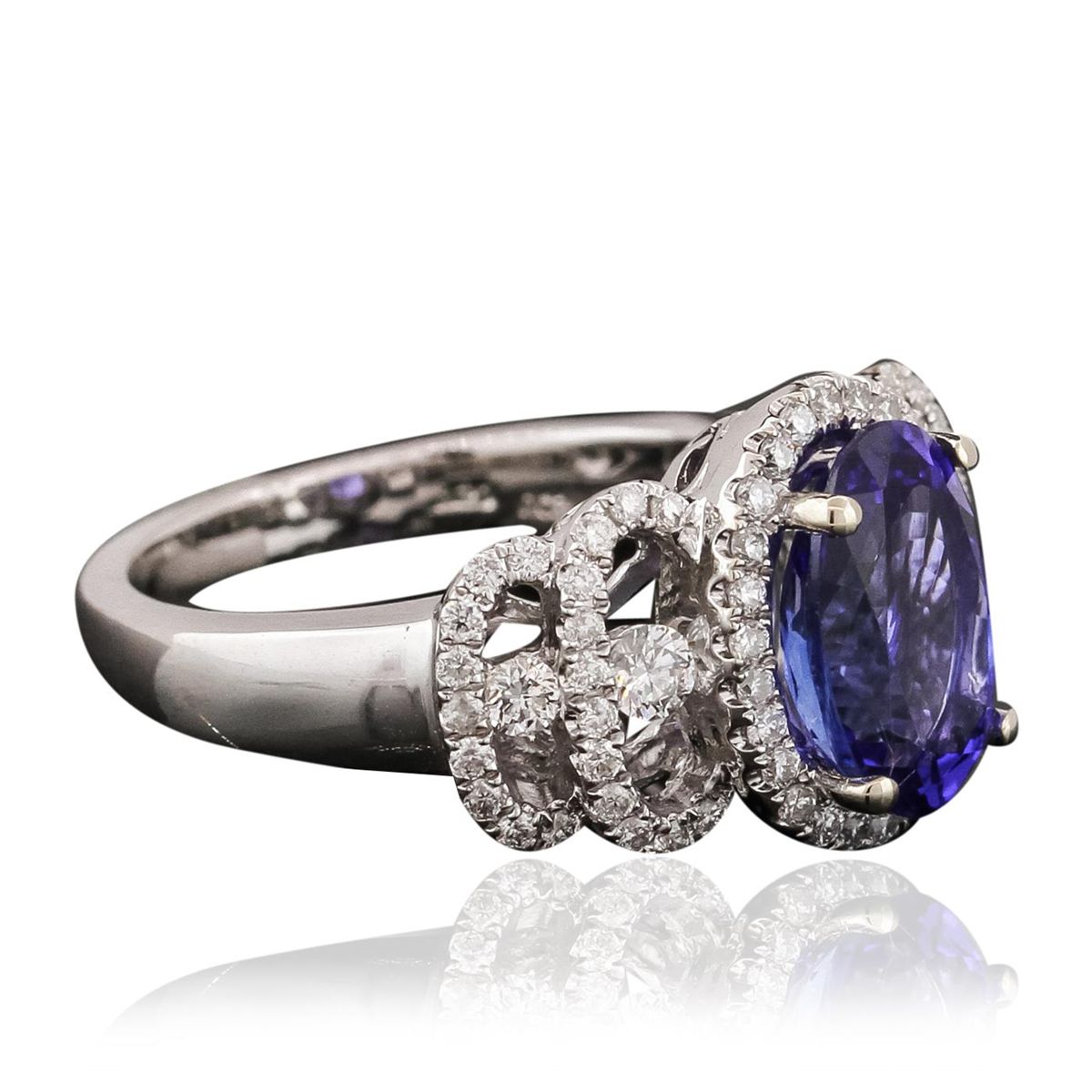 One electronically tested 18KT white gold ladies combination cast & assembled engagement ring with a bright polish finish. Identified with markings of "18K". Condition is new. Containing: One prong set oval modified brilliant cut natural tanzanite, measuring 10.12 x 6.86 x 4.46mm, approximate weight of 2.15ct., clarity is eye clean, type I, medium, moderately strong, violetish blue color, (GIA vB 5/4), cut is good. Four prong set round brilliant cut diamonds, measuring 2.50 - 2.00 x 1.35mm (depth est.) approximate total weight of 4 Stones = 0.17ct. Clarity: SI-1. Color: I - J, Cut is Good. Sixty-Nine prong set round brilliant cut diamonds, measuring 1.10 - 1.10 x 0.66mm (depth est.) approximate total weight of 69 Stones = 0.33ct. Clarity: SI-2 to I-1. Color: H - I, Cut is Good. Colored gemstones are presumed to have been subjected to commonly used enhancement processes. All diamonds and colored gemstones are graded in the mounting, unless otherwise stated. Total Weight of Colored Stones 2.15ct. Total Weight of Diamonds 0.50ct. Total Weight of Ring 7.10 grams. GGL Appraised at $8,355.00.