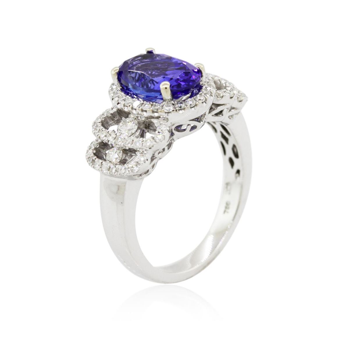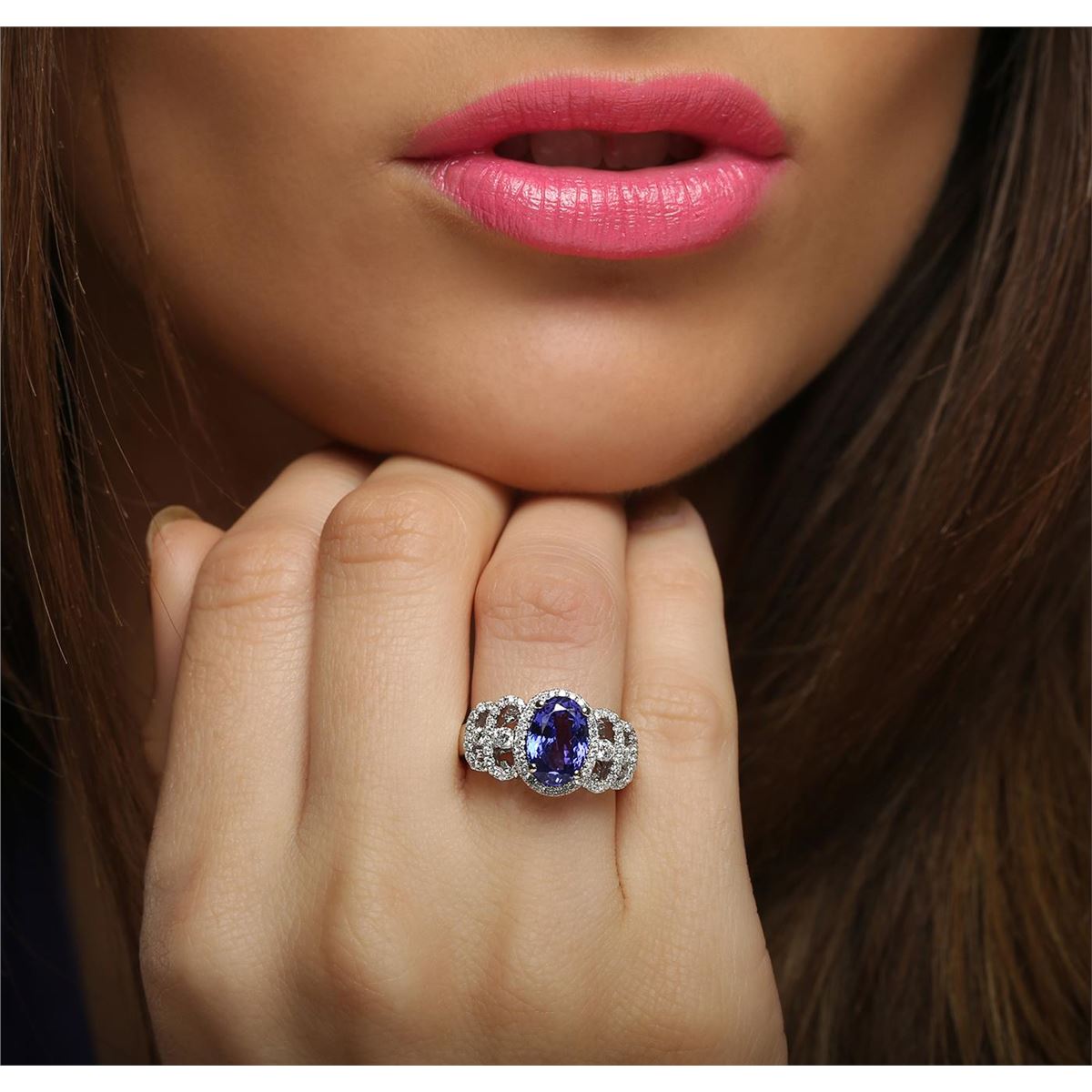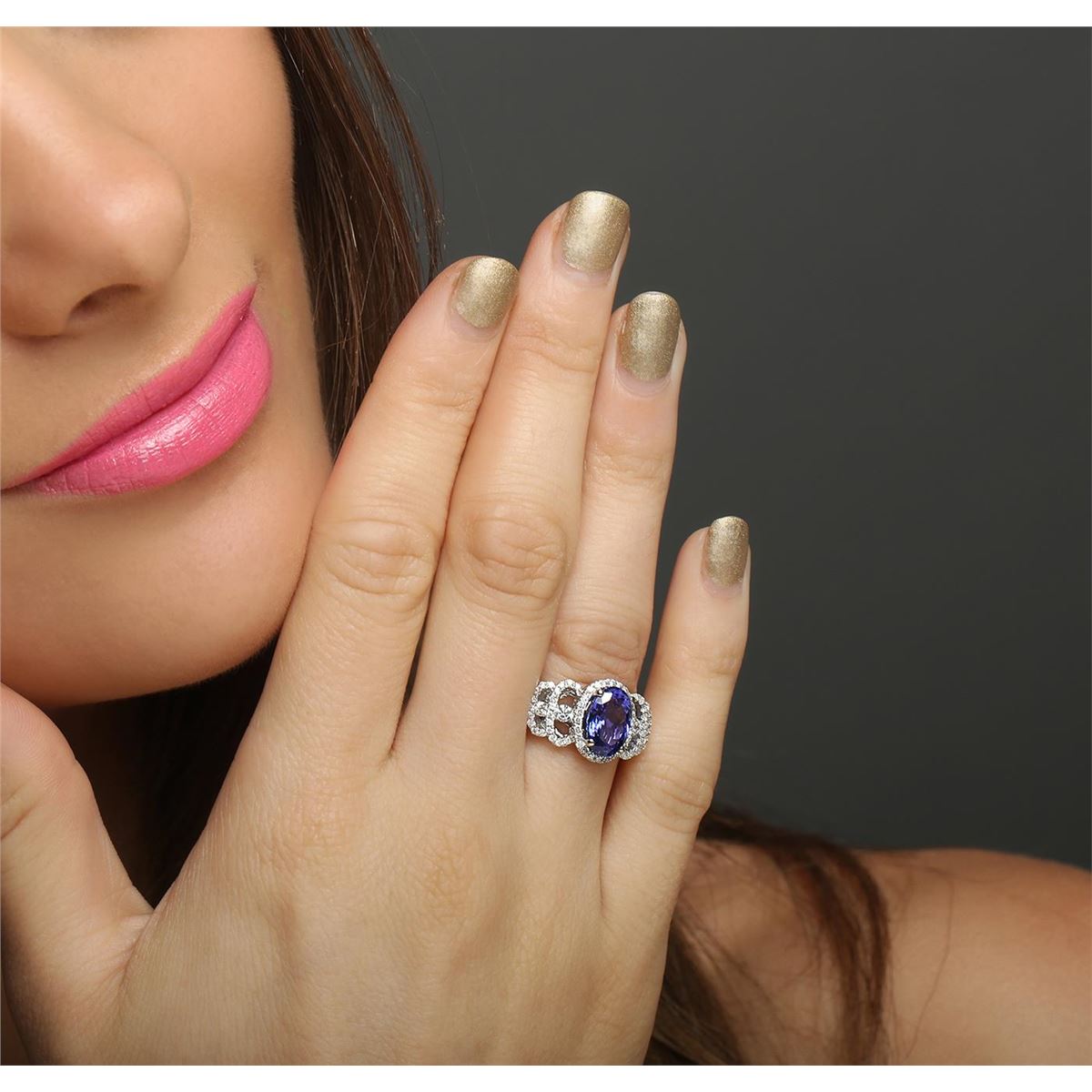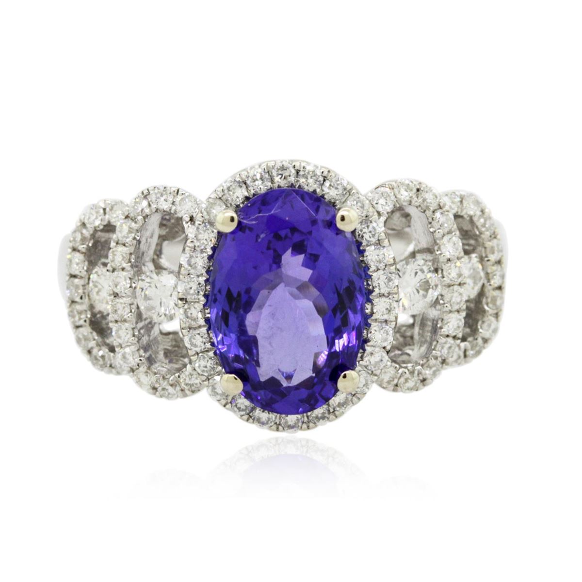 One electronically tested 18KT white gold ladies combination cast & assembled engagement ring with a bright polish finish. Identified with markings of "18K". Condition is new. Containing: One prong set oval modified brilliant cut natural tanzanite, measuring 10.12 x 6.86 x 4.46mm, approximate weight of 2.15ct., clarity is eye clean, type I, medium, moderately strong, violetish blue color, (GIA vB 5/4), cut is good. Four prong set round brilliant cut diamonds, measuring 2.50 - 2.00 x 1.35mm (depth est.) approximate total weight of 4 Stones = 0.17ct. Clarity: SI-1. Color: I - J, Cut is Good. Sixty-Nine prong set round brilliant cut diamonds, measuring 1.10 - 1.10 x 0.66mm (depth est.) approximate total weight of 69 Stones = 0.33ct. Clarity: SI-2 to I-1. Color: H - I, Cut is Good. Colored gemstones are presumed to have been subjected to commonly used enhancement processes. All diamonds and colored gemstones are graded in the mounting, unless otherwise stated. Total Weight of Colored Stones 2.15ct. Total Weight of Diamonds 0.50ct. Total Weight of Ring 7.10 grams. GGL Appraised at $8,355.00.