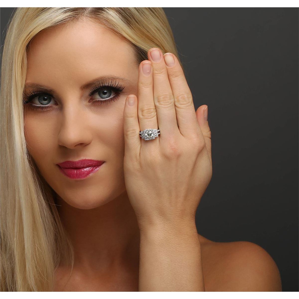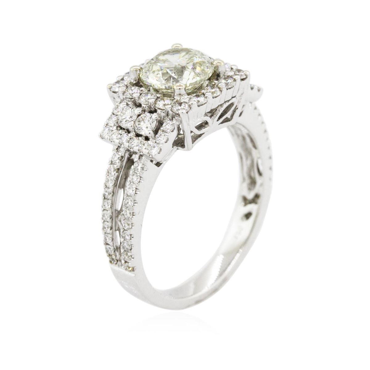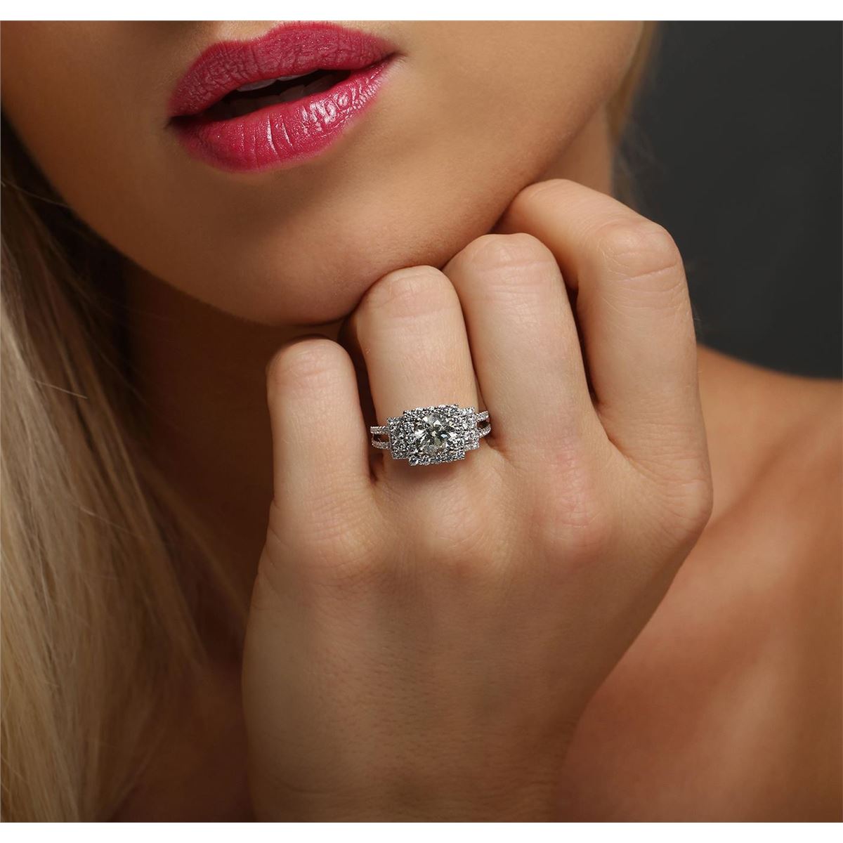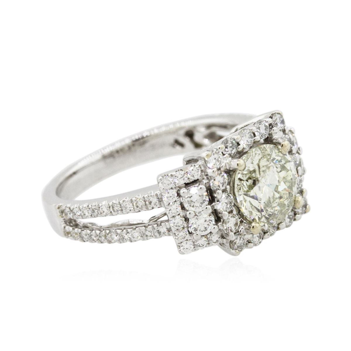 One electronically tested 18KT White Gold ladies cast diamond unity ring with a bright polish finish. The featured diamond is set within a diamond bezel supported by elaborate diamond set split shoulders, completed by a two and one-half millimeter wide band. Identified with markings of "18K 750". Condition is new, good workmanship. Containing: One prong set round brilliant cut diamond, measuring 6.85 - 6.80 x 4.45mm (depth est.) approximate weight of 1.36ct with a strong blue fluorescence. Graded in the setting. Clarity: I-1. Color: M. Depth 65.3%. Table 58.7%. Eighty prong set round brilliant cut diamonds approximate total weight of 80 Stones = 0.83ct. Graded in the setting. Clarity: VS-1 to SI-1. Color: G - I. Total Weight of Diamonds 2.19ct. Total Weight of Unity Ring 5.52 grams. AIG Appraised at $17,610.00.