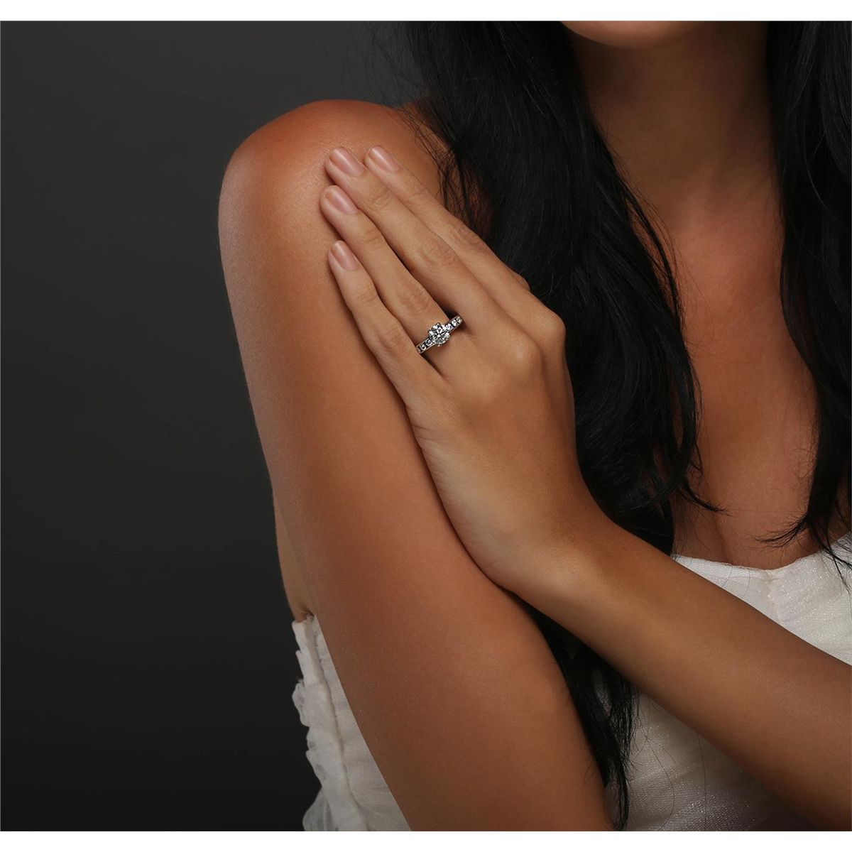 One electronically tested 18KT white gold ladies cast diamond and sapphire ring with a bright polish finish. The featured diamond is supported by diamond and sapphire set shoulders, completed by a two millimeter wide band. Identified with markings of "18K". Condition is good. Containing: One prong set round brilliant cut diamond, measuring 7.10 - 7.08 x 4.70mm (depth est.), 4.00.%. GTCF approximate weight of 1.59ct with a medium blue fluorescence. Naturally occurring internal & external characteristics are present, including natural iridescence. Graded in the setting. Clarity: I-2 . Color: I. Depth 66.3%. Table 56.4%. Six channel set round brilliant cut diamonds, measuring 2.90 - 2.80 x 1.71mm (depth est.) approximate total weight of 6 Stones = 0.60ct. Graded in the setting. Clarity: VVS-1 to VVS-2. Color G - I. Eight channel set round brilliant cut natural blue sapphires, measuring 1.40 - 1.30 x 0.88 mm, approximate total weight of 0.15ct., clarity is eye clean, type II, medium dark, moderately strong, blue color, (GIA B 6/4), cut is good. Transmitting light with no distortion, transparent. Color grade is an average for the group. Graded in the setting. Total Weight of Colored Stones 0.15ct. Total Weight of Diamonds 2.19ct. Total Weight of Ring 5.31 grams. AIG Appraised at $19,335.00.