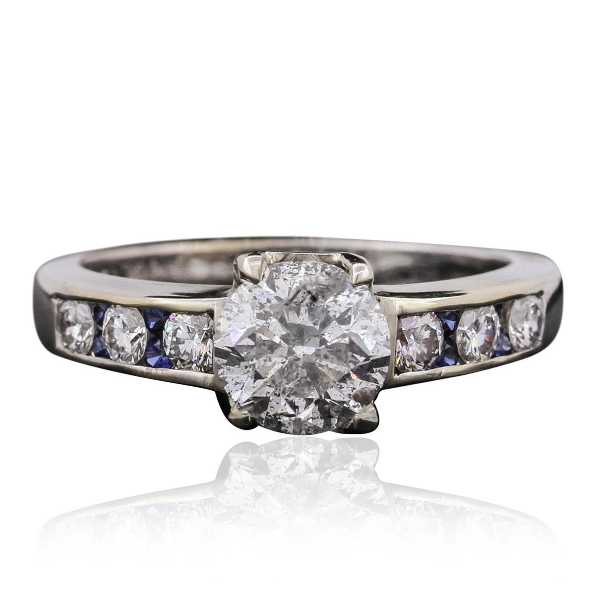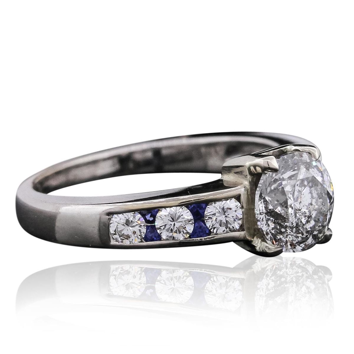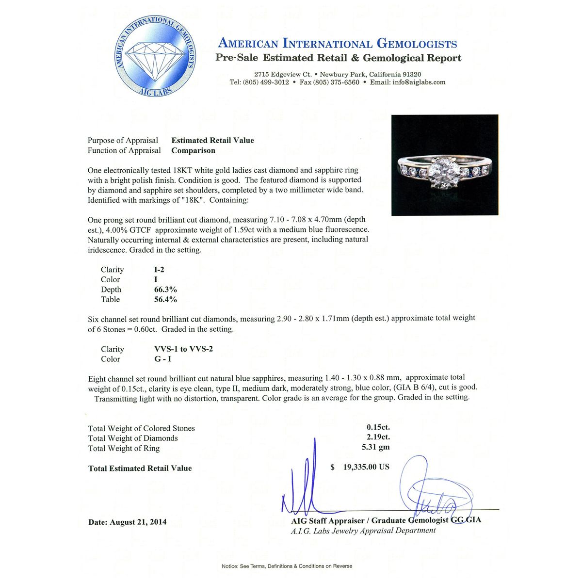 One electronically tested 18KT white gold ladies cast diamond and sapphire ring with a bright polish finish. The featured diamond is supported by diamond and sapphire set shoulders, completed by a two millimeter wide band. Identified with markings of "18K". Condition is good. Containing: One prong set round brilliant cut diamond, measuring 7.10 - 7.08 x 4.70mm (depth est.), 4.00.%. GTCF approximate weight of 1.59ct with a medium blue fluorescence. Naturally occurring internal & external characteristics are present, including natural iridescence. Graded in the setting. Clarity: I-2 . Color: I. Depth 66.3%. Table 56.4%. Six channel set round brilliant cut diamonds, measuring 2.90 - 2.80 x 1.71mm (depth est.) approximate total weight of 6 Stones = 0.60ct. Graded in the setting. Clarity: VVS-1 to VVS-2. Color G - I. Eight channel set round brilliant cut natural blue sapphires, measuring 1.40 - 1.30 x 0.88 mm, approximate total weight of 0.15ct., clarity is eye clean, type II, medium dark, moderately strong, blue color, (GIA B 6/4), cut is good. Transmitting light with no distortion, transparent. Color grade is an average for the group. Graded in the setting. Total Weight of Colored Stones 0.15ct. Total Weight of Diamonds 2.19ct. Total Weight of Ring 5.31 grams. AIG Appraised at $19,335.00.