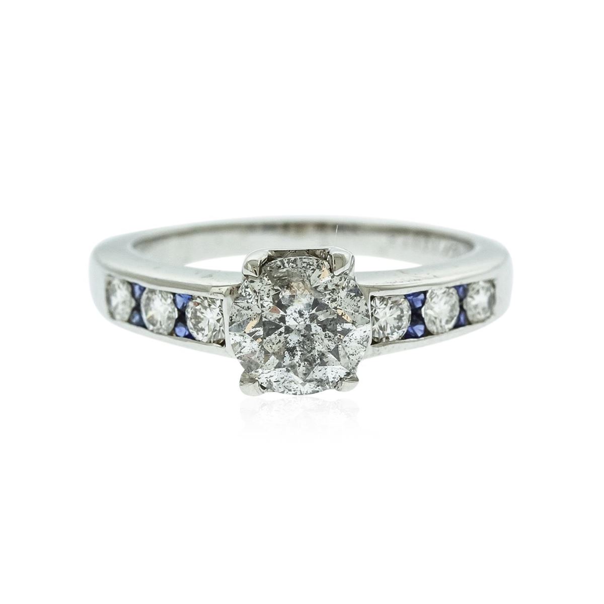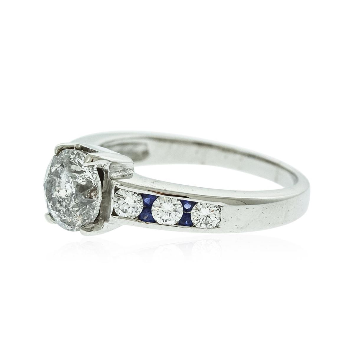 One electronically tested 18KT white gold ladies cast diamond and sapphire ring with a bright polish finish. The featured diamond is supported by diamond and sapphire set shoulders, completed by a two millimeter wide band. Identified with markings of "18K". Condition is good. Containing: One prong set round brilliant cut diamond, measuring 7.10 - 7.08 x 4.70mm (depth est.), 4.00.%. GTCF approximate weight of 1.59ct with a medium blue fluorescence. Naturally occurring internal & external characteristics are present, including natural iridescence. Graded in the setting. Clarity: I-2 . Color: I. Depth 66.3%. Table 56.4%. Six channel set round brilliant cut diamonds, measuring 2.90 - 2.80 x 1.71mm (depth est.) approximate total weight of 6 Stones = 0.60ct. Graded in the setting. Clarity: VVS-1 to VVS-2. Color G - I. Eight channel set round brilliant cut natural blue sapphires, measuring 1.40 - 1.30 x 0.88 mm, approximate total weight of 0.15ct., clarity is eye clean, type II, medium dark, moderately strong, blue color, (GIA B 6/4), cut is good. Transmitting light with no distortion, transparent. Color grade is an average for the group. Graded in the setting. Total Weight of Colored Stones 0.15ct. Total Weight of Diamonds 2.19ct. Total Weight of Ring 5.31 grams. AIG Appraised at $19,335.00.