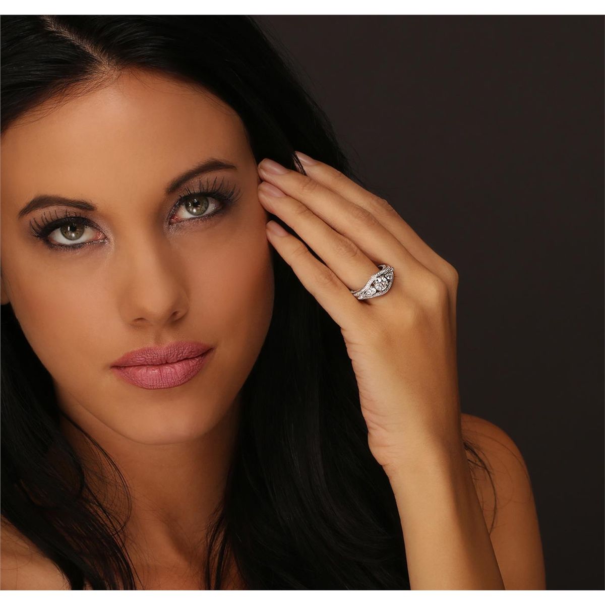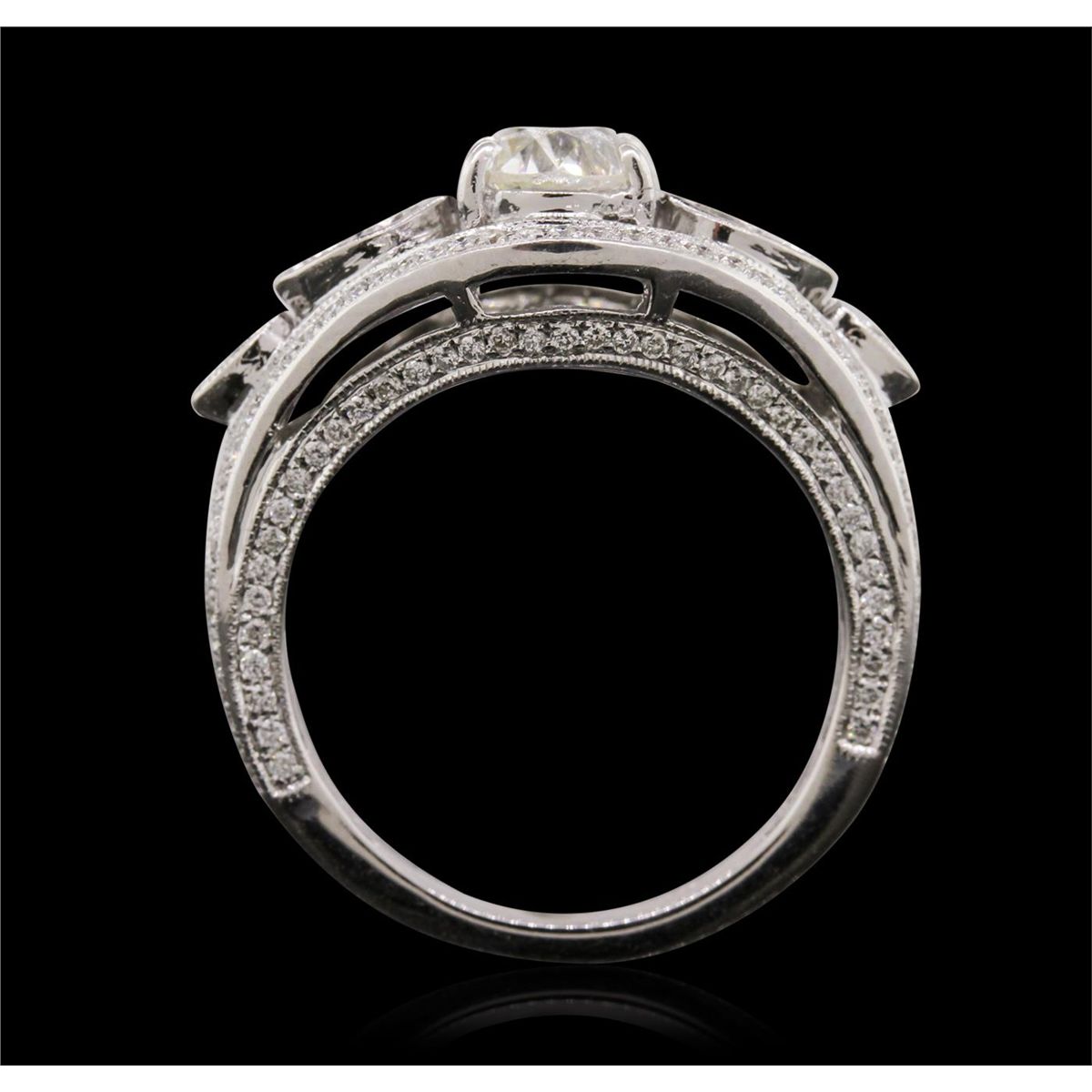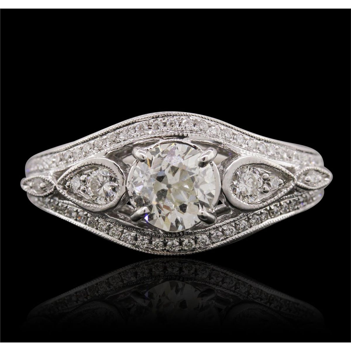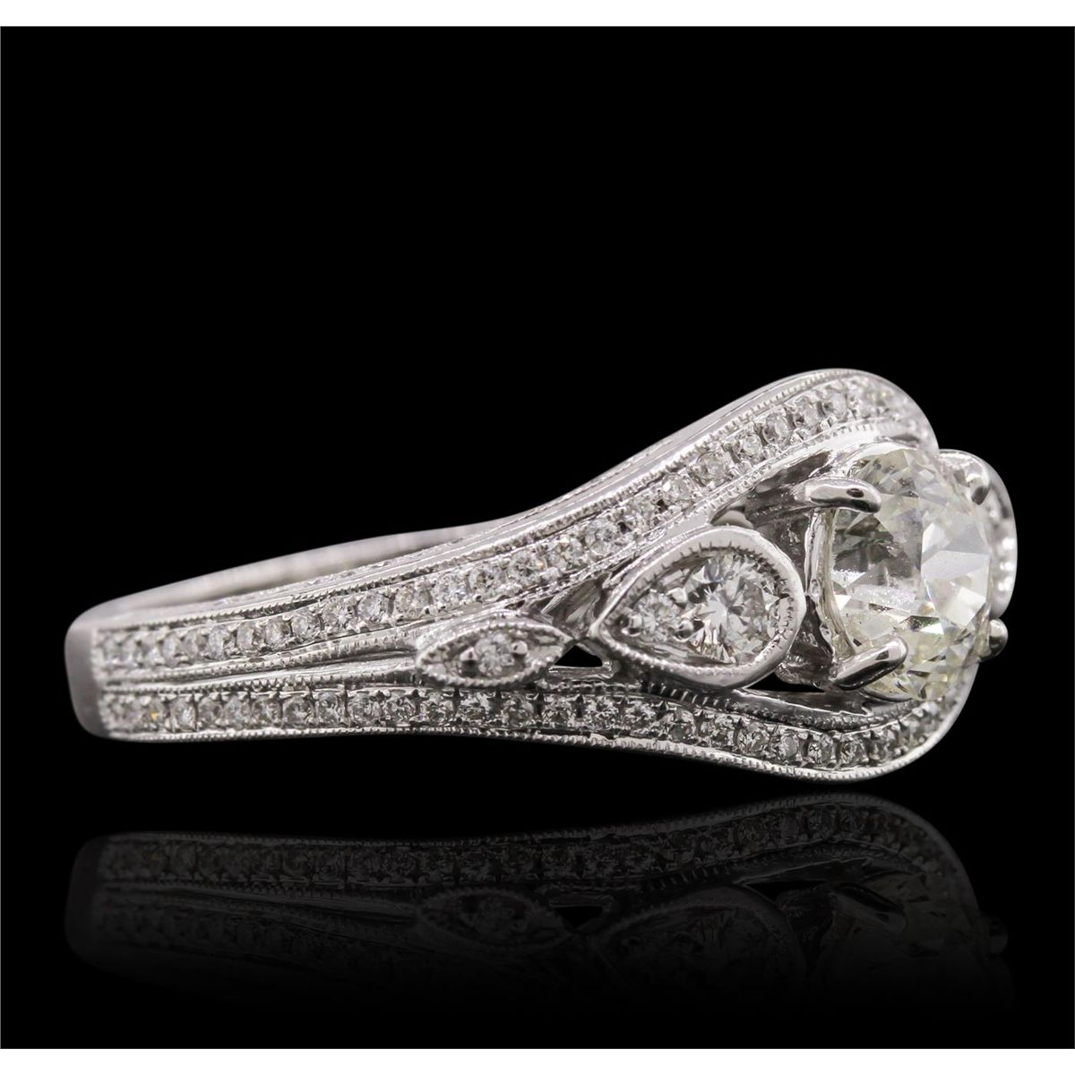 One electronically tested 18KT white gold ladies cast diamond unity ring. The featured diamond is set within mirroring diamond ribbons supported by diamond set shoulders, completed by a three millimeter wide band. Bright polish finish with milgrain detailing. Identified with markings of "750". Condition is good. Containing: One prong set Old European cut diamond, measuring 6.40 - 6.20 x 4.10mm (depth est.) approximate weight of 1.09ct with a faint blue fluorescence. Cutting style circa late 19th century. Graded in the setting. Clarity: SI-1. Color: L Depth 65.1%. Table 46.0%. Two half bezel set round brilliant cut diamonds, measuring 3.10 - 3.00 x 1.83mm (depth est.) approximate. Total Weight of 2 Stones = 0.25ct. Graded in the setting. Clarity: SI-1 to SI-2. Color: G - H One Hundred Seventy-Eight bead set round brilliant cut diamonds, measuring 1.10 - 1.00 x 0.63mm (depth est.) approximate. Total Weight of 178 Stones = 0.85ct. Graded in the setting. Clarity: VS-1 to SI-1. Color: G - I. Total Weight of Diamonds 2.19ct. Total Weight of Ring 7.37 grams. AIG Appraised at $18,080.00.