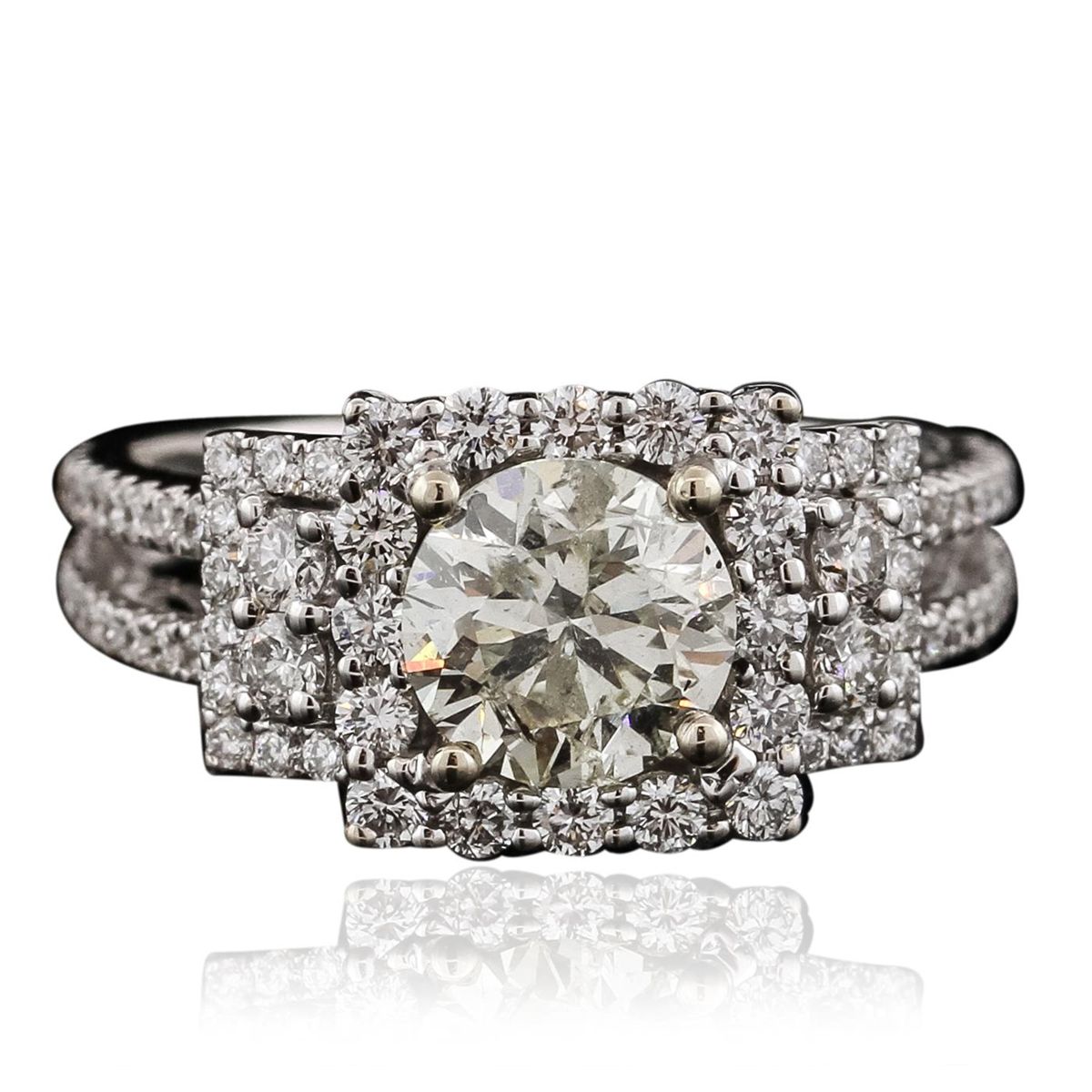 One electronically tested 18KT White Gold ladies cast diamond unity ring with a bright polish finish. The featured diamond is set within a diamond bezel supported by elaborate diamond set split shoulders, completed by a two and one-half millimeter wide band. Identified with markings of "18K 750". Condition is new, good workmanship. Containing: One prong set round brilliant cut diamond, measuring 6.85 - 6.80 x 4.45mm (depth est.) approximate weight of 1.36ct with a strong blue fluorescence. Graded in the setting. Clarity: I-1. Color: M. Depth 65.3%. Table 58.7%. Eighty prong set round brilliant cut diamonds approximate total weight of 80 Stones = 0.83ct. Graded in the setting. Clarity: VS-1 to SI-1. Color: G - I. Total Weight of Diamonds 2.19ct. Total Weight of Unity Ring 5.52 grams. AIG Appraised at $17,610.00.