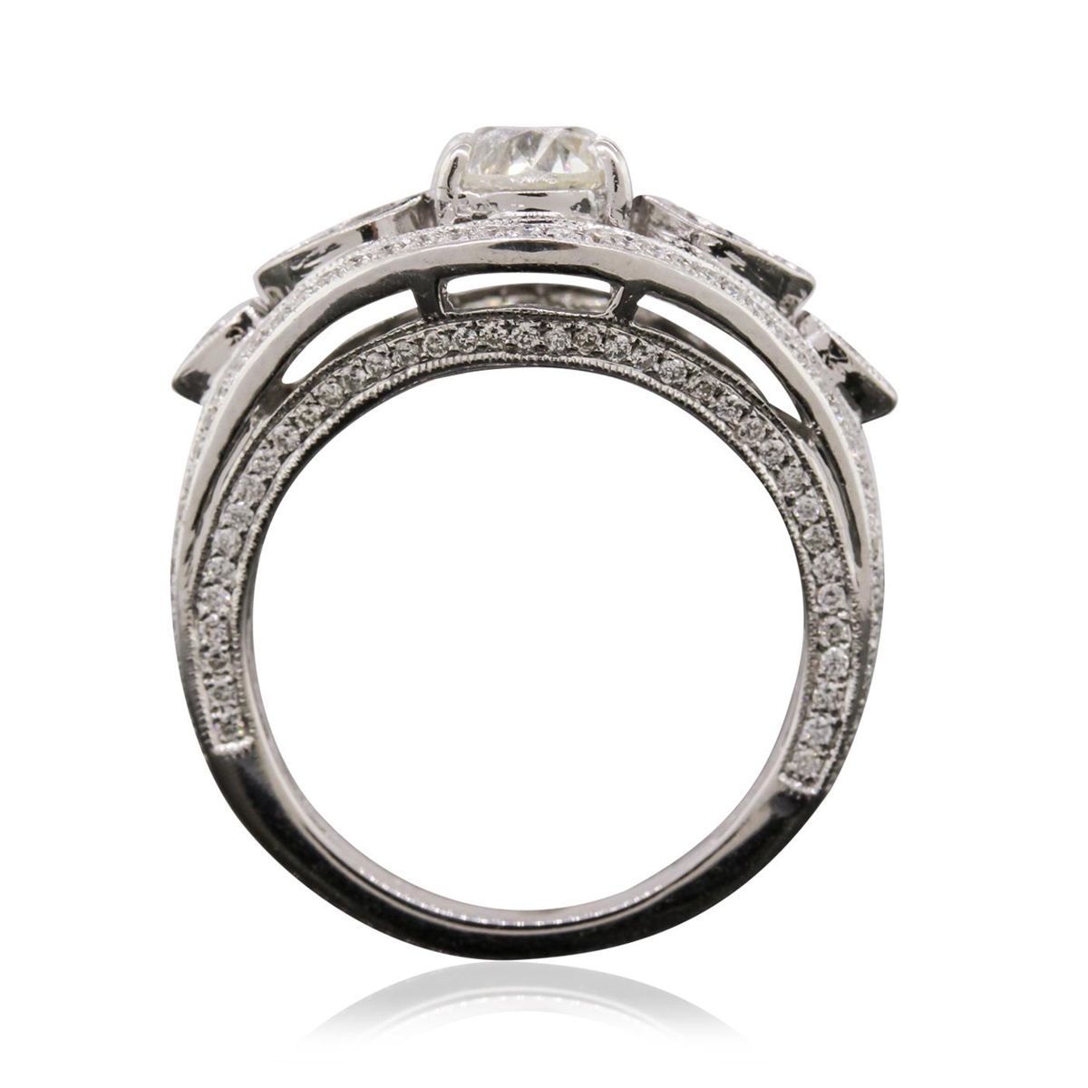 One electronically tested 18KT white gold ladies cast diamond unity ring. The featured diamond is set within mirroring diamond ribbons supported by diamond set shoulders, completed by a three millimeter wide band. Bright polish finish with milgrain detailing. Identified with markings of "750". Condition is good. Containing: One prong set Old European cut diamond, measuring 6.40 - 6.20 x 4.10mm (depth est.) approximate weight of 1.09ct with a faint blue fluorescence. Cutting style circa late 19th century. Graded in the setting. Clarity: SI-1. Color: L Depth 65.1%. Table 46.0%. Two half bezel set round brilliant cut diamonds, measuring 3.10 - 3.00 x 1.83mm (depth est.) approximate. Total Weight of 2 Stones = 0.25ct. Graded in the setting. Clarity: SI-1 to SI-2. Color: G - H One Hundred Seventy-Eight bead set round brilliant cut diamonds, measuring 1.10 - 1.00 x 0.63mm (depth est.) approximate. Total Weight of 178 Stones = 0.85ct. Graded in the setting. Clarity: VS-1 to SI-1. Color: G - I. Total Weight of Diamonds 2.19ct. Total Weight of Ring 7.37 grams. AIG Appraised at $18,080.00.
