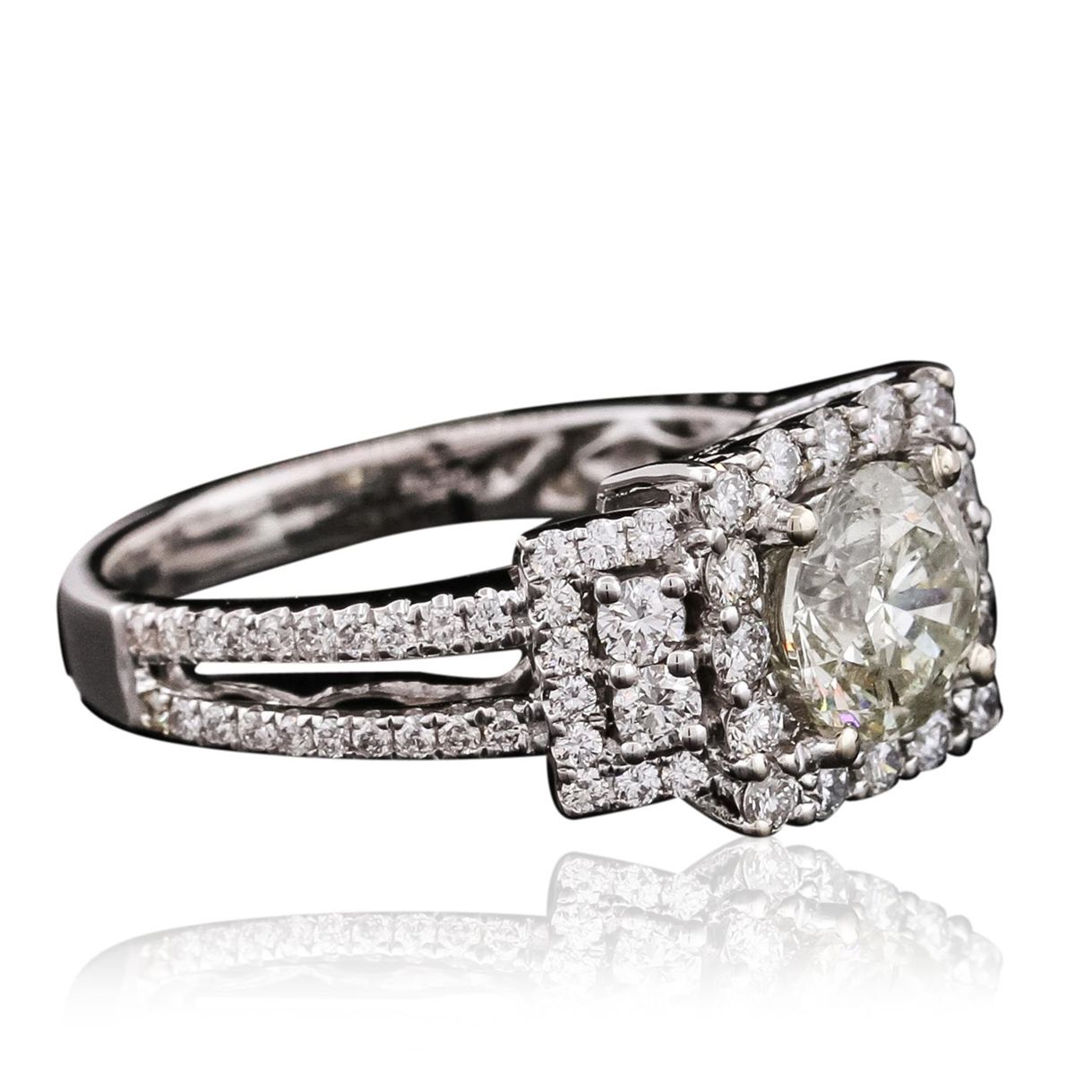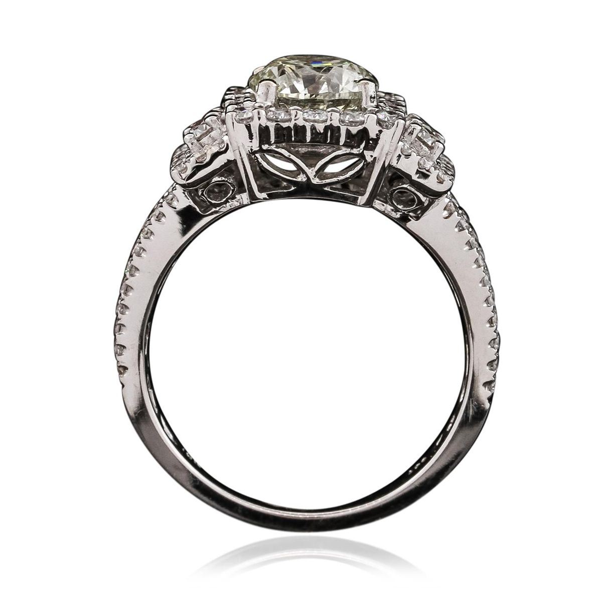 One electronically tested 18KT White Gold ladies cast diamond unity ring with a bright polish finish. The featured diamond is set within a diamond bezel supported by elaborate diamond set split shoulders, completed by a two and one-half millimeter wide band. Identified with markings of "18K 750". Condition is new, good workmanship. Containing: One prong set round brilliant cut diamond, measuring 6.85 - 6.80 x 4.45mm (depth est.) approximate weight of 1.36ct with a strong blue fluorescence. Graded in the setting. Clarity: I-1. Color: M. Depth 65.3%. Table 58.7%. Eighty prong set round brilliant cut diamonds approximate total weight of 80 Stones = 0.83ct. Graded in the setting. Clarity: VS-1 to SI-1. Color: G - I. Total Weight of Diamonds 2.19ct. Total Weight of Unity Ring 5.52 grams. AIG Appraised at $17,610.00.