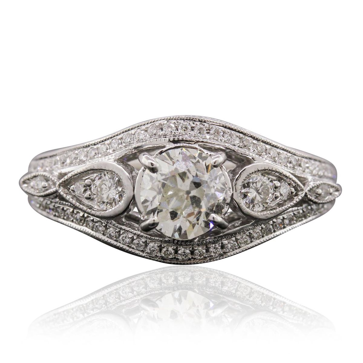 One electronically tested 18KT white gold ladies cast diamond unity ring. The featured diamond is set within mirroring diamond ribbons supported by diamond set shoulders, completed by a three millimeter wide band. Bright polish finish with milgrain detailing. Identified with markings of "750". Condition is good. Containing: One prong set Old European cut diamond, measuring 6.40 - 6.20 x 4.10mm (depth est.) approximate weight of 1.09ct with a faint blue fluorescence. Cutting style circa late 19th century. Graded in the setting. Clarity: SI-1. Color: L Depth 65.1%. Table 46.0%. Two half bezel set round brilliant cut diamonds, measuring 3.10 - 3.00 x 1.83mm (depth est.) approximate. Total Weight of 2 Stones = 0.25ct. Graded in the setting. Clarity: SI-1 to SI-2. Color: G - H One Hundred Seventy-Eight bead set round brilliant cut diamonds, measuring 1.10 - 1.00 x 0.63mm (depth est.) approximate. Total Weight of 178 Stones = 0.85ct. Graded in the setting. Clarity: VS-1 to SI-1. Color: G - I. Total Weight of Diamonds 2.19ct. Total Weight of Ring 7.37 grams. AIG Appraised at $18,080.00.
