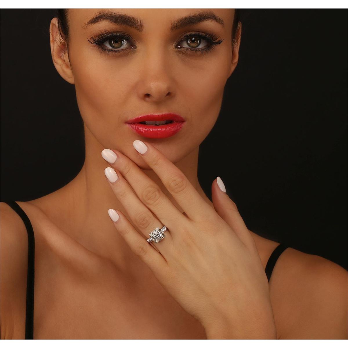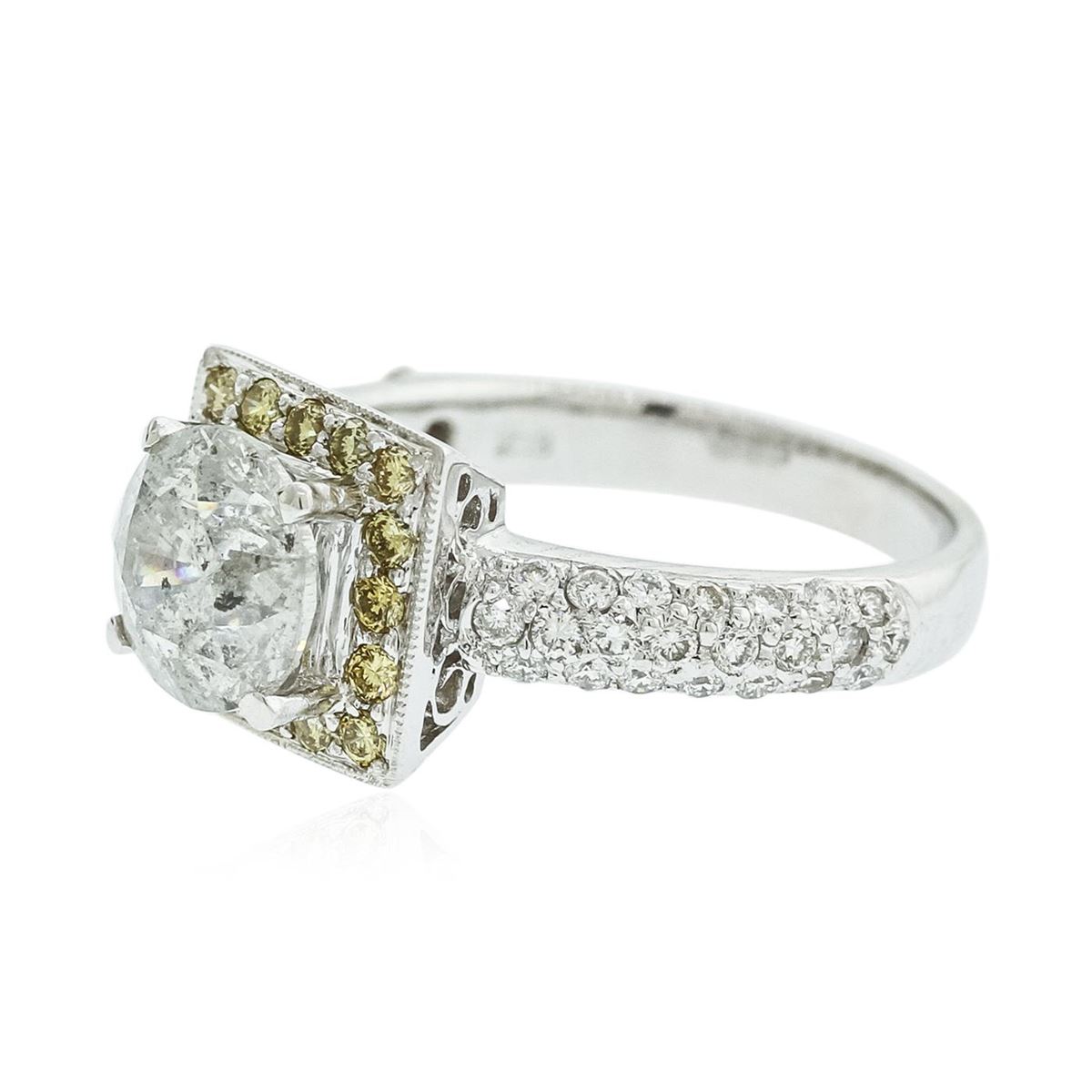 One electronically tested 18KT white gold Ladies combination cast & assembled engagement ring with a bright polish finish. Condition is new. Identified with markings of "18K". Containing: One prong set round brilliant cut diamond, measuring 7.40 - 7.40 x 4.80mm (depth est.) approximate weight of 1.60ct. Clarity: I-3. Color: I, Cut is Good. Forty-Four bead set round brilliant cut diamonds, measuring 1.50 - 1.40 x 0.87mm (depth est.) approximate. Total Weight of 44 Stones = 0.40ct. Clarity: SI-1 to I-1. Color: I - J, Cut is Good. Sixteen bead set round brilliant cut diamonds, measuring 1.50 - 1.50 x 0.90mm (depth est.) approximate. Total Weight of 16 Stones = 0.20ct. Clarity: VS-2, Cut is Good. Color of the stones has been enhanced. Total Weight of Diamonds 2.20ct. Total Weight of Ring 4.80 grams. GGL Appraised at $13,430.00.