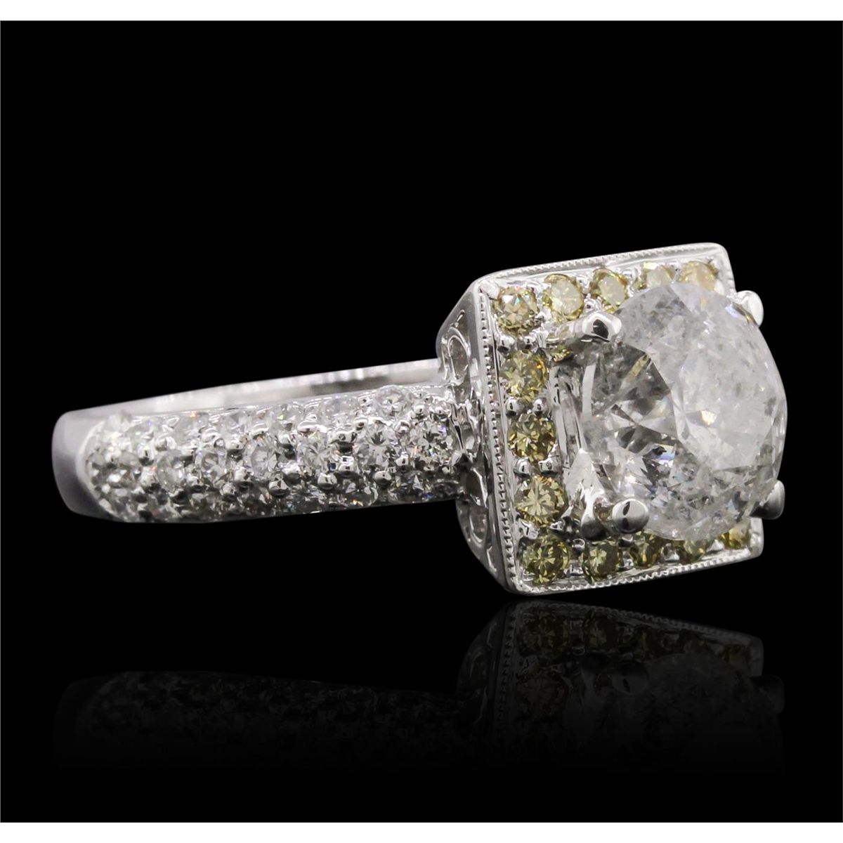 One electronically tested 18KT white gold Ladies combination cast & assembled engagement ring with a bright polish finish. Condition is new. Identified with markings of "18K". Containing: One prong set round brilliant cut diamond, measuring 7.40 - 7.40 x 4.80mm (depth est.) approximate weight of 1.60ct. Clarity: I-3. Color: I, Cut is Good. Forty-Four bead set round brilliant cut diamonds, measuring 1.50 - 1.40 x 0.87mm (depth est.) approximate. Total Weight of 44 Stones = 0.40ct. Clarity: SI-1 to I-1. Color: I - J, Cut is Good. Sixteen bead set round brilliant cut diamonds, measuring 1.50 - 1.50 x 0.90mm (depth est.) approximate. Total Weight of 16 Stones = 0.20ct. Clarity: VS-2, Cut is Good. Color of the stones has been enhanced. Total Weight of Diamonds 2.20ct. Total Weight of Ring 4.80 grams. GGL Appraised at $13,430.00.