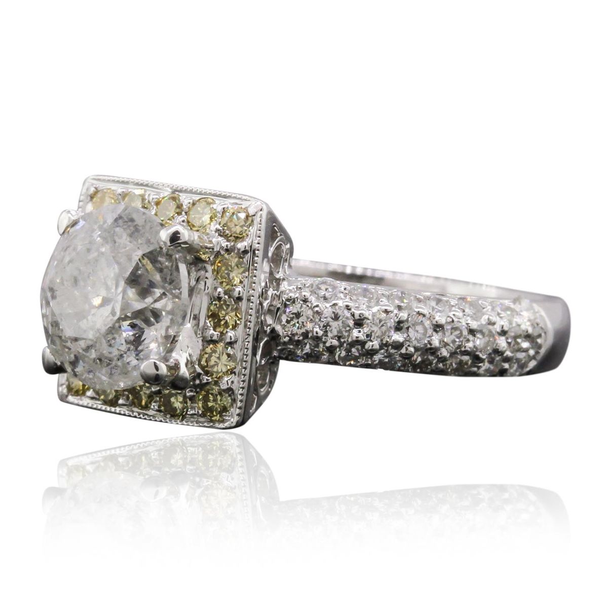 One electronically tested 18KT white gold Ladies combination cast & assembled engagement ring with a bright polish finish. Condition is new. Identified with markings of "18K". Containing: One prong set round brilliant cut diamond, measuring 7.40 - 7.40 x 4.80mm (depth est.) approximate weight of 1.60ct. Clarity: I-3. Color: I, Cut is Good. Forty-Four bead set round brilliant cut diamonds, measuring 1.50 - 1.40 x 0.87mm (depth est.) approximate. Total Weight of 44 Stones = 0.40ct. Clarity: SI-1 to I-1. Color: I - J, Cut is Good. Sixteen bead set round brilliant cut diamonds, measuring 1.50 - 1.50 x 0.90mm (depth est.) approximate. Total Weight of 16 Stones = 0.20ct. Clarity: VS-2, Cut is Good. Color of the stones has been enhanced. Total Weight of Diamonds 2.20ct. Total Weight of Ring 4.80 grams. GGL Appraised at $13,430.00.