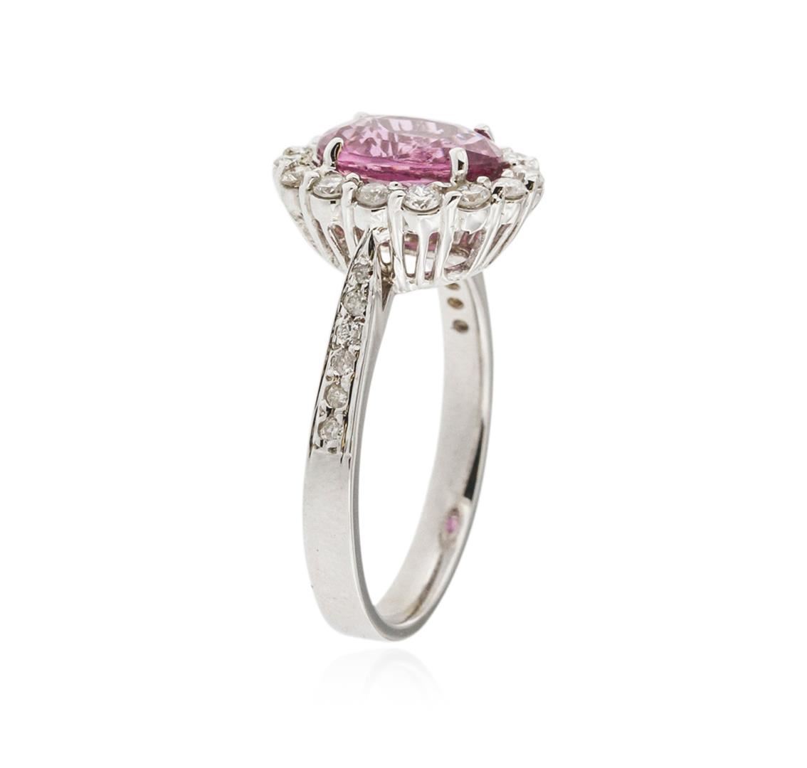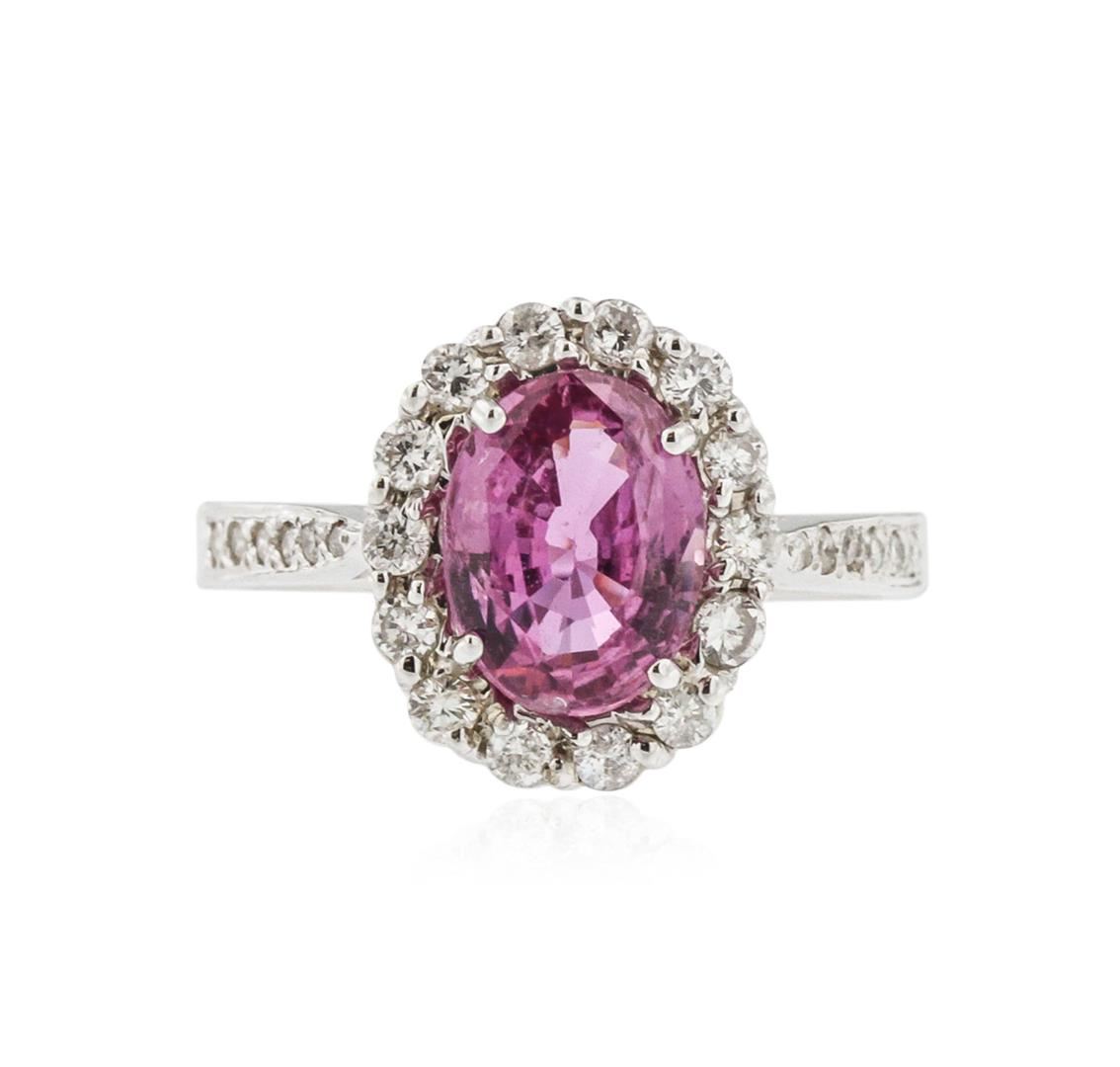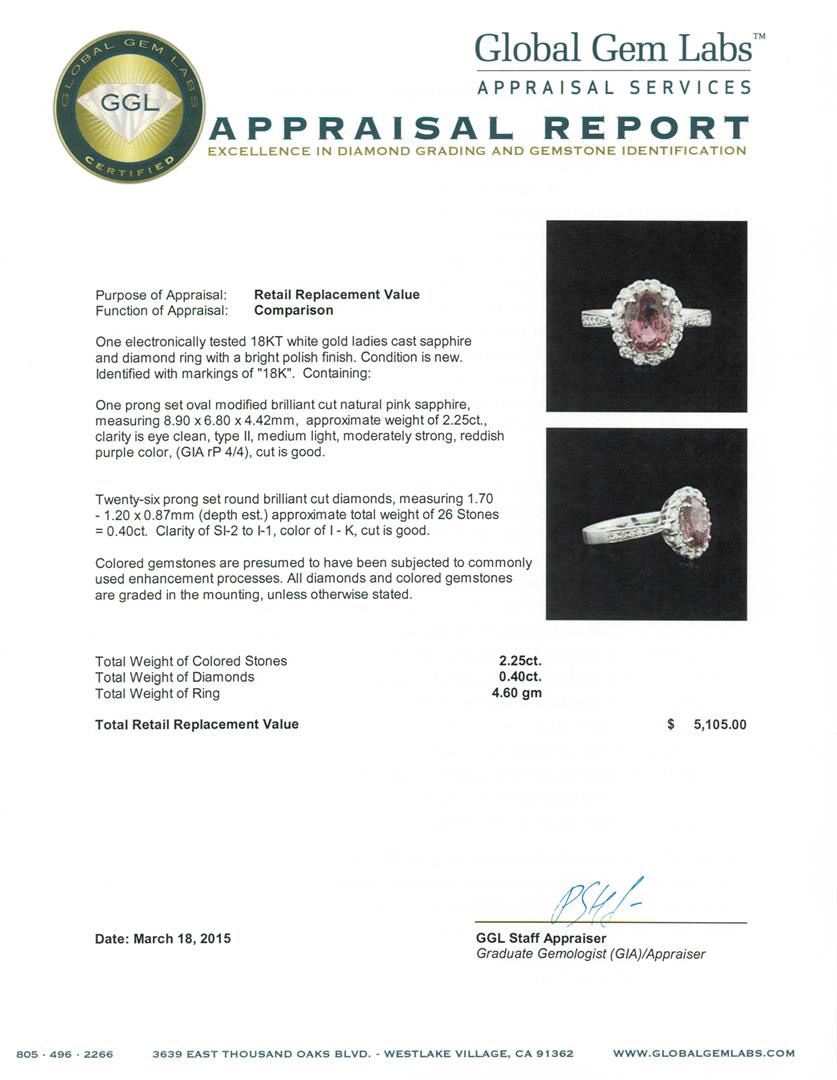 One electronically tested 18KT white gold ladies cast sapphire and diamond ring with a bright polish finish. Identified with markings of "18K". Condition is new. Containing: One prong set oval modified brilliant cut natural pink sapphire, measuring 8.90 x 6.80 x 4.42mm, approximate weight of 2.25ct., clarity is eye clean, type II, medium light, moderately strong, reddish purple color, (GIA rP 4/4), cut is good. Twenty-Six prong set round brilliant cut diamonds, measuring 1.70 - 1.20 x 0.87mm (depth est.) approximate total weight of 26 Stones = 0.40ct. Clarity of SI-2 to I-1, Color of I - K, Cut is Good. Colored gemstones are presumed to have been subjected to commonly used enhancement processes. All diamonds and colored gemstones are graded in the mounting, unless otherwise stated. Total Weight of Colored Stones 2.25ct. Total Weight of Diamonds 0.40ct. Total Weight of Ring 4.60 grams. GGL Appraised at $5,105.00.