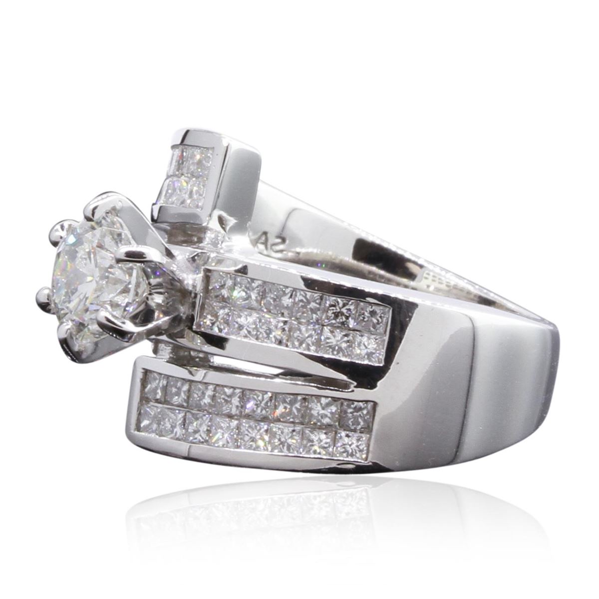 One electronically tested 18KT white gold Ladies combination cast & assembled engagement ring with a bright polish finish. Identified with markings of "18K". Condition is new. Containing: One prong set round brilliant cut diamond, measuring 6.40 - 6.20 x 3.78mm (depth est.) approximate weight of 0.96ct. Clarity of SI-2, Color of J, Cut is Very Good. Fifty-Six invisible set princess cut diamonds, measuring 1.50 x 1.50 x 1.13mm (depth est.) approximate total weight of 56 Stones = 1.30ct. Clarity of SI-1 to SI-2, Color of H - I, Cut is Very Good. Total Weight of Diamonds 2.26ct. Total Weight of Ring 13.10gm. GGL Appraised at $23,665.00.