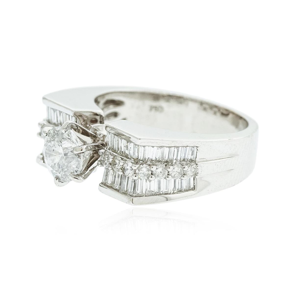 One electronically tested 18KT white gold ladies cast & assembled diamond unity ring with a bright polish finish. Condition is new, good workmanship. The featured diamond is supported by elaborate diamond set shoulders, completed by a four millimeter wide band. Identified with markings of "750". Containing: One prong set round brilliant cut diamond, measuring 6.05 - 6.00 x 4.10mm (depth est.) approximate weight of 1.00ct with a medium blue fluorescence. Graded in the setting. Clarity: I-2. Color: G Depth 68.0%. Table 56.4%. Fourteen prong set round brilliant cut diamonds, measuring 1.80 - 1.70 x 1.05mm (depth est.) approximate. Total Weight of 14 Stones = 0.37ct. Graded in the setting. Clarity: SI-2 to I-2. Color: H - J Forty-Eight channel set baguette cut diamonds, measuring from 1.90 x 1.10 x 0.77mm (depth est.) to 2.20 x 1.20 x 0.84mm (depth est.) approximate. Total Weight of 48 Stones = 0.93ct. Graded in the setting. Clarity: VS-2 to SI-2. Color: G - I. Total Weight of Diamonds 2.30ct. Total Weight of Ring 10.30 grams. AIG Appraised at $15,570.00.