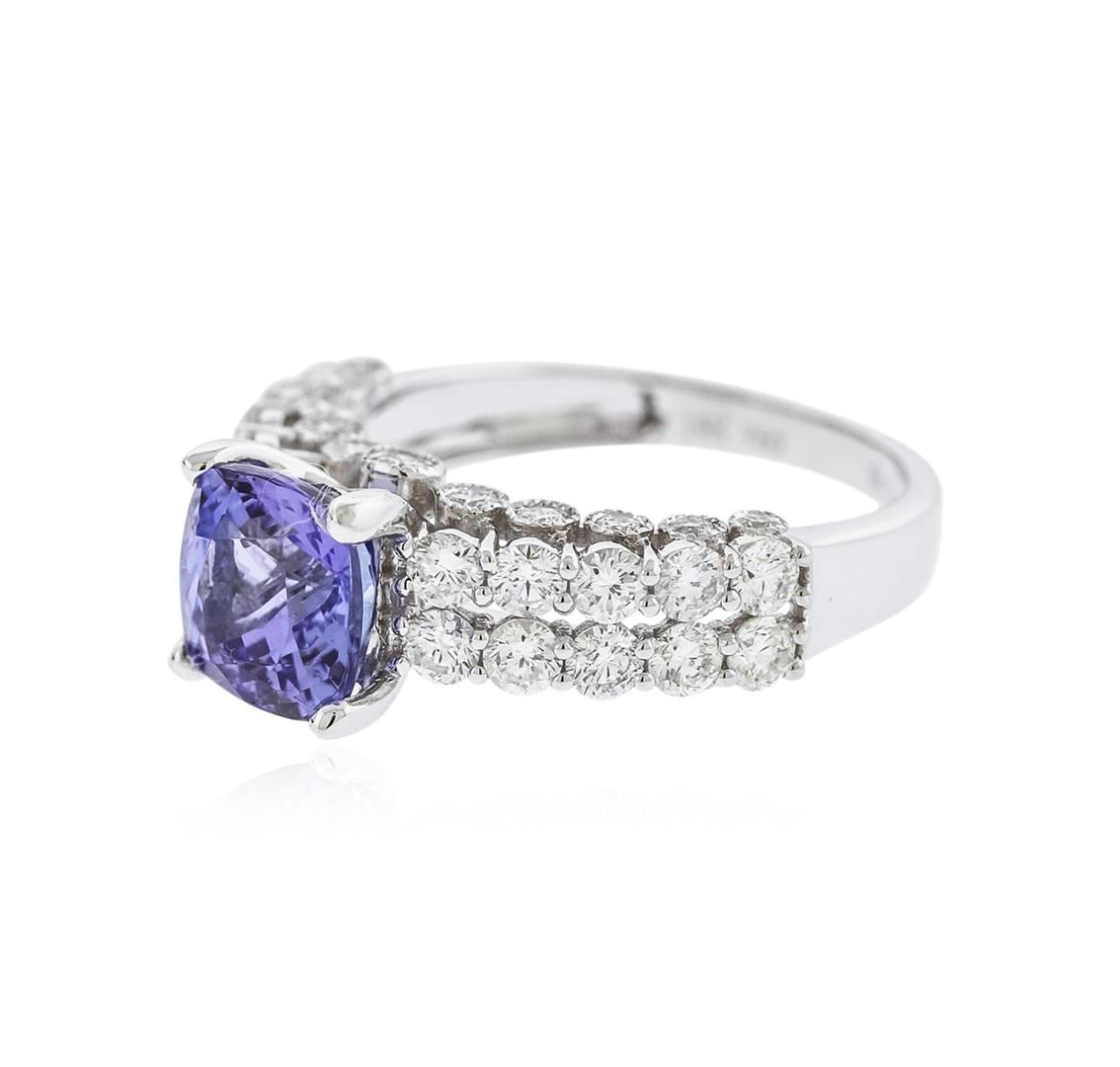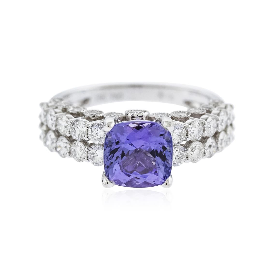 One electronically tested 18KT white gold ladies cast tanzanite and diamond ring with a bright polish finish. Identified with markings of "750". Condition is new. Containing: One prong set square modified brilliant cut natural tanzanite, measuring 7.50 x 7.50 x 4.88mm, approximate weight of 2.30ct., clarity is eye clean, type I, medium, very slightly grayish, violet color, (GIA V 5/3), cut is good. Forty-Two prong set round brilliant cut diamonds, measuring 2.50 - 1.30 x 1.14mm (depth est.) approximate total weight of 42 Stones = 1.05ct. Clarity: SI-1 to SI-2. Color: H - I, Cut is Good. Colored gemstones are presumed to have been subjected to commonly used enhancement processes. All diamonds and colored gemstones are graded in the mounting, unless otherwise stated. Total Weight of Colored Stones 2.30ct. Total Weight of Diamonds 1.05ct. Total Weight of Ring 4.50 grams. GGL Appraised at $4,535.00.