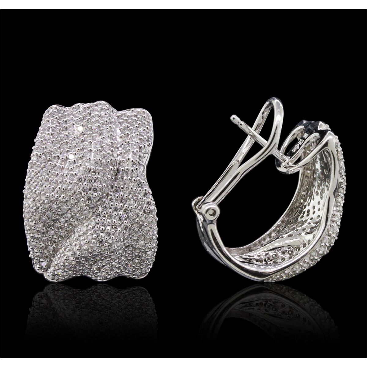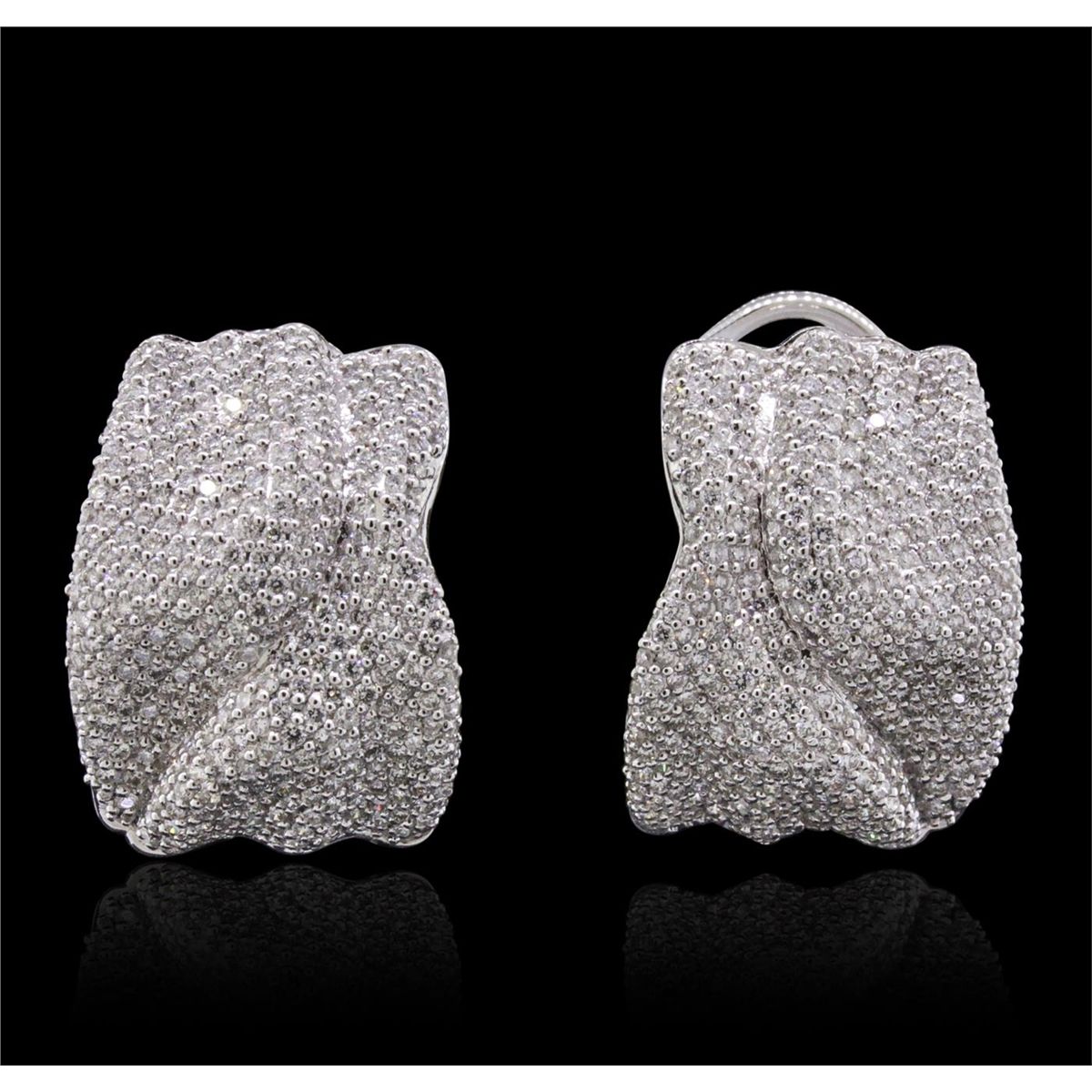 One pair electronically tested 18KT white gold ladies combination cast & assembled diamond earrings with Omega clip backs with posts with a bright polish finish. Identified with markings of "18K 750". Condition is new. Containing: Four Hundred Sixty prong set round brilliant cut diamonds, measuring 1.00 - 1.00 x 0.60mm (depth est.) approximate total weight of 460 Stones = 2.30ct. . Clarity: I-1 to I-2. Color: I - J, Cut is Good. All diamonds are graded in the mounting, unless otherwise stated.. Total Weight of Diamonds 2.30ct.. Total Weight of Earrings 10.50 grams. GGL Appraised at $12,310.00.