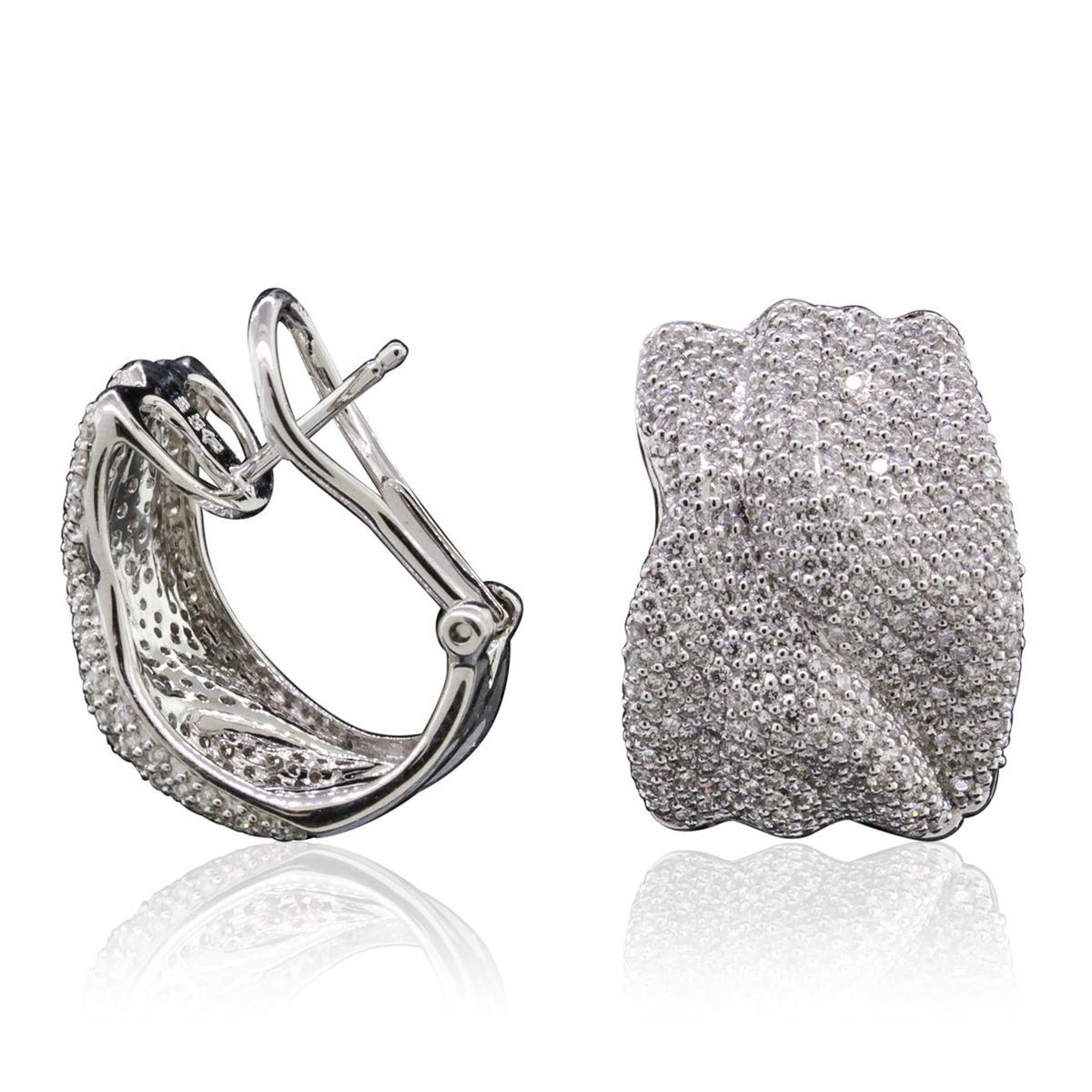 One pair electronically tested 18KT white gold ladies combination cast & assembled diamond earrings with Omega clip backs with posts with a bright polish finish. Identified with markings of "18K 750". Condition is new. Containing: Four Hundred Sixty prong set round brilliant cut diamonds, measuring 1.00 - 1.00 x 0.60mm (depth est.) approximate total weight of 460 Stones = 2.30ct. . Clarity: I-1 to I-2. Color: I - J, Cut is Good. All diamonds are graded in the mounting, unless otherwise stated.. Total Weight of Diamonds 2.30ct.. Total Weight of Earrings 10.50 grams. GGL Appraised at $12,310.00.