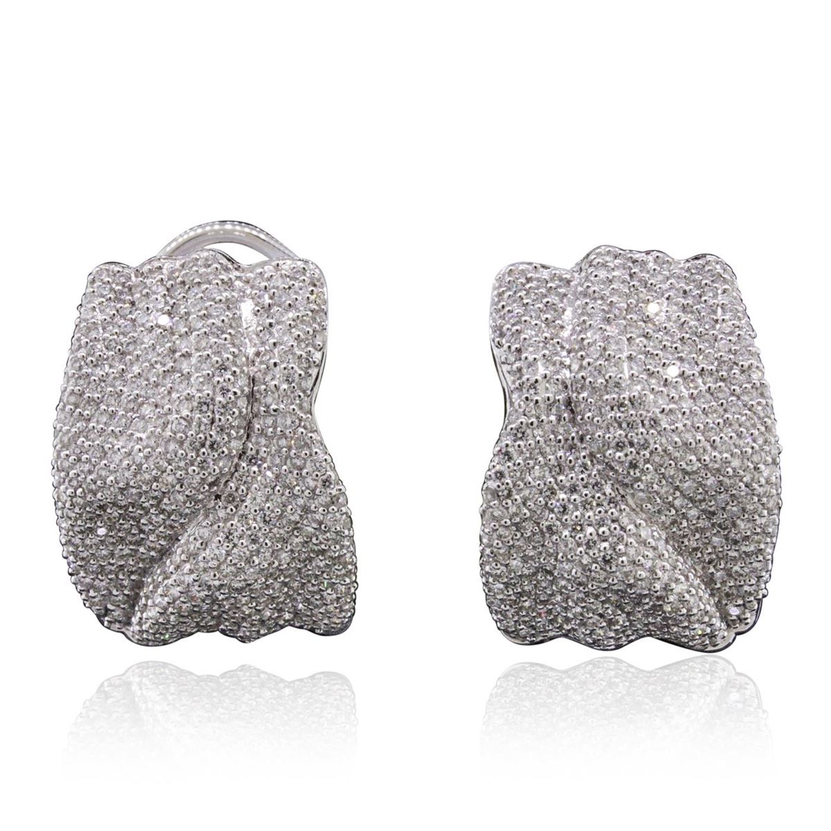 One pair electronically tested 18KT white gold ladies combination cast & assembled diamond earrings with Omega clip backs with posts with a bright polish finish. Identified with markings of "18K 750". Condition is new. Containing: Four Hundred Sixty prong set round brilliant cut diamonds, measuring 1.00 - 1.00 x 0.60mm (depth est.) approximate total weight of 460 Stones = 2.30ct. . Clarity: I-1 to I-2. Color: I - J, Cut is Good. All diamonds are graded in the mounting, unless otherwise stated.. Total Weight of Diamonds 2.30ct.. Total Weight of Earrings 10.50 grams. GGL Appraised at $12,310.00.