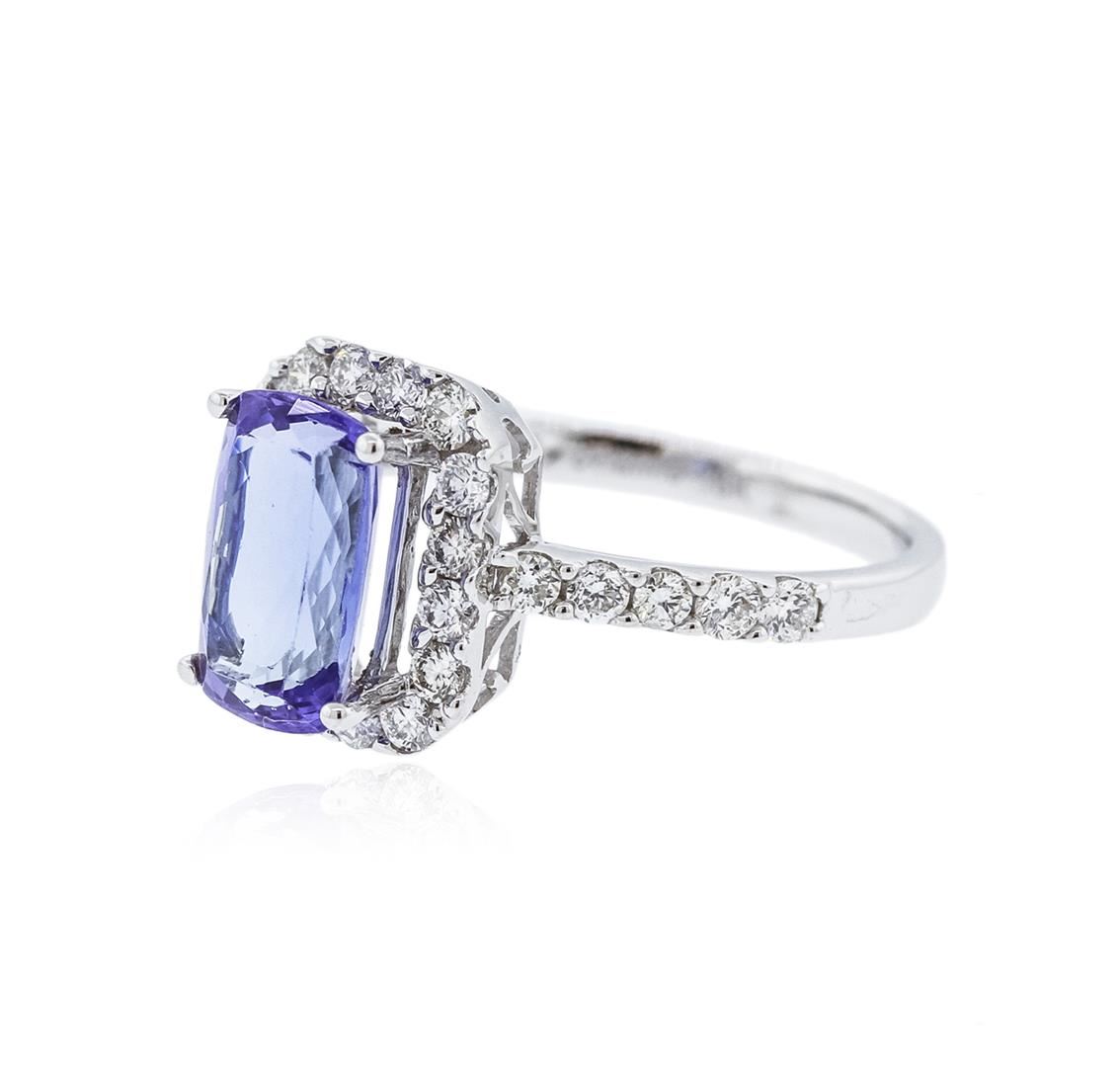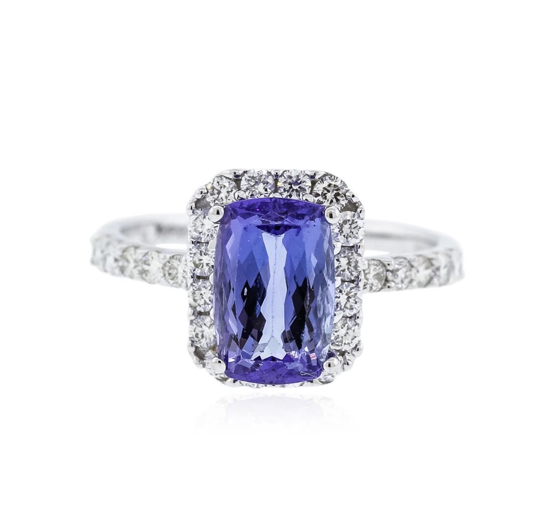 One electronically tested 18KT white gold ladies cast tanzanite and diamond ring with a flat shank with a bright polish finish. Trademark is Orianne. Identified with markings of "18K". Condition is new. Containing: One prong set rectangular cushion modified brilliant cut natural tanzanite, measuring 9.77 x 6.60 x 4.55mm, approximate weight of 2.31ct., clarity is eye clean, type I, medium light, very slightly grayish, violet color, (GIA V 4/3), cut is good. Twenty-Six prong set round brilliant cut diamonds, measuring 1.60 - 1.60 x 0.96mm (depth est.) approximate total weight of 26 Stones = 0.39ct. Clarity: SI-1 to I-1. Color: I - J. All diamonds and colored gemstones are graded in the mounting, unless otherwise stated. Colored gemstones are presumed to have been subjected to commonly used enhancement processes. Total Weight of Colored Stones 2.31ct. Total Weight of Diamonds 0.39ct. Total Weight of Ring 3.30 grams. GGL Appraised at $3,460.00.