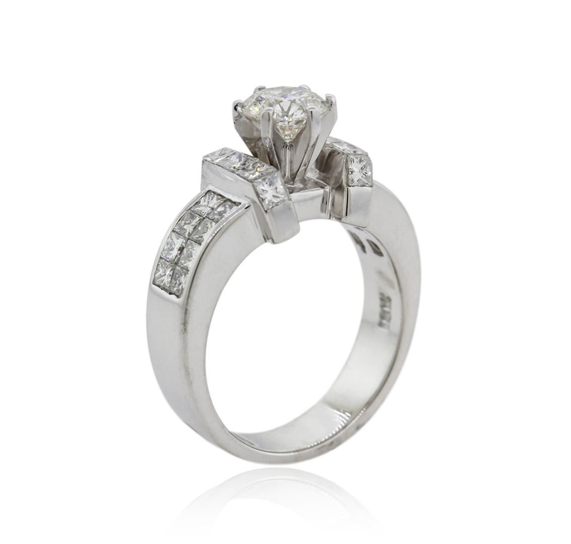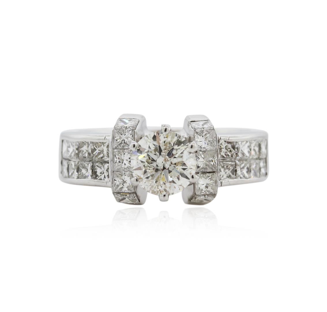 One electronically tested 18KT white gold ladies cast diamond engagement ring with a bright polish finish. Identified with markings of "18K". Condition is new. Containing: One prong set round brilliant cut diamond, measuring 6.50 - 6.50 x 4.07mm (depth est.) approximate weight of 1.05ct. Clarity: I-1. Color: K, Cut is Good. Twenty-Six channel set princess cut diamonds, measuring 2.00 x 2.00 x 1.50mm (depth est.) approximate total weight of 26 Stones = 1.28ct. Clarity: VS-2 to SI-1. Color: H - I, Cut is Good. All diamonds are graded in the mounting, unless otherwise stated. Total Weight of Diamonds 2.33ct. Total Weight of Engagement Ring 10.10 grams. GGL Appraised at $11,955.00.