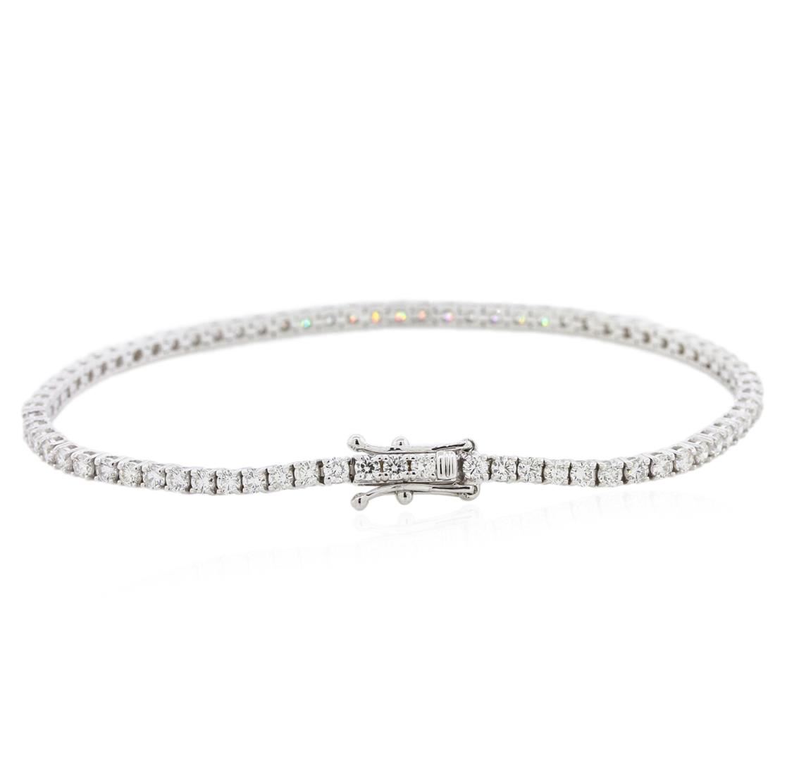 One electronically tested 18KT white gold ladies combination cast & assembled diamond tennis bracelet with a hidden box clasp with safety closer with a bright polish finish. Bracelet measures 7" long. Identified with markings of "750". Condition is new. Containing: Seventy-Five prong set round brilliant cut diamonds, measuring 2.00 - 2.00 x 1.28mm (depth est.) approximate total weight of 75 Stones = 2.34ct. Clarity: SI-1 to SI-2. Color: I - J, Cut is Good. Diamonds are graded in the mounting, unless otherwise stated. Total Weight of Diamonds 2.34ct. Total Weight of Tennis Bracelet 7.00 grams. GGL Appraised at $4,850.00.