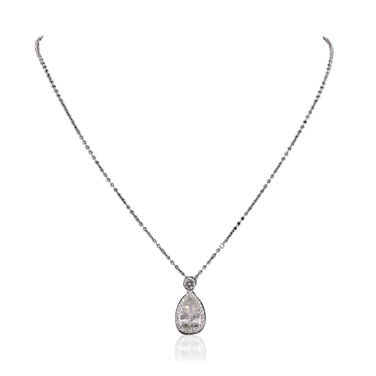 One electronically tested 18KT white gold ladies cast & assembled diamond pendant with chain. Condition is new, good workmanship. The pendant features a diamond set within a diamond bezel, completed by a diamond set hidden bail. The pendant is supported by a sixteen inch length 18KT white gold designer style chain, terminating in a lobster claw clasp. Containing: One bezel set pear shaped cut diamond, measuring 11.00 x 6.70 x 3.90mm (depth est.) approximate weight of 1.84ct with a faint blue fluorescence. Graded in the setting. Clarity: SI-2. Color: J Depth 58.2%. Table 71.6%. One bezel set round brilliant cut diamond, measuring 3.70 - 3.70 x 2.22mm (depth est.) approximate weight of 0.19ct. Graded in the setting. Clarity: SI-2. Color: H Sixty prong set round brilliant cut diamonds, measuring 1.10 - 1.10 x 0.66mm (depth est.) approximate. Total Weight of 60 Stones = 0.31ct. Graded in the setting. Clarity: VVS-2 to VS-2. Color: G - H. Total Weight of Diamonds 2.34ct. Total Weight of Pendant With Chain 4.62 grams. AIG Appraised at $33,300.00.