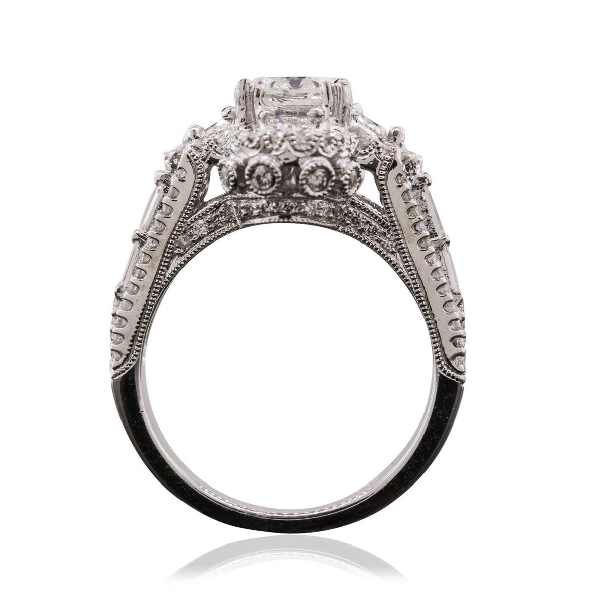 One electronically tested 18KT white gold Ladies combination cast & assembled engagement ring with a bright polish finish. Condition is new. Identified with markings of "18K". Containing: One prong set round brilliant cut diamond, measuring 6.50 - 6.40 x 4.15mm (depth est.) approximate weight of 1.05ct. Clarity: I-1. Color: K, Cut is Good. Four prong set half moon cut diamonds, measuring 2.30 x 2.00 x 1.50mm (depth est.) approximate. Total Weight of 4 Stones = 0.50ct. Clarity: SI-1. Color: I, Cut is Good. Four prong set baguette cut diamonds, measuring 2.90 x 1.50 x 1.28mm (depth est.) approximate. Total Weight of 4 Stones = 0.20ct. Clarity: VS-1. Color: J - K, Cut is Good. One Hundred Twenty-Two prong set round brilliant cut diamonds, measuring 1.10 - 1.10 x 0.66mm (depth est.) approximate. Total Weight of 122 Stones = 0.59ct. Clarity: I-1 to I-2. Color: I - J, Cut is Good. Total Weight of Diamonds 2.34ct. Total Weight of Engagement Ring 9.00 grams. GGL Appraised at $18,480.00.