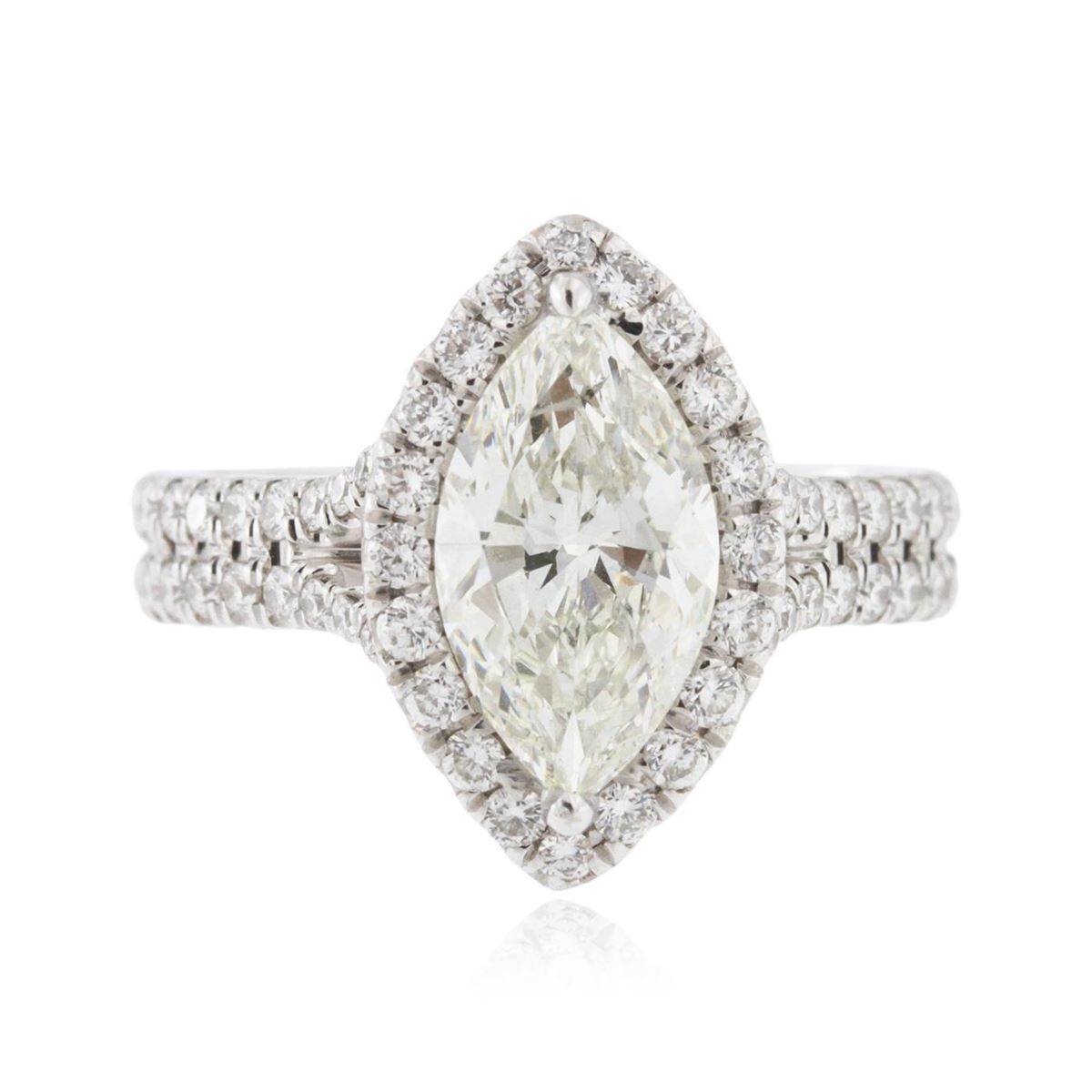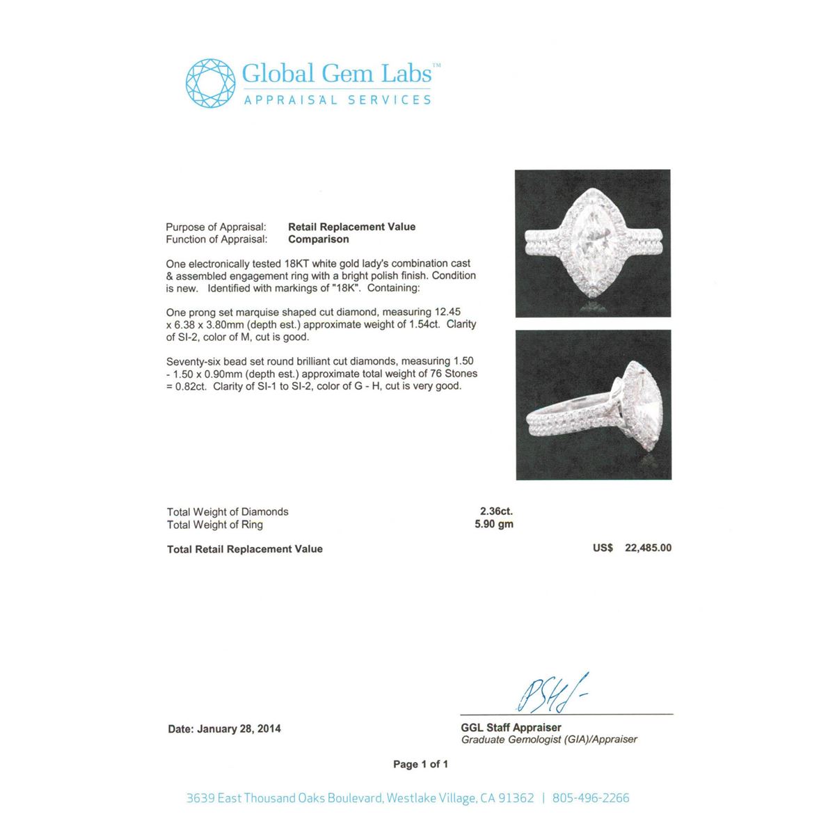 One electronically tested 18KT white gold Ladies combination cast & assembled engagement ring with a bright polish finish. Identified with markings of "18K". Condition is new. Containing: One prong set marquise shaped cut diamond, measuring 12.45 x 6.38 x 3.80mm (depth est.) approximate weight of 1.54ct. Clarity of SI-2, Color of M, Cut is Good. Seventy-Six bead set round brilliant cut diamonds, measuring 1.50 - 1.50 x 0.90mm (depth est.) approximate total weight of 76 Stones = 0.82ct. Clarity of SI-1 to SI-2, Color of G - H, Cut is Very Good. Total Weight of Diamonds 2.36ct. Total Weight of Ring 5.90gm. GGL Appraised at $22,485.00.
