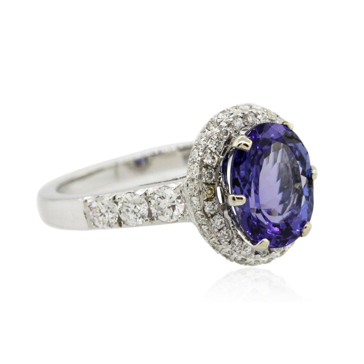 One electronically tested 18KT white gold ladies combination cast & assembled engagement ring with a bright polish finish. Identified with markings of "18K". Condition is new. Containing: One prong set oval modified brilliant cut natural tanzanite, measuring 9.50 x 7.50 x 4.88mm, approximate weight of 2.36ct., clarity is eye clean, type I, medium, moderately strong, violetish blue color, (GIA vB 5/4), cut is good. Six prong set round brilliant cut diamonds, measuring 2.60 - 2.60 x 1.56mm (depth est.) approximate total weight of 6 Stones = 0.39ct. Clarity: SI-1. Color: H, Cut is Good. Fifty-Six prong set round brilliant cut diamonds, measuring 1.10 - 1.10 x 0.66mm (depth est.) approximate total weight of 56 Stones = 0.27ct. Clarity: SI-2 to I-1. Color: H - I, Cut is Good. Colored gemstones are presumed to have been subjected to commonly used enhancement processes. All diamonds and colored gemstones are graded in the mounting, unless otherwise stated. Total Weight of Colored Stones 2.36ct. Total Weight of Diamonds 0.66ct. Total Weight of Ring 5.20 grams. GGL Appraised at $8,340.00.