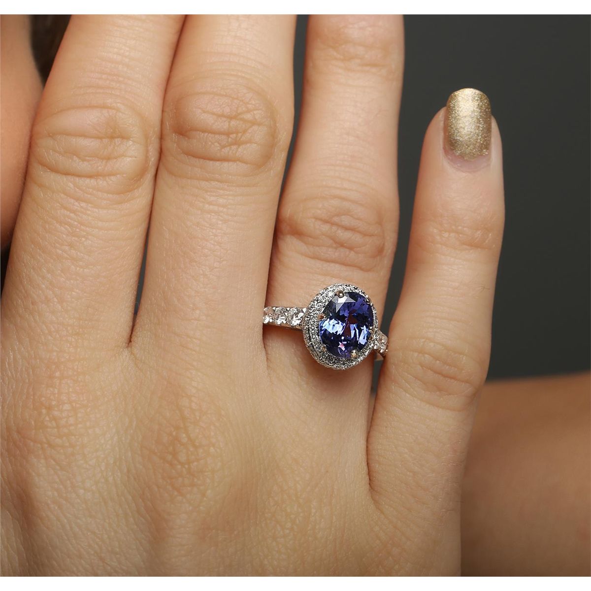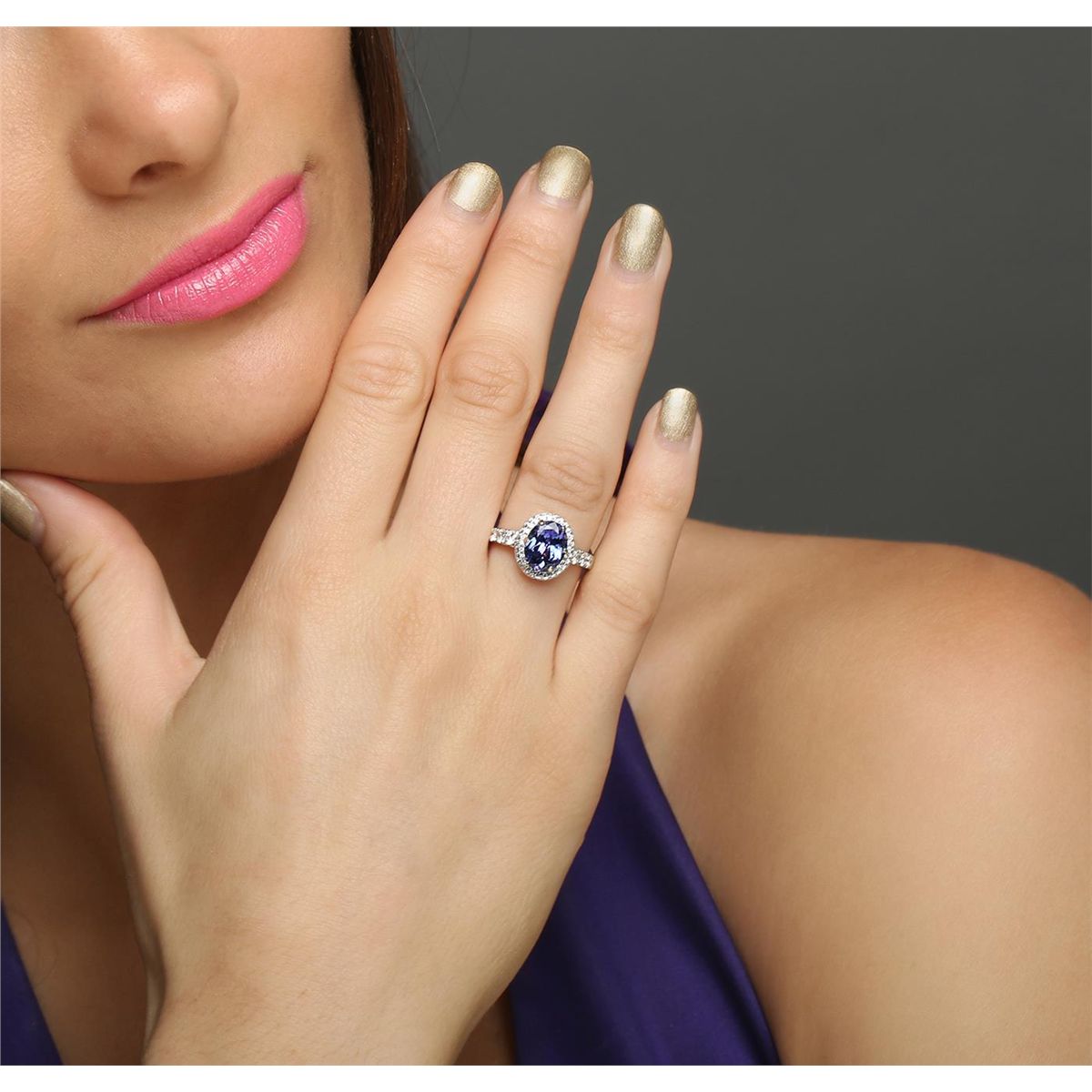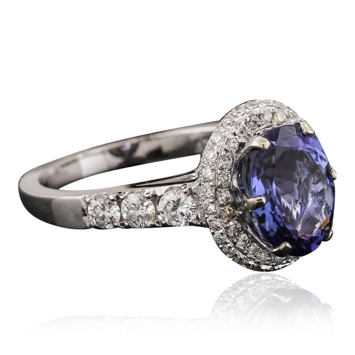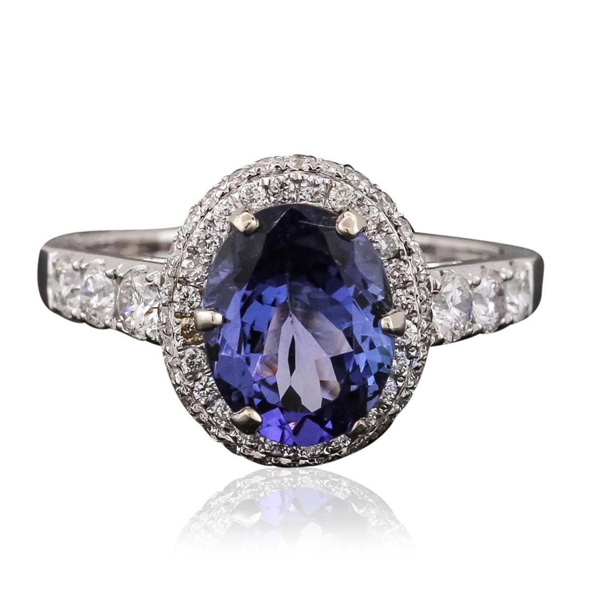 One electronically tested 18KT white gold ladies combination cast & assembled engagement ring with a bright polish finish. Identified with markings of "18K". Condition is new. Containing: One prong set oval modified brilliant cut natural tanzanite, measuring 9.50 x 7.50 x 4.88mm, approximate weight of 2.36ct., clarity is eye clean, type I, medium, moderately strong, violetish blue color, (GIA vB 5/4), cut is good. Six prong set round brilliant cut diamonds, measuring 2.60 - 2.60 x 1.56mm (depth est.) approximate total weight of 6 Stones = 0.39ct. Clarity: SI-1. Color: H, Cut is Good. Fifty-Six prong set round brilliant cut diamonds, measuring 1.10 - 1.10 x 0.66mm (depth est.) approximate total weight of 56 Stones = 0.27ct. Clarity: SI-2 to I-1. Color: H - I, Cut is Good. Colored gemstones are presumed to have been subjected to commonly used enhancement processes. All diamonds and colored gemstones are graded in the mounting, unless otherwise stated. Total Weight of Colored Stones 2.36ct. Total Weight of Diamonds 0.66ct. Total Weight of Ring 5.20 grams. GGL Appraised at $8,340.00.