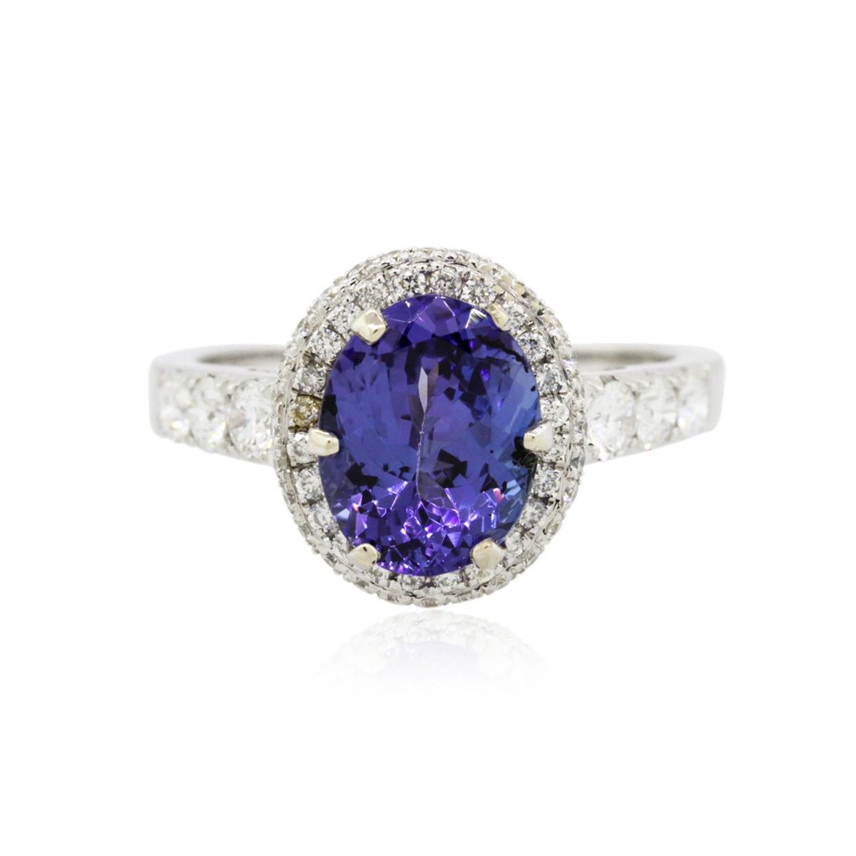 One electronically tested 18KT white gold ladies combination cast & assembled engagement ring with a bright polish finish. Identified with markings of "18K". Condition is new. Containing: One prong set oval modified brilliant cut natural tanzanite, measuring 9.50 x 7.50 x 4.88mm, approximate weight of 2.36ct., clarity is eye clean, type I, medium, moderately strong, violetish blue color, (GIA vB 5/4), cut is good. Six prong set round brilliant cut diamonds, measuring 2.60 - 2.60 x 1.56mm (depth est.) approximate total weight of 6 Stones = 0.39ct. Clarity: SI-1. Color: H, Cut is Good. Fifty-Six prong set round brilliant cut diamonds, measuring 1.10 - 1.10 x 0.66mm (depth est.) approximate total weight of 56 Stones = 0.27ct. Clarity: SI-2 to I-1. Color: H - I, Cut is Good. Colored gemstones are presumed to have been subjected to commonly used enhancement processes. All diamonds and colored gemstones are graded in the mounting, unless otherwise stated. Total Weight of Colored Stones 2.36ct. Total Weight of Diamonds 0.66ct. Total Weight of Ring 5.20 grams. GGL Appraised at $8,340.00.