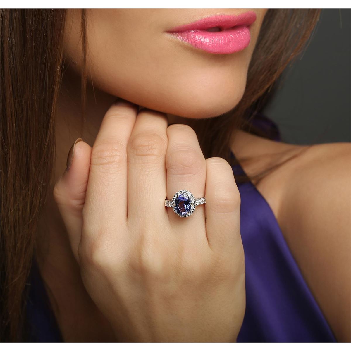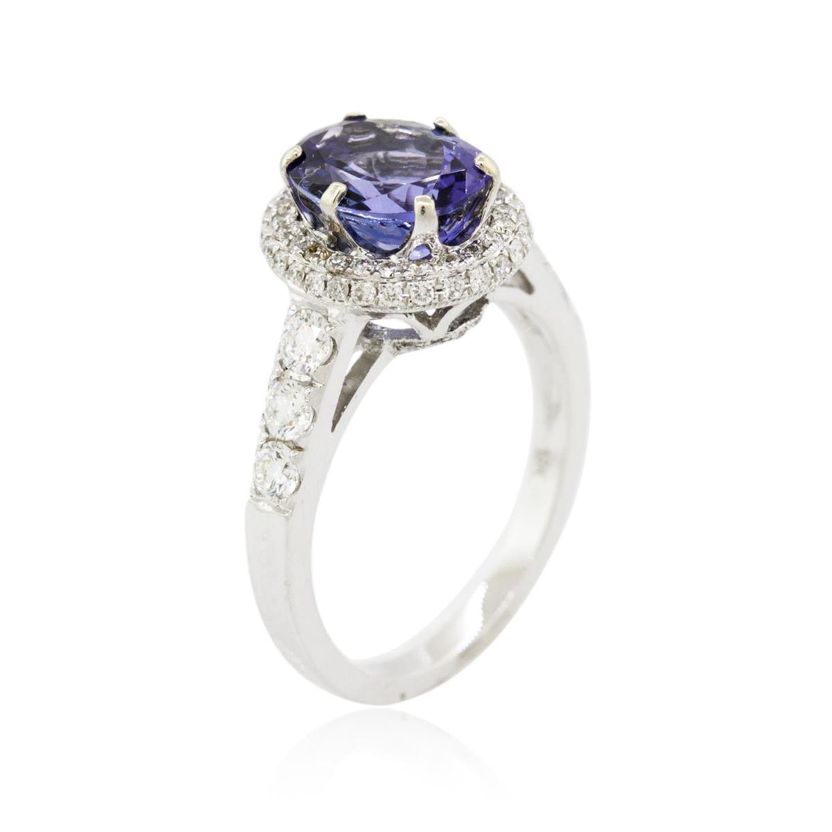 One electronically tested 18KT white gold ladies combination cast & assembled engagement ring with a bright polish finish. Identified with markings of "18K". Condition is new. Containing: One prong set oval modified brilliant cut natural tanzanite, measuring 9.50 x 7.50 x 4.88mm, approximate weight of 2.36ct., clarity is eye clean, type I, medium, moderately strong, violetish blue color, (GIA vB 5/4), cut is good. Six prong set round brilliant cut diamonds, measuring 2.60 - 2.60 x 1.56mm (depth est.) approximate total weight of 6 Stones = 0.39ct. Clarity: SI-1. Color: H, Cut is Good. Fifty-Six prong set round brilliant cut diamonds, measuring 1.10 - 1.10 x 0.66mm (depth est.) approximate total weight of 56 Stones = 0.27ct. Clarity: SI-2 to I-1. Color: H - I, Cut is Good. Colored gemstones are presumed to have been subjected to commonly used enhancement processes. All diamonds and colored gemstones are graded in the mounting, unless otherwise stated. Total Weight of Colored Stones 2.36ct. Total Weight of Diamonds 0.66ct. Total Weight of Ring 5.20 grams. GGL Appraised at $8,340.00.