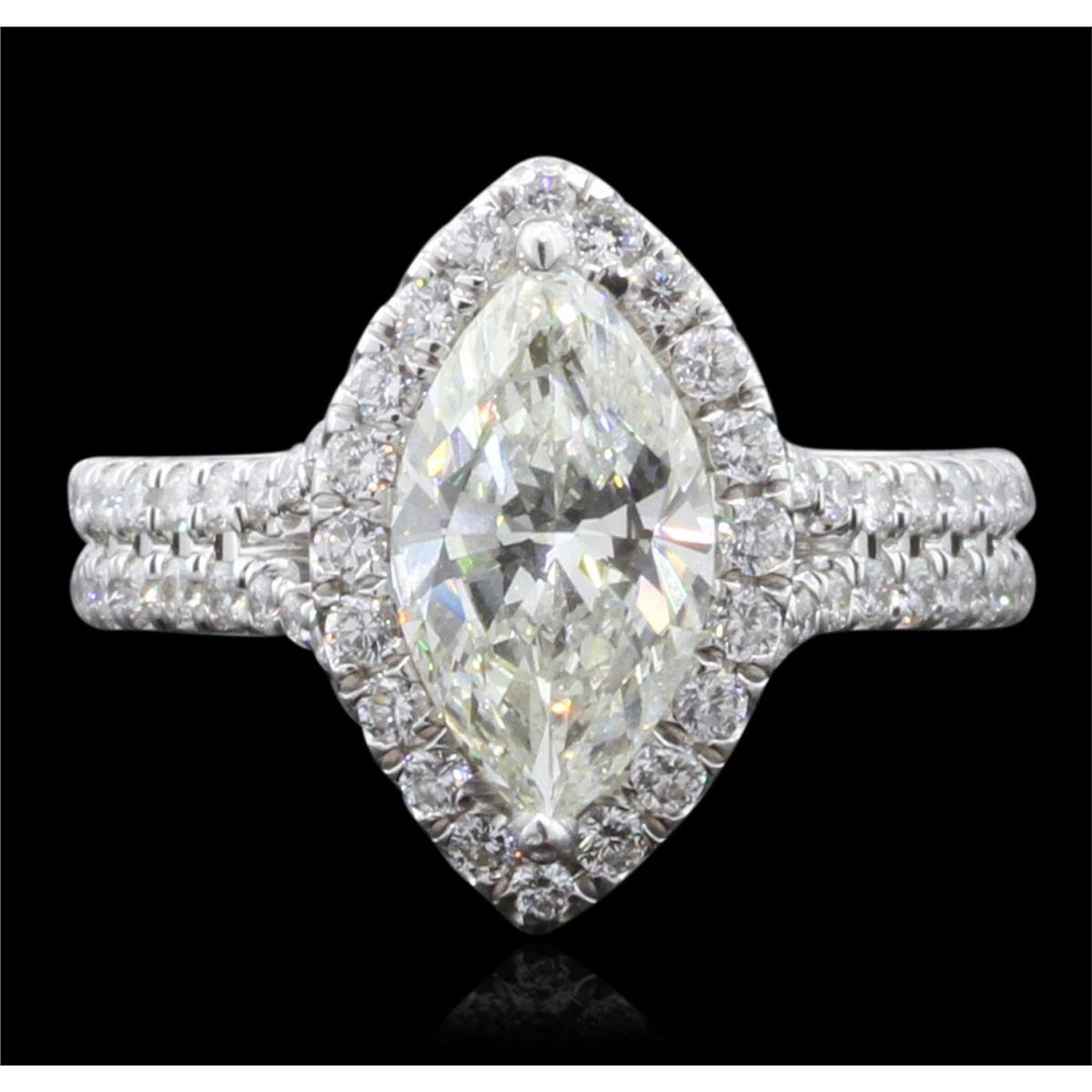 One electronically tested 18KT white gold Ladies combination cast & assembled engagement ring with a bright polish finish. Identified with markings of "18K". Condition is new. Containing: One prong set marquise shaped cut diamond, measuring 12.45 x 6.38 x 3.80mm (depth est.) approximate weight of 1.54ct. Clarity of SI-2, Color of M, Cut is Good. Seventy-Six bead set round brilliant cut diamonds, measuring 1.50 - 1.50 x 0.90mm (depth est.) approximate total weight of 76 Stones = 0.82ct. Clarity of SI-1 to SI-2, Color of G - H, Cut is Very Good. Total Weight of Diamonds 2.36ct. Total Weight of Ring 5.90gm. GGL Appraised at $22,485.00.